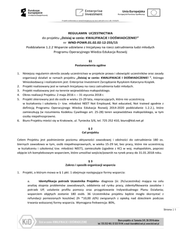 REGULAMIN UCZESTNICTWA do projektu „Dzisiaj w cenie: KWALIFIKACJE I DOŚWIADCZENIE!” nr WND-POWR.01.02.02-12-255/15 Poddziałanie 1.2.2 Wsparcie udzielane z Inicjatywy na rzecz zatrudnienia ludzi młodych Programu Operacyjnego Wiedza Edukacja Rozwój §1 Postanowienia ogólne 1. Niniejszy regulamin określa zasady uczestnictwa w projekcie prawa i obowiązki uczestników oraz zasady organizacji działań w ramach projektu „Dzisiaj w cenie: KWALIFIKACJE I DOŚWIADCZENIE! ”, którego Wnioskodawcą i realizatorem jest: Enterprise Investment Zarządzanie Ryzykiem Katarzyna Książek. 2. Projekt realizowany jest w ramach Inicjatywy na rzecz zatrudnienia ludzi młodych. 3. Projekt realizowany jest na terenie województwa małopolskiego. 4. Okres realizacji Projektu: 2 maja 2016 r. – 31 stycznia 2018 r. 5. Projekt skierowany jest do osób w wieku 15-29 lata, niepracujących, które nie uczestniczą w kształceniu i szkoleniu (– tzw. młodzież NEET Not Employed, Not educated, Not trained zgodnie z definicją Programu Operacyjnego Wiedza Edukacja Rozwój 2014-2020 poddziałanie 1.2.2.), które zamieszkują (w rozumieniu Kodeksu Cywilnego art. 25-28) teren województwa małopolskiego, w tym osoby niepełnosprawne. 6. Biuro Projektu mieści się w Krakowie, ul. Tyniecka 3/6, tel. 725 252 410, [email protected] §2 Cel projektu Celem Projektu jest podniesienie poziomu aktywności zawodowej i zdolności do zatrudnienia 180 os. biernych zawodowo w tym, osób niepełnosprawnych, w wieku 15-29 lat, bez pracy, które nie uczestniczą w kształceniu i szkoleniu( tzw. młodzież NEET), zamieszkałe (zgodnie z KC) w woj. małopolskim, poprzez objęcie ich kompleksowym wsparciem, które umożliwi wejście/powrót na rynek pracy do 31.01.2018 roku. §3 Zakres i sposób organizacji wsparcia 1. Projekt, o którym mowa w § 1 pkt. 1 obejmuje następujące formy wsparcia: a. Identyfikacja potrzeb Uczestnika Projektu- diagnoza (śr. 2h/uczestnika) mająca na celu analizę stopnia problemów zawodowych, oddalenia od rynku pracy, zidentyfikowania zasobów i potrzeb UP, ustalenie profilu pomocy oraz przygotowanie Indywidualnego Planu Działania; wsparciem objętych zostanie 180 osób. 36 Uczestników projektu będzie mogło skorzystać z refundacji poniesionych kosztów( 2h *10,00 zł/h) związanych z opieką nad dzieckiem podczas trwania wskazanej formy wsparcia. Wymagana frekwencja: 80%, Strona | 1 b. indywidualne pośrednictwo pracy (śr. 10 h/uczestnika) spotkania z doradcą zawodowym mające na celu monitorowanie i wspieranie samodzielnej aktywności UP w poszukiwaniu pracy, przedstawienie odpowiednich ofert pracy. 36 Uczestników projektu będzie mogło skorzystać z refundacji poniesionych kosztów( 10h *10,00 zł/h) związanych z opieką nad dzieckiem podczas trwania wskazanej formy wsparcia. Wymagana frekwencja: 80%, c. indywidualne poradnictwo zawodowe ( śr. 5h/uczestnika) mające na celu ustalenie problemu zawodowego, analiza sytuacji zawodowej, pomoc w wyborze sposobu rozwiązania problemu zawodowego, ustalenie form pomocy. 36 Uczestników projektu będzie mogło skorzystać z refundacji poniesionych kosztów( 5h *10,00 zł/h) związanych z opieką nad dzieckiem podczas trwania wskazanej formy wsparcia Wymagana frekwencja: 80%. d. warsztaty Aktywnego Poszukiwania Pracy, mające na celu zdobycie przez uczestników projektu umiejętności poruszania się po rynku pracy. Warsztaty swoim zakresem będą obejmować m.in. następującą tematykę: autoprezentację, poszczególne elementy rozmowy kwalifikacyjnej, przygotowywanie dokumentów aplikacyjnych, metody poszukiwania pracy. Uczestnicy zostaną podzieleni na 18 grup liczących 10 osób każda. Dla każdej z grup przewidziano 20 godzin warsztatów motywacyjnych( 4 dni po 5 godzin). 36 Uczestników projektu będzie mogło skorzystać z refundacji poniesionych kosztów( 20 h *10,00 zł/h) związanych z opieką nad dzieckiem podczas trwania wskazanej formy wsparcia Wymagana frekwencja: 80%. e. warsztaty motywacyjne: Podczas warsztatów uczestnicy projektu poznają zagadnienia z zakresu: integracji, poznawania siebie, budowania poczucia własnej wartości, komunikacji interpersonalnej, autoprezentacji, motywowania do zmiany. Uczestnicy zostaną podzieleni na 18 grup liczących 10 osób każda. Dla każdej z grup przewidziano 20 godzin warsztatów motywacyjnych( 4 dni po 5 godzin). 36 Uczestników projektu będzie mogło skorzystać z refundacji poniesionych kosztów( 20 h *10,00 zł/h) związanych z opieką nad dzieckiem podczas trwania wskazanej formy wsparcia Wymagana frekwencja: 80%. f) certyfikowane szkolenia zawodowe: Przykładowa tematyka szkoleń: 2. 3. 4. 5. „Pracownik kancelaryjny”, „Kierowca ciągnika siodłowego”, „Spawacz metodą TIG”, „Asystent nauczyciela przedszkola” Szkolenia mają na celu służyć nabyciu kompetencji i kwalifikacji wynikających z potrzeb pracodawców. Uczestnikom projektu, którzy nie posiadają kompetencji do odbycia ww. szkoleń, zostanie zaproponowany wybór szkolenia zgodny z ich predyspozycjami i kompetencjami. Zakłada się, że z tej formy wsparcia skorzysta 100 osób, średni czas trwania szkolenia to 150h/os. Uczestnicy otrzymają stypendium szkoleniowe w kwocie: 1278,57 zł brutto i zwrot kosztów dojazdu, (jeżeli miejsce realizacji wsparcia będzie inne niż miejsce zamieszkania) oraz pokrycie kosztów Strona | 2 niezbędnych badań lekarskich. Szkolenia zakończą się egzaminem i uzyskaniem certyfikatu potwierdzającego uzyskane kompetencje i kwalifikacje. 24 Uczestników projektu będzie mogło skorzystać z refundacji poniesionych kosztów związanych z opieką nad dzieckiem podczas trwania wskazanej formy wsparcia Wymagana frekwencja: 80% na zajęciach, 100% na egzaminie, bony szkoleniowe- średnio 3854,88 zł na osobę. Uczestnik projektu wskaże interesującą go tematykę szkolenia. Forma ta jest związana z czynnym udziałem UP. Uczestnicy Projektu otrzymają stypendium szkol