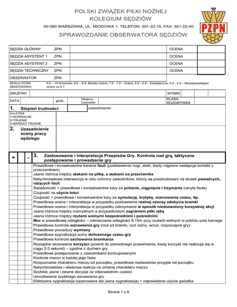 POLSKI ZWIĄZEK PIŁKI NOŻNEJ KOLEGIUM SĘDZIÓW 00-080 WARSZAWA, UL. MIODOWA 1, TELEFON: 551-22-15, FAX: 551-22-40 SPRAWOZDANIE OBSERWATORA SĘDZIÓW SĘDZIA GŁÓWNY ZPN OCENA SĘDZIA ASYSTENT 1 ZPN OCENA SĘDZIA ASYSTENT 2 ZPN OCENA SĘDZIA TECHNICZNY ZPN OCENA OBSERWATOR ZPN 9.0 – 10 Wzorowe; 8.0 – 8.9- Bardzo dobre; 7.0 - 7.9 – Dobre; 6.0 - 6.9 – Dostateczne; 5.0 - 5.9 – Niezadowalające oceny co 0.1 SKALA OCEN SĘDZIOWANIA: DRUŻYNY WYNIKI DATA 1. godz. Stopień trudności: KLASA ROZGRYWEK Miejsce zawodów uzasadnienie: 0=ŁATWE 1=NORMALNE 2=TRUDNE 3=BARDZO TRUDNE 2. + Uzasadnienie oceny pracy sędziego - 3. Zastosowanie i interpretacja Przepisów Gry. Kontrola nad grą, taktyczne postępowanie i prowadzenie gry Prawidłowe i konsekwentne karanie fauli (podstawienie nogi, ataki, kiedy najpierw następuje kontakt z przeciwnikiem) Jasna różnica między atakami na piłkę, a atakami na przeciwnika Natychmiastowa interwencja w celu ochrony zawodników, którzy są poszkodowani na skutek poważnych, rażących fauli Świadomość + prawidłowe i konsekwentne kary za pchanie, ciągnięcie i trzymanie (ukryte faule) Czujność na użycie łokci Czujność + prawidłowe i konsekwentne kary za symulację, krytykę, marnowanie czasu, itp. Prawidłowa ocena i interpretacja w przypadku pozbawienia realnej szansy zdobycia bramki Prawidłowa ocena i interpretacja w przypadku zatrzymania w sposób niedozwolony korzystnej akcji Jasna różnica między rozmyślnym a przypadkowym zagraniem piłki ręką Jasna różnica między rzutami wolnymi bezpośrednimi i pośrednimi Mur w prawidłowej odległości – odmierzanie odległości 9,15m przy rzutach wolnych w pobliżu pola karnego Prawidłowa kontrola wznowienia gry (rzut od bramki, rzut rożny, wrzut, rozpoczęcie gry) Prawidłowe procedury wymiany Prawidłowa sygnalizacja sumy doliczonego czasu gry Prawidłowa kontrola zachowania bramkarza Rozsądne stosowanie korzyści (powrót do pierwotnego przewinienia, kiedy korzyść nie realizuje się w ciągu 2-3 sekund) – zgodne z duchem gry Prawidłowe postępowanie z zawodnikami kontuzjowanymi Kontrola meczu w każdej jego fazie Rozpoznanie charakteru meczu od początku, prawidłowe nastawienie przyjęte od początku Natychmiastowa i właściwa reakcja na zmianę charakteru meczu Szybkie, jasne i pewne decyzje (w odpowiednim czasie) Umożliwianie szybkiego wznawiania gry Efektywna sygnalizacja (opanowana ale jasna sygnalizacja) + odpowiednie użycie gwizdka Strona 1 z 6 + - 4. Kontrola dyscyplinarna oraz zarządzanie zawodnikami i osobami upoważnionymi do przebywania na ławce rezerwowych (strefa techniczna) Właściwe kary dyscyplinarne Konsekwencja i przewidywanie w pokazywaniu kartek; jasna linia od początku ( nie pokazywanie kartek za wcześnie za mało ważne przewinienia) Żółta kartka za trzymanie, kiedy zatrzymany zostaje korzystny atak (=niesportowe zachowanie) – rozpoznanie ukrytych, podstępnych fauli Kara dyscyplinarna (żółta kartka) za niesportowe zachowanie (odkopywanie piłki, krytyka, powtarzane pretensje aby przeciwnikowi pokazać kartkę, itp.) Czerwona kartka za ataki zagrażające zdrowiu przeciwnika Żółta kartka za przerwanie korzystnej akcji Czerwona kartka za pozbawienie realnej szansy zdobycia bramki – odwaga kiedy czerwona kartka + karny Kartki pokazywane z opanowaniem i jasno, oraz jednoznaczna identyfikacja zawodnika ukaranego Ograniczona dyskusja z zawodnikami i gesty w kierunku zawodników (po decyzji) Brak tolerancji w stosunku do zawodników czynnie znieważających sędziego Właściwe i rozumne zachowanie w stosunku do trenerów udzielających wskazówek zawodnikom i zachowujących się prawidłowo Reakcja na poniżające gesty, ironiczne klaskanie ze strony trenerów + - 5. Osobowość sędziego Posiadał szacunek, akceptację i uznanie ze strony uczestników (zawodnicy, osoby towarzyszące drużynom), wymagana osobowość na polu gry – naturalny autorytet Asertywny i sprawiający bardzo dobre wizualne wrażenie Konsekwentny i nie ulegający wpływom innym (zawodników, osób siedzących na ławkach rezerwowych, kibiców, itp.) – zawsze podejmujący obiektywne decyzje Konsekwentny, nawet gdy krytyka jest nieunikniona Stanowczy, zdecydowany, pewny siebie i swoich praw Stanowczy, odważny, nie bojący się podejmować niepopularne decyzje Opanowany, przewidujący, nie eksponował własnej osoby + - 6. Kondycja fizyczna/ustawianie i poruszanie po boisku, styl biegu Sportowa sylwetka, dobry styl biegu, dobra kondycja do końcowego gwizdka Dobra wytrzymałość, bieganie długich dystansów np. przy kontratakach Stosowanie sprintów, nawet pod koniec meczu (szybkie kontrataki) Podbieganie do miejsca przewinienia aby zapobiec ryzyku odwetu lub protestu Umiejętne stosowanie biegu tyłem, aby mieć przegląd wszystkiego Przebywanie w optymalnej odległości, śledzenie gry przez cały czas, nie przeszkadzając w grze (nie uderzony piłką) Elastyczna diagonalna, obserwacja gry z boku lub pod kątem, aby zobaczyć ukryte przewinienia (trzymanie, pchanie) Elastyczna diagonalna: piłka i gra zawsze pomiędzy sędzią i sędzią asystentem Wbieganie w pole karne, kiedy jest to konieczne Prawidłowe ustawienie podczas stałych fragmentów gry (rzuty wolne, rzuty rożne, rzuty karne) Umiejętność przewidywania tego co może się zdarzyć (czytanie gry), unikanie niepotrzebnego biegania + - 7. Współpraca z sędziami asystentami i sędzią technicznym Rozpoznanie i natychmiastowa reakcja na wszystkie wskazania asystentów Dobry kontakt wzrokowy z sędziami asystentami mimo używania sygnalizacji „bip” Dobry podział kompetencji pomiędzy zespół sędziowski (faule w pobliżu sędziego asystenta) Prawidłowe podziękowanie za sygnalizacje sędziego asystenta bez przerywania gry (korzyść, zbyt szybka sygnalizacja spalonego, itp.) i zasygnalizowanie, że widział podniesioną chorągiewkę Brak sprzecznych decyzji z sędziami asystentami (rzut 