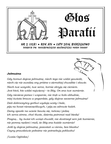 Głos Parafii NR 2 (158 ) ROK XIV LUTY 2 016 BI ERZGŁOWO P A RA F I A P W . W N I E BO W Z I Ę CI A N A JŚ W I Ę TS Z E J M A RY I P A N N Y Jałmużna Gdy komuś dajesz jałmużnę, niech tego nie widzi gawiedź, niech cię nie zwodzą sny próżne o ziemskiej chwalbie i sławie. Niech twe uczynki, twe serce, kornie okryją się cieniem. Jest ktoś, kto widzi najwięcej – to Bóg, On zna twe sumienie. Gdy niesiesz pomoc i wsparcie, nie trąb w koło obłudnie, miej świata brawa w pogardzie, gdy dajesz szczerze jałmużnę! Dziś dobroczyńcy gorliwi wydają uczty i bale, piją na koszt nieszczęśliwych, i piją za zdrowie kalek. Damy opasłe na uczcie bawią się, tańczą i jedzą ich serca zimne, choć tłuste, dzierżą patronat nad biedą! Pragną... by świat ich wciąż chwalił, nie dostrzegł serc jak kamienie, nie pomną nędzni i mali, że Bóg zna każde sumienie! Jeśli ty dajesz jałmużnę, pozostań w cieniu, bez blasku! Czyny prawdziwie pobożne nie potrzebują poklasku! /Lusia Ogińska/ – LUTOWE KALENDARIUM – 2 lutego 3 lutego 4 lutego 5 lutego 6 lutego 7 lutego 9 lutego 10 lutego 11 lutego 12 lutego 14 lutego 15 lutego 19 lutego 21 lutego 23 lutego 24 lutego 25 lutego 26 lutego 28 lutego Święto Ofiarowania Pańskiego (w tradycji polskiej Matki Boskiej Gromnicznej) – XX Światowy Dzień Życia Konsekrowanego Wspomnienie św. Ansgara, biskupa i misjonarza oraz św. Błażeja, biskupa i męczennika – Po Mszy św. błogosławieństwo św. Błażeja z modlitwą o zdrowie gardła – Międzynarodowy Dzień Walki z Rakiem Tłusty Czwartek Wspomnienie św. Agaty, dziewicy i męczennicy, patronki ochrony przed pożarami i wypadkami związanymi z ogniem – Pierwszy piątek miesiąca – Księża odwiedzają chorych w naszej parafii – Wieczorna adoracja w kościele (g. 17.30-18.30) prowadzona przez Ekipy Notre Dame Ostatnia sobota karnawału V Niedziela Zwykła 66. rocznica śmierci ks. bp Adolfa Szelążka – Ostatki – Dzień Bezpiecznego Internetu Środa Popielcowa – Wspomnienie św. Scholastyki, dziewicy, patronki ochrony przed burzami i huraganami Wspomnienie NMP z Lourdes – Światowy Dzień Chorego – Msza św. o godz. 10.00 z sakramentem namaszczeniem chorych, po niej poczęstunek w Centrum Kultury w Łubiance Droga Krzyżowa I Niedziela Wielkiego Postu – Wspomnienie św. Cyryla i Metodego, patronów Europy – Wspomnienie św. Walentego, patrona zakochanych Wspomnienie bł. Michała Sopoćko, prezbitera, spowiednika św. Faustyny Droga Krzyżowa II Niedziela Wielkiego Postu – Dzień modlitwy, postu i solidarności z misjonarzami – Ogólnopolska zbiórka pieniężna na rzecz dzieła pomocy misjonarzom Ad Gentes – Rozpoczęcie rekolekcji wielkopostnych – Międzynarodowy Dzień Języka Ojczystego Wspomnienie św. Polikarpa ze Smyrny, biskupa i męczennika – 71. rocznica śmierci bł. ks. Stefana Wincentego Frelichowskiego, patrona harcerzy – Ogólnopolski Dzień Walki z Depresją Zakończenie rekolekcji wielkopostnych Wspomnienie św. Cezarego z Nazjanzu, patrona lekarzy Droga Krzyżowa III Niedziela Wielkiego Postu – Wspomnienie św. Hilarego I, papieża Elżbieta Giersz -2– – Z ŻYCIA PARAFII – WIARA JEST SOLĄ ŻYCIA KOLĘDA 2016 – PODSUMOWANIE Po skończonej modlitwie i udzieleniu błogosławieństwa siadam w fotelu. Otacza mnie zapach świeżości, klimat odświętności. Różnobarwne światełka migają na choince. Na stole duża misa pełna swojskich pierników. Wokół stołu, obok mnie, zasiada rodzina. Wszyscy są, w komplecie. Snuję opowieść o wierze, która jest jak sól, nadaje życiu prawdziwy smak. Wiara to bogactwo. Dzięki niej otrzymuję gotowy projekt życia. Wiem skąd przychodzę i dokąd zmierzam. Miłość Boga stoi na progu mego życia, który zrodzony zostałem z miłości. Ta sama miłość czeka u kresu, w dzień mojej śmierci, gdy mam wpaść w rozwarte ramiona Boga – Miłości. Wyposażony na drogę życia, karmiony miłością – sakramentami, idę przez czas życia, przez kolejne godziny, dni i miesiące. Jestem pielgrzymem, odczuwam oddech miłości na swoim policzku. Czasami bywam kuszony przez iluzje, pokusy i grzech, który stroi się w piórka miłości, który miłość udaje. Wiara kształtuje we mnie świadomość, że życie jest czymś wyjątkowym, że uczestniczę w czymś wyjątkowym, że sam jestem kimś niepowtarzalnym i jedynym. Zatrzymałem opowieść na chwilę. Czy moja myśl nie szybuje zbyt wysoko, ponad głowami słuchaczy, myślę. Spoglądam na zamyślone twarze. Powracam do opowieści. Nie mogę zatrzymać się wpół słowa. Muszę pozwolić wyrwać się z uwięzi ważnym słowom, muszę im pozwolić wybrzmieć w tym domu. Może przysiądą na skraju serca, przycupną i w odpowiedniej chwili zostaną wpuszczone, zaproszone w głąb serca. Wystarczy, że gospodarz uchyli rąbek, doświadczy bliskości i pokoju. Wiem, że tęskni za Bożym pokojem. Ja też tęsknię. Gdy gotujesz zupę na obiad – kontynuuję – możesz użyć najlepszych i najdroższych produktów, a zapomnisz o soli, zupa jest do niczego, jest do poprawy. Podobnie życie bez wiary! Wiara jest solą życia. Prawie szepczę, pełen przejęcia: „Oto stoję u drzwi i kołaczę: jeśli kto posłyszy mój głos i drzwi otworzy, wejdę do niego i będę z nim wieczerzał, a on ze Mną” (Ap 3,20). Jezus jest blisko. Możesz Go zaprosić wyznając i praktykując wiarę. Chrześcijanin „smak swojego życia” zawdzięcza Jezusowi. Jako podsumowanie cytuję ważne, jak mi się zdaje słowa: „Bez miłości człowiek nie ma ani od czego odejść, ani dokąd pójść”. -3– Miłość powoduje, że nie jesteśmy bezdomnymi na tym świecie. Bóg, wiara Bogu i Jego miłość nadaje najgłębszy sens życiu. Wędruję dalej. Wkraczam do domu osoby, której nie widuję w kościele na niedzielnych Mszach św. Prawdę mówiąc nie zauważyłem nigdy. Kolędę przyjmuje co roku. Myślę, z jednej strony