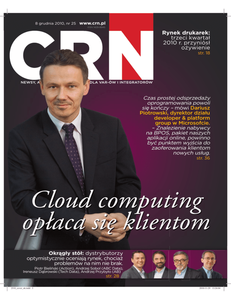 8 grudnia 2010, nr 25 www.crn.pl ISSN 1429-8945 Rynek drukarek: trzeci kwartał 2010 r. przyniósł ożywienie str. 18 NEWSY, ANALIZY I PERSPEKTYWY DLA VAR-ÓW I INTEGRATORÓW Czas prostej odsprzedaży oprogramowania powoli się kończy – mówi Dariusz Piotrowski, dyrektor działu developer & platform group w Microsofcie. – Znalezienie nabywcy na BPOS, pakiet naszych aplikacji online, powinno być punktem wyjścia do zaoferowania klientom nowych usług. str. 36 Cloud computing opłaca się klientom Okrągły stół: dystrybutorzy optymistycznie oceniają rynek, chociaż problemów na nim nie brak. Piotr Bieliński (Action), Andrzej Sobol (ABC Data), Ireneusz Dąbrowski (Tech Data), Andrzej Przybyło (AB) str. 28 2510_cover_ok.indd 3 2010-11-29 13:26:04 1-1 CRN.indd 1 11/26/10 5:05 PM 3 www.crn.pl Miejsce w chmurze Nikomu nie trzeba przypominać, że cloud computing to dzisiaj temat numer jeden w branży IT. Nie będzie żadnej przesady w stwierdzeniu, że wkrótce, gdy zajrzymy do lodówki, natkniemy się na chmurę. Oczywiście w przenośni, ale nie tak znów wielkiej. Istnieją już lodówki, które informują właścicieli o stanie zapasów. Ba, samodzielnie zamawiają brakujące produkty spożywcze za pośrednictwem Internetu. Dowodzi to, jak bardzo zmienił się sposób podejścia do sieci WWW. Podłączane są do niej nie tylko pecety, ale nawet urządzenia tak dalece niekojarzące się do tej pory z informatyką, jak chłodziarka. Według przedstawicieli Microsoftu, który mocno angażuje się w propagowanie idei cloud computingu, rozwój tego trendu oznacza, że sposób sprzedaży produktów IT zostanie zrewolucjonizowany. Użytkownicy będą nabywać nie komputery i oprogramowanie, lecz usługi w ramach abonamentu. Jak teraz kupuje się prąd i wodę, w przyszłości będziemy płacić rachunki za korzystanie np. z wybranych aplikacji i programów dostarczanych przez Internet. Firma 1&1, która kilka miesięcy temu zaczęła oferować w Polsce darmowy pakiet usług hostingowych, planuje też sprzedaż narzędzi software’owych oraz wirtualnych serwerów, którymi użytkownik będzie mógł zdalnie zarządzać w ramach miesięcznej opłaty. Niemieckie przedsiębiorstwo twierdzi, że nie jest już po prostu dostawcą usług hostingowych, lecz specjalistą od cloud computingu. Ile w tym marketingu, a na ile jest to rzeczywiście znak naszych czasów? Niektórzy przypominają, że rozwiązania oparte na chmurze to żadna nowość… Co z tym fantem mają zrobić resellerzy? Producenci przekonują, że nowy trend jest szansą nawet dla małych firm, które mogą opracować własne usługi wpisane w chmurę. Tymczasem amerykański CRN donosi, powołując się na badania firmy Forrester, że cloud może wyeliminować z rynku 12 − 15 proc. resellerów w ciągu pięciu lat. Pośrednicy przestaną być potrzebni, bo klienci będą kupować usługi u vendorów. Nie wiadomo, czy te prognozy się sprawdzą. Nie ulega jednak wątpliwości, że wiele firm będzie musiało na nowo szukać swojego miejsca. W numerze 14 18 26 18 28 34 36 Liczą się kompenencje Microsoft zmienia program partnerski Klienci chcą kupować drożej Rynek urządzeń drukujących Prowizje i leasing Ever wprowadza program partnerski Poszukiwane lustrzanki i aparaty Canona Badanie Skąpiec.pl dla CRN Polska O nudzie nie ma mowy Okrągły stół CRN Polska: rynek okiem dystrybutorów GPON: pieśń przyszłości Integratorzy z Czech, Łotwy i Słowacji o rynku TriplePlay Azure bez barier Cloud computing według Microsoftu Indeks firm AB ........ 4, 13, 20, 28, 32 ABC Data ...................... 6, 28, 31 Acer .........................16 Action ......4, 28, 30 Alstor .......................4 APC ..........................16 Asbis .......................10 Asseco ...................16 Assmann ..............13 Asus ....................4, 16 Auto ID ................34 AVG ..........................16 Avnet ......................12 BenQ ........................4 Brother ................20 Canon ...................20 Data Center Software ...............16 Digitus ....................13 D-Link ................6, 13 DroidSecurity ....16 Epson ...........20, 24 Ever .........................26 eXtremeMem ....10 FarStone ................4 Forcetop ...............12 G Data Software ................4 Gigabyte .................6 HP .........6, 10, 18, 22 Humansoft ..........12 IBM ......................6, 13 Impakt ....................12 Juniper ..............6, 17 Kingston ...............13 Leadtek ...................6 Lexmark ......20, 24 LG ..............................13 Microsoft ...............10, 14, 36-38 NEC ............................6 Netgear ...................6 NTT System .......16 OKI ...................18, 24 Panasonic ............10 Panda .....................10 Praxis ......................15 Ricoh ......................24 RRC ...................17, 24 Samsung ..............16 Sony ........................12 Swiftpoint ............12 Synology ..............10 Tech Data ....28, 29 Techmex ................4 Toshiba ..................16 Trust ..........................4 Vobis ......................24 Wilk Electronik .............12 Indeks reklam 1&1 Internet ....7, 8-9 AB ............................25 Action .......................2 ClickOne ..............35 Core .........................12 IBM ...........................13 COMPUTER RESELLER NEWS POLSKA Rok 12, numer 25 (326), 8 grudnia 2010 PL ISSN 1429-8945 © Burda Communications sp. z o.o. REDAKCJA: 00-342 Warszawa, ul. Topiel 23 tel. (22) 320-19-00, tel./faks (22) 320-19-01 e-mail: [email protected], www.CRN.pl REDAKTOR NACZELNY: Michał Adamczyk ma [email protected], tel. 320-19-00 REDAKCJA: Anna Suchta as (zastępca red. nacz.) [email protected], tel. 320-19-41 Dorota Gutkowska dg (sekretarz redakcji) [email protected], tel. 320-19-32 Karolina Marszałek km [email protected], tel. 320-19-55 Urszula Smoktunowicz us [email protected], tel. 320-19-45 2510_ed