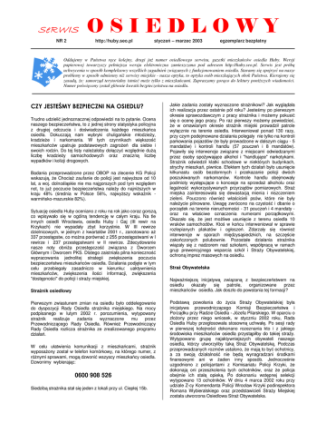 NR 2 http://huby.seo.pl stycze – marzec 2003 egzemplarz bezpłatny Oddajemy w Pa stwa r ce kolejny, drugi ju numer osiedlowego serwisu, gazetki mieszka ców osiedla Huby. Wersji papierowej towarzyszy pełniejsza wersja elektroniczna zamieszczana pod adresem http://huby.seo.pl. Serwis jest prób uchwycenia w sposób kompleksowy wszelkich zagadnie zwi zanych z funkcjonowaniem osiedla. Staramy si spojrze na nasze problemy w sposób odmienny ni serwisy miejskie - nasza optyka, to optyka osób mieszkaj cych obok Pa stwa. Kierujemy si zasad , e: samorz d terytorialny istnie mo e tylko z mieszka cami. Zapraszamy gor co do lektury poni szych wiadomo ci. Numer po wi cony został głównie kwestii bezpiecze stwa na osiedlu. Trudno udzieli jednoznacznej odpowiedzi na to pytanie. Ocena naszego bezpiecze stwa, to z jednej strony statystyka policyjna z drugiej odczucia i do wiadczenia ka dego mieszka ca osiedla. Dokuczaj nam wybryki chuliga skie młodzie y, kradzie e i narkomania. W tych czynnikach wi kszo mieszka ców upatruje podstawowych zagro e dla siebie i swoich rodzin. Do tej listy nale ałoby doł czy wzgl dnie du liczb kradzie y samochodowych oraz znaczn liczb wypadków i kolizji drogowych. Badania przeprowadzone przez OBOP na zlecenie KG Policji wskazuj , e Chocia zaufanie do policji jest najwy sze od 10 lat, a woj. dolno l skie nie ma najgorszych pod tym wzgl dem not, to ju poczucie bezpiecze stwa nale y do najni szych w kraju 48% ( rednia w Polsce 56%, najwy szy wska nik warmi sko-mazurskie 82%). Sytuacj osiedla Huby oceniano z roku na rok jako coraz gorsz , co wpisywało si w ogóln tendencj w całym kraju. Na tle innych osiedli Wrocławia, osiedla Huby i Gaj (III rewir na Krzykach) nie wypadały zbyt korzystnie. W III rewirze dzielnicowych, w jednym z kwartałów 2001 r., zanotowano a 337 przest pstw, co mo na porówna z 255 przest pstwami w I rewirze i 237 przest pstwami w II rewirze. Zdecydowanie nasze noty obni a przest pczo zwi zana z Dworcem Głównym i Dworcem PKS. Dlatego zaistniała pilna konieczno wypracowania jednolitej strategii zwi kszenia poczucia bezpiecze stwa mieszka ców osiedla. Działania podj te w tym celu przebiegały zasadniczo w kierunku: uaktywnienia mieszka ców, zwi kszenia ilo ci informacji, zwi kszenia "dost pno ci" do policji i stra y miejskiej. Stra nik osiedlowy Pierwszym zwiastunem zmian na osiedlu było oddelegowanie do dyspozycji Rady Osiedla stra nika miejskiego. Na mocy podpisanego w lutym 2002 r. porozumienia, wytypowany stra nik realizuje zadania wyznaczone mu przez Przewodnicz cego Rady Osiedla. Równie Przewodnicz cy Rady Osiedla rozlicza stra nika ze zrealizowanego programu działa . W celu ułatwienia komunikacji z mieszka cami, stra nik wyposa ony został w telefon komórkowy, na którego numer, z ró nymi sprawami, mog dzwoni wszyscy mieszka cy osiedla. Dzwonimy wybieraj c: 0600 908 526 Siedzib stra nika stał si jeden z lokali przy ul. Ciepłej 15b. Jakie zadania zostały wyznaczone stra nikowi? Jak wygl dała ich realizacja przez ostatnie pół roku? Jeste my po pierwszym okresie sprawozdawczym z pracy stra nika i mo emy pokusi si o ocen jego pracy. Po raz pierwszy mo emy powiedzie , e w omawianym okresie stra nik miejski prowadził patrole wył cznie na terenie osiedla. Interweniował ponad 130 razy, przy czym podejmowane działania polegały nie tylko na kontroli parkowania pojazdów (te były prowadzone w dalszym ci gu - 5 mandatów) i kontroli handlu (57 poucze i 8 mandatów). Pojawiły si interwencje zwi zane z miejscami odwiedzanymi przez osoby spo ywaj ce alkohol i "handluj ce" narkotykami. Stra nik odwiedził klatki schodowe w niektórych budynkach, strychy mieszka , piwnice. Efektem tych działa było usuni cie kilkunastu osób bezdomnych i przekazanie policji dwóch poszukiwanych narkomanów. Kontrole handlu obejmowały podmioty wyst puj ce o koncesje na sprzeda alkoholu oraz legalno wykorzystywanych przyrz dów pomiarowych. Stra miejska zainteresowała si dewastacj mienia i niszczeniem zieleni. Pouczono równie wła cicieli psów, które nie były nale ycie pilnowane. Uwag zwrócono na czysto i dbanie o porz dek na terenie nieruchomo ci - 31 poucze i 4 mandaty oraz na wła ciwe oznaczenia numerami porz dkowymi. Okazało si , e jest mo liwe usuni cie z terenu osiedla 10 wraków samochodów. Kto w ko cu interweniował w sprawie rozlepianych plakatów i ogłosze . Zdarzały si równie interwencje w sporach mi dzys siedzkich, na szcz cie zako czonych polubownie. Pozostałe działania stra nika wi zały si z nadzorem nad szkołami, współprac w ramach grup prewencyjnego wsparcia szkół i Stra y Obywatelskiej, ochron imprez masowych na osiedlu. Stra Obywatelska Najwa niejsz inicjatyw zwi zan z bezpiecze stwem na osiedlu okazały si patrole, organizowane przez mieszka ców osiedla. Jak doszło do powstania tej formacji? Podstaw powołania do ycia Stra y Obywatelskiej była inicjatywa przewodnicz cego Komisji Bezpiecze stwa i Porz dku przy Radzie Osiedla - Józefa Pilarskiego. W oparciu o zło ony przez niego wniosek, w styczniu 2002 roku, Rada Osiedla Huby przegłosowała stosown uchwał . Po sesji rady w pierwszej kolejno ci dokonano rozeznania kto i z jakiego rodowiska mieszka ców osiedla przyst piłby do takiej stra y. Wytypowano grup najaktywniejszych obywateli naszego osiedla, którzy utworzyliby tak Stra Obywatelsk . Podczas przeprowadzanych rozmów ustalono, e maj to by ochotnicy, a za swoj działalno nie b d wynagradzani rodkami finansowymi ani w aden inny sposób. Jednocze nie uzgodniono z policjantami z Komisariatu Policji Krzyki, e dokonaj oni przeszkolenia tych ochotników, oraz e policja obejmie ich stał opiek . Po dokonaniu wst pnej selekcji wytypowano 13 ochotników. W dniu 4 marca 2002 roku przy udziale Z-cy Komendanta Policji Wrocław Krzyki podinspektora Romana Wybieralskiego oraz przedstawicieli Stra y Miejskiej została utworzona Osiedlowa Stra Obywatelska. Pierwsze spotkanie powołanej Stra y Obywatelskiej odby