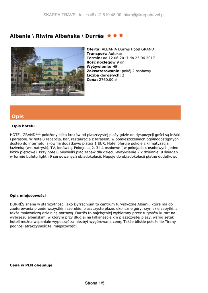 SKARPA TRAVEL tel. +(48) 12 619 48 00, [email protected] Albania \ Riwira Albańska \ Durrës Oferta: ALBANIA Durrës Hotel GRAND Transport: Autokar Termin: od 12.06.2017 do 23.06.2017 Ilość noclegów 9 dni Wyżywienie: HB Zakwaterowanie: pokój 2 osobowy Liczba dorosłych: 2 Cena: 2760,00 zł Opis Opis hotelu HOTEL GRAND*** położony kilka kroków od piaszczystej plaży gdzie do dyspozycji gości są leżaki i parasole. W hotelu recepcja, bar, restauracja z tarasem, w pomieszczeniach ogólnodostępnych dostęp do internetu, siłownia dodatkowo płatna 1 EUR. Hotel oferuje pokoje z klimatyzacją, łazienką (wc, natrysk), TV, lodówką. Pokoje są 2, 3 i 4 osobowe ( w pokojach 4 osobowych jedno łóżko piętrowe). Przy hotelu niewielki plac zabaw dla dzieci. Wyżywienie 2 x dziennie: 9 śniadań w formie bufetu light i 9 serwowanych obiadokolacji. Napoje do obiadokolacji płatne dodatkowo. Opis miejscowości DURRËS znane w starożytności jako Dyrrachium to centrum turystyczne Albanii, które ma do zaoferowania przede wszystkim szerokie, piaszczyste plaże, okoliczne góry, rzymskie zabytki, a także malowniczą dzielnicę portową. Durrës to najchętniej wybierany przez turystów kurort na wybrzeżu albańskim, w którym przy długiej na kilkanaście km piaszczystej plaży, wśród setek hoteli można wspaniale wypocząć za niezbyt wygórowana cenę. Także bliskie położenie Tirany podnosi atrakcyjność tej miejscowości. Cena w PLN obejmuje Strona 1/5 SKARPA TRAVEL tel. +(48) 12 619 48 00, [email protected] przejazd autokarem lub dojazd własny, 9 noclegów, wyżywienie 2 x dziennie, taksę klimatyczną, korzystanie na plaży z hotelowych leżaków i parasoli, opiekę rezydenta, ubezpieczenie rozszerzone KL+NNW+choroby przewlekłe +bagaż, opłatę na turystyczny fundusz gwarancyjny, promocję Dopłaty 1.Do pokoju 1 osobowego: 400 zł Zniżki W cenie uwzględniona PROMOCJĘ FIRST MINUTE: przy dojeździe autokarem – 100 zł / osoba przy dojeździe własnym – 50 zł / osoba 1. Dziecko 0-6 lat jako 3 lub 4 osoba w pokoju bez łóżka płaci 520 zł 2. Dziecko 6-12 lat jako 3 lub 4 osoba w pokoju na dostawce płaci 970 zł 3. STAŁY KLIENT: obejmuje osoby korzystające trzeci kolejny rok z naszej oferty ! Uwagi organizatora 1. Wycieczki fakultatywne organizowane są przez lokalne biura podróży. 2 .Doba hotelowa rozpoczyna się o godz 14:00 i kończy o godz 9:00. 3.W dniu wykupienia imprezy/ wpłaty zaliczki klient ma możliwość wykupienia dodatkowego ubezpieczenia od kosztów rezygnacji z imprezy zgodnie z Ogólnymi Warunkmi Ubezpieczenia KOSZTÓW IMPREZY TURYSTYCZNEJ w wysokości 3,3% jednak nie później niż 5 dni od dnia podpisania umowy. 4. Miejsca i godziny odjazdów autokarów podano w rozkładzie jazdy 5. NA PRZEJAZD KONIECZNY DOWÓD OSOBISTY I PASZPORT! (dotyczy dorosłych i dzieci) Uwagi przewoźnika 1.Transport na trasach antenowych w Polsce możliwy jest mikrobusem, autokarem Strona 2/5 SKARPA TRAVEL tel. +(48) 12 619 48 00, [email protected] klasy turystycznej, samochodem osobowym lub innym przewoźnikiem np. Polskim Busem, Luxbusem, PKP, PKS itp. Ewentualną zmianę godzin odjazdów podamy najpóźniej na 24 godziny przed odjazdem. Trasa połączeń na terenie kraju zależy od zgłoszeń z poszczególnych miast, co może spowodować, ze przejazd nie będzie realizowany najkrótszą z możliwych tras. 2. Na trasach poza granicami Polski transport odbywa się autokarami wyposażonymi w siedzenia uchylne, klimatyzację, toalety, video i nagłośnienie. Przy małej ilości osób, możliwość przewozu uczestników małym autobusem bez WC i mini baru, wtedy toalety na postojach płatne przez przewoźnika. 3. Podane godziny wyjazdów i przyjazdów mogą ulec zmianie z różnych przyczyn np. złe warunki drogowe, atmosferyczne, zwiększanie ruchu na drogach szczególnie w szczycie sezonu letniego i inne. 4. Prosimy o przybycie na miejsce zbiórki najpóźniej 15 minut przed planowaną godziną odjazdu. Miejsca w autokarze są przydzielane w kolejności podpisania umowy, a klienci o miejscach informowani są przez obsługę na miejscu zbiórki. W autokarze obowiązuje całkowity zakaz palenia papierosów oraz spożywania alkoholu. Osoby korzystające z samego przejazdu, powinny obowiązkowo ubezpieczyć się na czas pobytu. Przewoźnik gwarantuje tylko ubezpieczenie na czas przejazdu. Ramowy program imprezy 1 dzień Wyjazd z Polski zgodnie z rozkładem jazdy, przejazd przez Słowację (dla chętnych posiłek w cenie ok. 5 EUR), Węgry , Serbię. NA PRZEJAZD KONIECZNY DOWÓD OSOBISTY I PASZPORT! (dotyczy dorosłych i dzieci) 2 dzień Dalsza jazda przez Serbię i Kosowo, przyjazd na miejsce wypoczynku ok. południa, zakwaterowanie od godz. 14:00, obiadokolacja, nocleg. 3 – 10 dzień WYPOCZYNEK. Możliwość wykupienia wycieczek fakultatywnych. 11 dzień Po śniadaniu wykwaterowanie z hotelu do godz. 9:00, czas wolny. Wyjazd w drogę powrotną ok. godz. 13:00-15:00. Przejazd przez Kosowo i Serbię. 12 dzień Przejazd przez Węgry i Słowację (dla chętnych posiłek w cenie ok. 5 EUR). Orientacyjny przyjazd do Krakowa w godz. 15:00 Praktyczne informacje Najbliższa placówka dyplomatyczna: Ambasada RP w Tiranie Rruga e Durresit 123 Tirana, Albania Telefon + 355 4 45 100 20 Obowiązująca waluta: lek 1 EUR ok 140 leków Wycieczki fakultatywne organizowane przez lokalne Strona 3/5 SKARPA TRAVEL tel. +(48) 12 619 48 00, [email protected] TIRANA to tętniąca życiem metropolia pełna kontrastów. W Tiranie łączy się nowe ze starym, przepych z niskim statusem społecznym, a chaos po chwili bawi i rozśmiesza. Zobaczymy ścisłe centrum miasta, Plac Skanderberga z meczetem Ethem Beja i wieżą zegarową, piramidę Hoxhy. Spacer głównym bulwarem miejskim, przez dawną dzielnicę prominentów z domem Enverea Hoxhy do uniwersytetu na placu Matki Teresy. Opcjonalnie możliwość zwiedzenia Muzeum Narodowego (4750 eksponatów),w którym są prezentowane zbiory dokumentuj