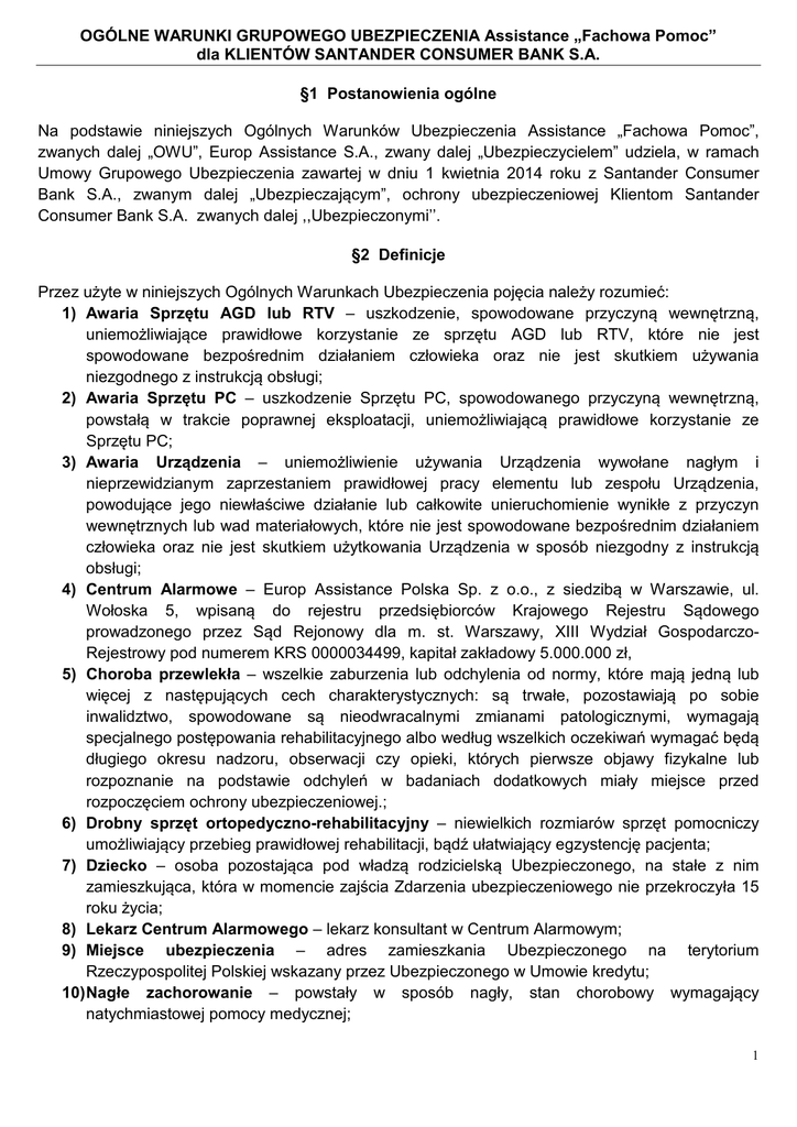 OGÓLNE WARUNKI GRUPOWEGO UBEZPIECZENIA Assistance „Fachowa Pomoc” dla KLIENTÓW SANTANDER CONSUMER BANK S.A. §1 Postanowienia ogólne Na podstawie niniejszych Ogólnych Warunków Ubezpieczenia Assistance „Fachowa Pomoc”, zwanych dalej „OWU”, Europ Assistance S.A., zwany dalej „Ubezpieczycielem” udziela, w ramach Umowy Grupowego Ubezpieczenia zawartej w dniu 1 kwietnia 2014 roku z Santander Consumer Bank S.A., zwanym dalej „Ubezpieczającym”, ochrony ubezpieczeniowej Klientom Santander Consumer Bank S.A. zwanych dalej ,,Ubezpieczonymi’’. §2 Definicje Przez użyte w niniejszych Ogólnych Warunkach Ubezpieczenia pojęcia należy rozumieć: 1) Awaria Sprzętu AGD lub RTV – uszkodzenie, spowodowane przyczyną wewnętrzną, uniemożliwiające prawidłowe korzystanie ze sprzętu AGD lub RTV, które nie jest spowodowane bezpośrednim działaniem człowieka oraz nie jest skutkiem używania niezgodnego z instrukcją obsługi; 2) Awaria Sprzętu PC – uszkodzenie Sprzętu PC, spowodowanego przyczyną wewnętrzną, powstałą w trakcie poprawnej eksploatacji, uniemożliwiającą prawidłowe korzystanie ze Sprzętu PC; 3) Awaria Urządzenia – uniemożliwienie używania Urządzenia wywołane nagłym i nieprzewidzianym zaprzestaniem prawidłowej pracy elementu lub zespołu Urządzenia, powodujące jego niewłaściwe działanie lub całkowite unieruchomienie wynikłe z przyczyn wewnętrznych lub wad materiałowych, które nie jest spowodowane bezpośrednim działaniem człowieka oraz nie jest skutkiem użytkowania Urządzenia w sposób niezgodny z instrukcją obsługi; 4) Centrum Alarmowe – Europ Assistance Polska Sp. z o.o., z siedzibą w Warszawie, ul. Wołoska 5, wpisaną do rejestru przedsiębiorców Krajowego Rejestru Sądowego prowadzonego przez Sąd Rejonowy dla m. st. Warszawy, XIII Wydział GospodarczoRejestrowy pod numerem KRS 0000034499, kapitał zakładowy 5.000.000 zł, 5) Choroba przewlekła – wszelkie zaburzenia lub odchylenia od normy, które mają jedną lub więcej z następujących cech charakterystycznych: są trwałe, pozostawiają po sobie inwalidztwo, spowodowane są nieodwracalnymi zmianami patologicznymi, wymagają specjalnego postępowania rehabilitacyjnego albo według wszelkich oczekiwań wymagać będą długiego okresu nadzoru, obserwacji czy opieki, których pierwsze objawy fizykalne lub rozpoznanie na podstawie odchyleń w badaniach dodatkowych miały miejsce przed rozpoczęciem ochrony ubezpieczeniowej.; 6) Drobny sprzęt ortopedyczno-rehabilitacyjny – niewielkich rozmiarów sprzęt pomocniczy umożliwiający przebieg prawidłowej rehabilitacji, bądź ułatwiający egzystencję pacjenta; 7) Dziecko – osoba pozostająca pod władzą rodzicielską Ubezpieczonego, na stałe z nim zamieszkująca, która w momencie zajścia Zdarzenia ubezpieczeniowego nie przekroczyła 15 roku życia; 8) Lekarz Centrum Alarmowego – lekarz konsultant w Centrum Alarmowym; 9) Miejsce ubezpieczenia – adres zamieszkania Ubezpieczonego na terytorium Rzeczypospolitej Polskiej wskazany przez Ubezpieczonego w Umowie kredytu; 10) Nagłe zachorowanie – powstały w sposób nagły, stan chorobowy wymagający natychmiastowej pomocy medycznej; 1 11) Nieszczęśliwy wypadek – powstałe w okresie ochrony ubezpieczeniowej, nagłe zdarzenie wywołane przyczyną zewnętrzną, w następstwie którego Ubezpieczony niezależnie od swej woli doznał trwałego uszczerbku na zdrowiu, rozstroju zdrowia lub zmarł; 12) Okres ubezpieczenia – okres, w trakcie którego Ubezpieczyciel udziela ochrony ubezpieczeniowej. Okres ubezpieczenia rozpoczyna się od następnego dnia po dniu zawarcia Umowy kredytu i trwa do rozwiązania Umowy kredytu; 13) Osoba niesamodzielna – osoba pozostająca pod opieką Ubezpieczonego, na stałe z nim zamieszkująca niezdolna do samodzielnej egzystencji w wyniku uszkodzenia i upośledzenia funkcji organizmu w następstwie choroby lub urazu, powodujących konieczność dalszej stałej lub długotrwałej opieki lub pomocy osób trzecich w wykonaniu czynności dnia codziennego; 14) OWU – niniejsze Ogólne Warunki Ubezpieczenia Assistance „Fachowa Pomoc” 15) Przypadkowe uszkodzenie Urządzenia – uszkodzenie Urządzenia w wyniku przepięcia prądu lub Nieszczęśliwego wypadku; 16) Przepięcie prądu – nagły wzrost napięcia prądu w sieci energetycznej, do której podłączone jest Urządzenie, przekraczające napięcie znamionowe dla danego Urządzenia, instalacji, sieci lub linii, ; 17) Rok ubezpieczeniowy – 12-miesieczny okres liczony od daty objęcia ochroną ubezpieczeniową, a następnie każdy kolejny 12 miesięczny okres, liczony od upływu poprzedniego Roku ubezpieczeniowego. Za Rok ubezpieczeniowy również uważa się Okres ubezpieczenia krótszy niż 12 miesięcy; 18) Sprzęt AGD/RTV – następujące urządzenia, zakupione przez Ubezpieczonego jako fabrycznie nowe, znajdujące się w Miejscu ubezpieczenia, które nie są już objęte gwarancją i których wiek nie przekracza 9-ciu lat: kuchnia gazowa lub elektryczna, lodówka, zamrażarka, chłodziarko-zamrażarka, pralka, pralko-suszarka, elektryczna suszarka na ubrania, zmywarka, odbiornik telewizyjny, odtwarzacz video, odtwarzacz DVD, radio, zestaw HI-FI; 19) Sprzęt PC – zakupiony przez Ubezpieczonego jako fabrycznie nowy, sprzęt stacjonarny komputerowy hardware stanowiący własność Ubezpieczonego (tj. komputer stacjonarny i monitor) lup laptop, użytkowany przez Ubezpieczonego, znajdujący się w Miejscu ubezpieczenia, który nie jest już objęty gwarancją producenta i którego wiek nie przekracza 9ciu lat, jest wykorzystywany wyłącznie do użytku domowego; 20) Ubezpieczający – Santander Consumer Bank S.A. z siedzibą we Wrocławiu, zwany dalej również Bankiem; 21) Ubezpieczony – osoba fizyczna, która zawarła z Ubezpieczającym Umowę kredytu i została zgłoszona przez Ubezpieczającego do Ubezpieczyciela; 22) Ubezpieczyciel – Europ Assistance S.
