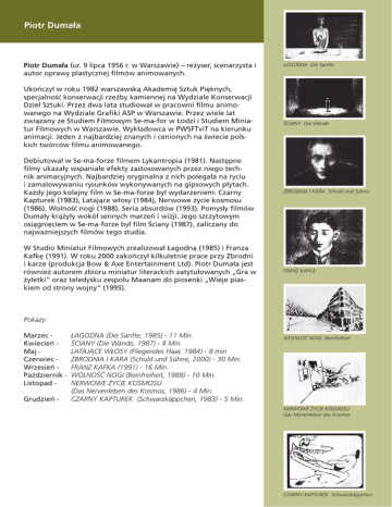 Piotr Dumała Piotr Dumała (ur. 9 lipca 1956 r. w Warszawie) – reżyser, scenarzysta i autor oprawy plastycznej filmów animowanych. Ukończył w roku 1982 warszawską Akademię Sztuk Pięknych, specjalność konserwacji rzeźby kamiennej na Wydziale Konserwacji Dzieł Sztuki. Przez dwa lata studiował w pracowni filmu animowanego na Wydziale Grafiki ASP w Warszawie. Przez wiele lat związany ze Studiem Filmowym Se-ma-for w Łodzi i Studiem Miniatur Filmowych w Warszawie. Wykładowca w PWSFTviT na kierunku animacji. Jeden z najbardziej znanych i cenionych na świecie polskich twórców filmu animowanego. Debiutował w Se-ma-forze filmem Lykantropia (1981). Następne filmy ukazały wspaniałe efekty zastosowanych przez niego technik animacyjnych. Najbardziej oryginalna z nich polegała na ryciu i zamalowywaniu rysunków wykonywanych na gipsowych płytach. Każdy jego kolejny film w Se-ma-forze był wydarzeniem: Czarny Kapturek (1983), Latające włosy (1984), Nerwowe życie kosmosu (1986), Wolność nogi (1988), Seria absurdów (1993). Pomysły filmów Dumały krążyły wokół sennych marzeń i wizji. Jego szczytowym osiągnięciem w Se-ma-forze był film Ściany (1987), zaliczany do najważniejszych filmów tego studia. W Studio Miniatur Filmowych zrealizował Łagodną (1985) i Franza Kafkę (1991). W roku 2000 zakończył kilkuletnie prace przy Zbrodni i karze (produkcja Bow & Axe Entertainment Ltd). Piotr Dumała jest również autorem zbioru miniatur literackich zatytułowanych „Gra w żyletki“ oraz teledysku zespołu Maanam do piosenki „Wieje piaskiem od strony wojny“ (1995). ŁAGODNA Die Sanfte ŚCIANY Die Wände ZBRODNIA I KARA Schuld und Sühne FRANZ KAFKA Pokazy: Marzec Kwiecień Maj Czerwiec Wrzesień Październik Listopad Grudzień - ŁAGODNA (Die Sanfte, 1985) - 11 Min. ŚCIANY (Die Wände, 1987) - 8 Min. LATAJĄCE WŁOSY (Fliegendes Haar, 1984) - 8 min ZBRODNIA I KARA (Schuld und Sühne, 2000) - 30 Min. FRANZ KAFKA (1991) - 16 Min. WOLNOŚĆ NOGI (Beinfreiheit, 1988) - 10 Min. NERWOWE ŻYCIE KOSMOSU (Das Nervenleben des Kosmos, 1986) - 4 Min. CZARNY KAPTUREK (Schwarzkäppchen, 1983) - 5 Min. WOLNOŚĆ NOGI Beinfreiheit NERWOWE ŻYCIE KOSMOSU Das Nervenleben des Kosmos CZARNY KAPTUREK Schwarzkäppchen W skrócie: marzec - ŁAGODNA Niezwykła wizja opowiadania Fiodora Dostojewskiego, sugestywne studium zazdrości i nienawiści, podkreślone zastosowaniem interesującej techniki malarskiej i przejmującą muzyką Zygmunta Koniecznego. kwiecień - ŚCIANY Pełna niepokojacego nastroju opowiesc o czlowieku zamknietym w pomieszczeniu bez wyjscia. Oczy bacznie obserwuja sciany, mezczyzna nasluchuje-lowi kazdy szmer, porusza sie, szukajac mozliwosci wyzwolenia. W ponurym labiryncie koryta rzy pojawia sie inny mezczyzna i do otworu kamiennej skarbonki wrzuca monete. Czlowiek siedzacy we wnetrzu obserwuje spadajacy pieniadz. Zapada ciemnosc. Ofiarodawca zgasil palaca sie zarowke. Tworzywem klimatu filmu Piotra Dumaly -procz jego refleksyjnych tresci-sa wysmakowany rysunek i sposob animacji, nieco przypominajace „Lagodna“ tego realizatora, a takze spojna z obrazem, sugestywna muzyka Przemyslawa Gintrowskiego. maj - LATAJĄCE WŁOSY Impresja opowiadająca o spacerze dwojga zakochanych, podczas którego zachodzą dziwne zjawiska. Chłopak i dziewczyna biegną pod rozgwieżdżonym niebem, nagle zrywa się burza, łamią się drzewa, a w powietrzu unosi się deszcz srebrzystych igieł przekształcających się we włosy. czerwiec - ZBRODNIA I KARA Film animowany „Zbrodnia i Kara“ w reżyserii Piotra Dumały powstał na motywach powieści Fiodora Dostojewskiego. Młody mężczyzna, mieszkający na poddaszu starej kamienicy, morduje dwie stare kobiety. Świadkiem tego czynu był prawdopodobnie mężczyzna w cylindrze. Morderca powraca do swojej izdebki i tam przeżywa halucynacyjne lęki i wyrzuty sumienia. Krąży wokół miejsca zbrodni..... ŁAGODNA Die Sanfte ŚCIANY Die Wände ZBRODNIA I KARA Schuld und Sühne FRANZ KAFKA wrzesień - FRANZ KAFKA Film w formie animacji, przestawia kilka lat z życia pisarza; powstawał w latach 1989 - 1991. pazdziernik - WOLNOŚĆ NOGI Księżycowa noc. Śpiący mężczyzna nagle rozpada się, fragmenty jego ciała rozpoczynają samodzielne życie. Rankiem, na dźwięk budzika, wracają do łóżka. Zaskoczony mężczyzna stwierdza jednak brak nogi, która opuściła pokój i wybrała wolność. Biegnącą ulicą ściga tłum beznogich mężczyzn, do których dołącza jej właściciel. Nagle nodze wyrastają skrzydła i bezpieczna, niby dostojny ptak, unosi się pod niebem. Lot śledzą zdumione i pełne smutku spojrzenia inwalidów. Ta groteskowa opowieść zawiera w sobie także elementy refleksyjne i poetyckie. Podobnie jak w innych filmach Piotra Dumały i tu znacząca rola przypada muzyce. WOLNOŚĆ NOGI Beinfreiheit listopad - NERWOWE ŻYCIE Film w konwencji horroru zabarwionego czarnym humorem. Dziwny świat, gdzieś w kosmosie, który zamieszkują postacie ze strasznych bajek. grudzień - CZARNY KAPTUREK Z chatki wychodzi chłopczyk, zakłada kapturek i idzie z koszyczkiem w las. Po drodze zjada i niszczy kwiaty. Spotkawszy ogromnego wilka , również go zjada. Do leżącego na ziemi podchodzi myśliwy. Wilk wydostaje się z chłopca i zjada myśliwego, po czym udaje się do pobliskiego domu, ale tam zabija go mężczyzna. Znalazłszy w brzuchu wilka czarny kapturek chłopczyk, popełnia harakiri. Z wnętrza wilka wydostaje się myśliwy. Biegnie przez las i znów dostrzega wilka, który podchodzi do położonego na wzgórzu domku, zagląda przez okno, wskakuje do środka i i rzuca się na spoczywającą w łóżku nagą kobietę. Jego zamiary nie są jednak krwiożercze. [PAT] NERWOWE ŻYCIE KOSMOSU Das Nervenleben des Kosmos CZARNY KAPTUREK Schwarzkäppchen