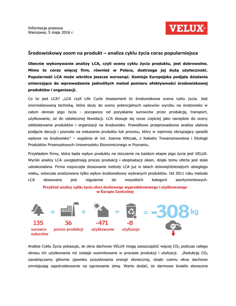 Informacja prasowa Warszawa, 5 maja 2016 r. Środowiskowy zoom na produkt – analiza cyklu życia coraz popularniejsza Obecnie wykonywanie analizy LCA, czyli oceny cyklu życia produktu, jest dobrowolne. Mimo to coraz więcej firm, również w Polsce, dostrzega jej dużą użyteczność. Popularność LCA może wkrótce jeszcze wzrosnąć. Komisja Europejska podjęła działania zmierzające do wprowadzenia jednolitych metod pomiaru efektywności środowiskowej produktów i organizacji. Co to jest LCA? „LCA czyli Life Cycle Assessment to środowiskowa ocena cyklu życia. Jest znormalizowaną techniką, która służy do oceny potencjalnych wpływów wyrobu na środowisko w całym okresie jego życia - począwszy od pozyskania surowców przez produkcję, transport, użytkowanie, aż do ostatecznej likwidacji. LCA stosuje się coraz częściej jako narzędzie do oceny oddziaływania produktów i organizacji na środowisko. Prawidłowo przeprowadzona analiza ułatwia podjęcie decyzji i pozwala na wskazanie produktu lub procesu, który w najmniej obciążający sposób wpływa na środowisko” – wyjaśnia dr inż. Joanna Witczak, z Katedry Towaroznawstwa i Ekologii Produktów Przemysłowych Uniwersytetu Ekonomicznego w Poznaniu. Przykładem firmy, która bada wpływ produktu na otoczenie na każdym etapie jego życia jest VELUX. Wyniki analizy LCA uwzględniają proces produkcji i eksploatacji okien, dzięki temu oferta jest stale udoskonalana. Firma rozpoczęła stosowanie metody LCA już w latach dziewięćdziesiątych ubiegłego wieku, wówczas analizowano tylko wpływ środowiskowy wybranych produktów. Od 2011 roku metoda LCA stosowana jest regularnie do wszystkich kategorii asortymentowych. Analiza Cyklu Życia pokazuje, że okna dachowe VELUX mogą zaoszczędzić więcej CO2 podczas całego okresu ich użytkowania niż zostaje wyemitowane w procesie produkcji i utylizacji. „Redukcję CO2 zawdzięczamy głównie zjawisku pozyskiwania energii słonecznej, dzięki czemu okna dachowe zmniejszają zapotrzebowanie na ogrzewanie zimą. Warto dodać, że darmowe światło słoneczne redukuje również zużycie energii elektrycznej w ciągu doby” – komentuje Jacek Siwiński, dyrektor generalny VELUX Polska. Uwzględniając analizę LCA, firma VELUX opracowała w ostatnich latach Nową Generację okien dachowych. Nowe okna VELUX mają nawet o 10 proc. większą powierzchnię szyby, tym samym dostarczają więcej światła dziennego niż wcześniejsze modele. Jednocześnie charakteryzują się lepszą izolacyjnością, m.in. dzięki zastosowaniu rozwiązania ThermoTechnology®. Jakie korzyści? Zastosowanie metody opartej na ocenie cyklu życia przynosi wiele korzyści. Przede wszystkim daje możliwości w zakresie doskonalenia środowiskowego produktów i tworzenia innowacji. Wpływa również na efektywność organizacji. Za wprowadzanymi zmianami sprzyjającymi korzyściom środowiskowym idą również korzyści ekonomiczne. „Jest wiele przykładów rozwiązań wprowadzonych w fabrykach VELUX, które przyniosły zarówno korzyści środowiskowe, jak i ekonomiczne. Kocioł na biomasę, który zainstalowano w fabryce VELUX w Gnieźnie pokrywa około 85 proc. rocznego zapotrzebowania fabryki na ciepło. Obok oszczędności na poziomie około 570 tysięcy złotych rocznie takie rozwiązanie pozwoliło na znaczną redukcje emisji CO2 mimo ciągłego zwiększania produkcji. Ogromny potencjał ma również system zarządzania energią oparty na ISO 50001, który funkcjonuje w naszych zakładach” – mówi Jacek Siwiński. Zrównoważone podejście do produkcji wpływa korzystnie na zwiększenie popytu na produkty firmy. Konsumenci coraz bardziej poszukują „ekologicznych” rozwiązań. Na podstawie danych Departamentu Komisji Europejskiej ds. Biznesu, Innowacji i Umiejętności z 2012 r., wartość światowego rynku „niskoemisyjnych” i „ekologicznych” produktów i usług szacuje się na 4,2 bln EUR, z czego na UE przypada 21%. Rynek ten rośnie średnio 4% rocznie, rośnie też konkurencja między przedsiębiorstwami w zdobywaniu udziału w tym rynku. „Dla rozwoju rynku zielonych produktów konieczne jest dostarczanie rzetelnej, jasnej, konkretnej, skwantyfikowanej i porównywalnej informacji środowiskowej. Można ją pozyskać dzięki zastosowaniu środowiskowej oceny cyklu życia (LCA). Korzyści z jej wykorzystania leżą zarówno po stronie firm, jak i konsumentów” – mówi Joanna Witczak. Uzyskane wyniki mogą służyć spełnieniu wymagań kryteriów np. w Zielonych Zamówieniach Publicznych (GPP), Certyfikacji Energetycznej (Recast), czy ekoznakowaniu. Klient, który zwraca uwagę na środowisko, zyskuje natomiast produkt spełniający jego oczekiwania również pod tym względem. Ważna edukacja konsumenta Istotne znaczenie w całym cyklu życia produktu i jego wpływu na środowisko ma użytkowanie. Istnieje cała gama produktów, których oddziaływanie na środowisko powstające na etapie użytkowania zależy w dużej mierze od samego konsumenta. Stąd też bardzo ważne jest podejmowanie działań zmierzających do edukowania konsumentów w zakresie możliwości i sposobu użytkowania produktu sprzyjającego minimalizowaniu oddziaływań na środowisko. Przykładem jest stosowanie przesłon na okna wraz z ich dynamicznym sterowaniem, w zależności od pory dnia i pory roku. „Dzięki zastosowaniu rolet do okna dachowego można znacznie poprawić komfort oraz oszczędności energii w domu. Rolety służą latem w celu ochrony przed przegrzewaniem poddasza. Z kolei zimą rolety należy podnieść je w ciągu dnia i umożliwić pozyskiwanie energii słonecznej, a na noc opuścić, aby zmniejszyć straty ciepła.” – tłumaczy Jacek Siwiński. Znajduje to swoje odzwierciedlenie w analizie LCA. Na przykład poprzez zastosowanie energooszczędnej rolety zaciemniającej FHC VELUX można dwukrotnie zwiększyć pozytywny wpływ środowiskowy okna dachowego. 