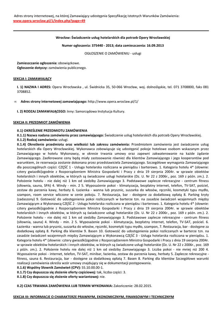 Adres strony internetowej, na której Zamawiający udostępnia Specyfikację Istotnych Warunków Zamówienia: www.opera.wroclaw.pl/1/index.php?page=49 Wrocław: Świadczenie usług hotelarskich dla potrzeb Opery Wrocławskiej Numer ogłoszenia: 375440 - 2013; data zamieszczenia: 16.09.2013 OGŁOSZENIE O ZAMÓWIENIU - usługi Zamieszczanie ogłoszenia: obowiązkowe. Ogłoszenie dotyczy: zamówienia publicznego. SEKCJA I: ZAMAWIAJĄCY I. 1) NAZWA I ADRES: Opera Wrocławska , ul. Świdnicka 35, 50-066 Wrocław, woj. dolnośląskie, tel. 071 3708800, faks 081 3708852. • Adres strony internetowej zamawiającego: http://www.opera.wroclaw.pl/1/ I. 2) RODZAJ ZAMAWIAJĄCEGO: Inny: Samorządowa Instytucja Kultury. SEKCJA II: PRZEDMIOT ZAMÓWIENIA II.1) OKREŚLENIE PRZEDMIOTU ZAMÓWIENIA II.1.1) Nazwa nadana zamówieniu przez zamawiającego: Świadczenie usług hotelarskich dla potrzeb Opery Wrocławskiej. II.1.2) Rodzaj zamówienia: usługi. II.1.4) Określenie przedmiotu oraz wielkości lub zakresu zamówienia: Przedmiotem zamówienia jest świadczenie usług hotelarskich dla Opery Wrocławskiej. Wykonawca zobowiązuje się udostępnić pokoje hotelowe osobom wskazanym przez Zamawiającego w hotelu Wykonawcy, w okresie trwania umowy oraz zapewni zakwaterowanie na każde żądanie Zamawiającego. Zaoferowane ceny będą miały zastosowanie również dla klientów Zamawiającego i jego kooperantów pod warunkiem, że rezerwacja zostanie dokonana przez przedstawiciela Zamawiającego. Szczegółowe wymagania Zamawiającego dla poszczególnych części: CZĘŚĆ 1 - Usługa hotelarska rozliczana w pieniądzu i barterowo. 1. Kategoria hotelu 4* (słownie: cztery gwiazdki)zgodnie z Rozporządzeniem Ministra Gospodarki i Pracy z dnia 19 sierpnia 2004r. w sprawie obiektów hotelarskich i innych obiektów, w których są świadczone usługi hotelarskie (Dz. U. Nr 22 z 2006r., poz. 169 z późn. zm.). 2. Położenie hotelu - nie dalej niż 1 km od siedziby Zamawiającego 3. Podstawowe zaplecze rekreacyjne - centrum fitness (siłownia, sauna, SPA) 4. Windy - min. 2 5. Wyposażenie pokoi - klimatyzacja, bezpłatny internet, telefon, TV-SAT, pościel, zestaw do parzenia kawy, herbaty 6. Łazienka - wanna lub prysznic, suszarka do włosów, ręczniki, kosmetyki typu mydło, szampon, room service wliczone w cenie pokoju. 7. Restauracja, bar - dostępne za dodatkową opłatą 8. Parking kryty (zadaszony) 9. Gotowość do udostępnienia pokoi rozliczanych w barterze tzn. na zasadzie świadczeń wzajemnych między Zamawiającym a Wykonawcą CZĘŚĆ 2 - Usługa hotelarska rozliczana w pieniądzu i barterowo. 1. Kategoria hotelu 4* (słownie: cztery gwiazdki)zgodnie z Rozporządzeniem Ministra Gospodarki i Pracy z dnia 19 sierpnia 2004r. w sprawie obiektów hotelarskich i innych obiektów, w których są świadczone usługi hotelarskie (Dz. U. Nr 22 z 2006r., poz. 169 z późn. zm.). 2. Położenie hotelu - nie dalej niż 1 km od siedziby Zamawiającego 3. Podstawowe zaplecze rekreacyjne - centrum fitness (siłownia, sauna) 4. Windy - min. 2 5. Wyposażenie pokoi - klimatyzacja, bezpłatny internet, telefon, TV-SAT, pościel. 6. Łazienka - wanna lub prysznic, suszarka do włosów, ręczniki, kosmetyki typu mydło, szampon, 7. Restauracja, bar - dostępne za dodatkową opłatą 8. Parking dla klientów 9. Basen 10. Gotowość do udostępnienia pokoi rozliczanych w barterze tzn. na zasadzie świadczeń wzajemnych między Zamawiającym a Wykonawcą CZĘŚĆ 3 - Usługa hotelarska rozliczana w pieniądzu. 1. Kategoria hotelu 4* (słownie: cztery gwiazdki)zgodnie z Rozporządzeniem Ministra Gospodarki i Pracy z dnia 19 sierpnia 2004r. w sprawie obiektów hotelarskich i innych obiektów, w których są świadczone usługi hotelarskie (Dz. U. Nr 22 z 2006r., poz. 169 z późn. zm.). 2. Położenie hotelu nie dalej niż 1 km od siedziby Zamawiającego 3. Liczba pokoi - nie mniej niż 200 4. Wyposażenie pokoi - internet, telefon, TV-SAT, minibar, łazienka, zestaw do parzenia kawy, herbaty 5. Zaplecze rekreacyjne fitness, sauna 6. Restauracja, bar - dostępne za dodatkową opłatą 7. Basen 8. Parking dla klientów Szczegółowe warunki realizacji zamówienia określa wzór umowy znajdujący się w dokumentacji postępowania. II.1.6) Wspólny Słownik Zamówień (CPV): 55.10.00.00-1. II.1.7) Czy dopuszcza się złożenie oferty częściowej: tak, liczba części: 3. II.1.8) Czy dopuszcza się złożenie oferty wariantowej: nie. II.2) CZAS TRWANIA ZAMÓWIENIA LUB TERMIN WYKONANIA: Zakończenie: 28.02.2015. SEKCJA III: INFORMACJE O CHARAKTERZE PRAWNYM, EKONOMICZNYM, FINANSOWYM I TECHNICZNYM III.1) WADIUM Informacja na temat wadium: Zamawiający nie wymaga wniesienia wadium III.2) ZALICZKI III.3) WARUNKI UDZIAŁU W POSTĘPOWANIU ORAZ OPIS SPOSOBU DOKONYWANIA OCENY SPEŁNIANIA TYCH WARUNKÓW • III. 3.1) Uprawnienia do wykonywania określonej działalności lub czynności, jeżeli przepisy prawa nakładają obowiązek ich posiadania Opis sposobu dokonywania oceny spełniania tego warunku o zamawiający nie precyzuje wymagań w zakresie niniejszego warunku • III.3.2) Wiedza i doświadczenie Opis sposobu dokonywania oceny spełniania tego warunku o zamawiający nie precyzuje wymagań w zakresie niniejszego warunku • III.3.3) Potencjał techniczny Opis sposobu dokonywania oceny spełniania tego warunku o zamawiający nie precyzuje wymagań w zakresie niniejszego warunku • III.3.4) Osoby zdolne do wykonania zamówienia Opis sposobu dokonywania oceny spełniania tego warunku o zamawiający nie precyzuje wymagań w zakresie niniejszego warunku • III.3.5) Sytuacja ekonomiczna i finansowa Opis sposobu dokonywania oceny spełniania tego warunku o zamawiający nie precyzuje wymagań w zakresie niniejszego warunku III.4) INFORMACJA O OŚWIADCZENIACH LUB DOKUMENTACH, JAKIE MAJĄ DOSTARCZYĆ WYKONAWCY W CELU POTWIERDZENIA SPEŁNIANIA WARUNKÓW UDZIAŁU W POSTĘPOWANIU ORAZ NIEPODLEGANIA WYKLUCZENIU NA PODSTAWIE ART. 24 UST. 1 US