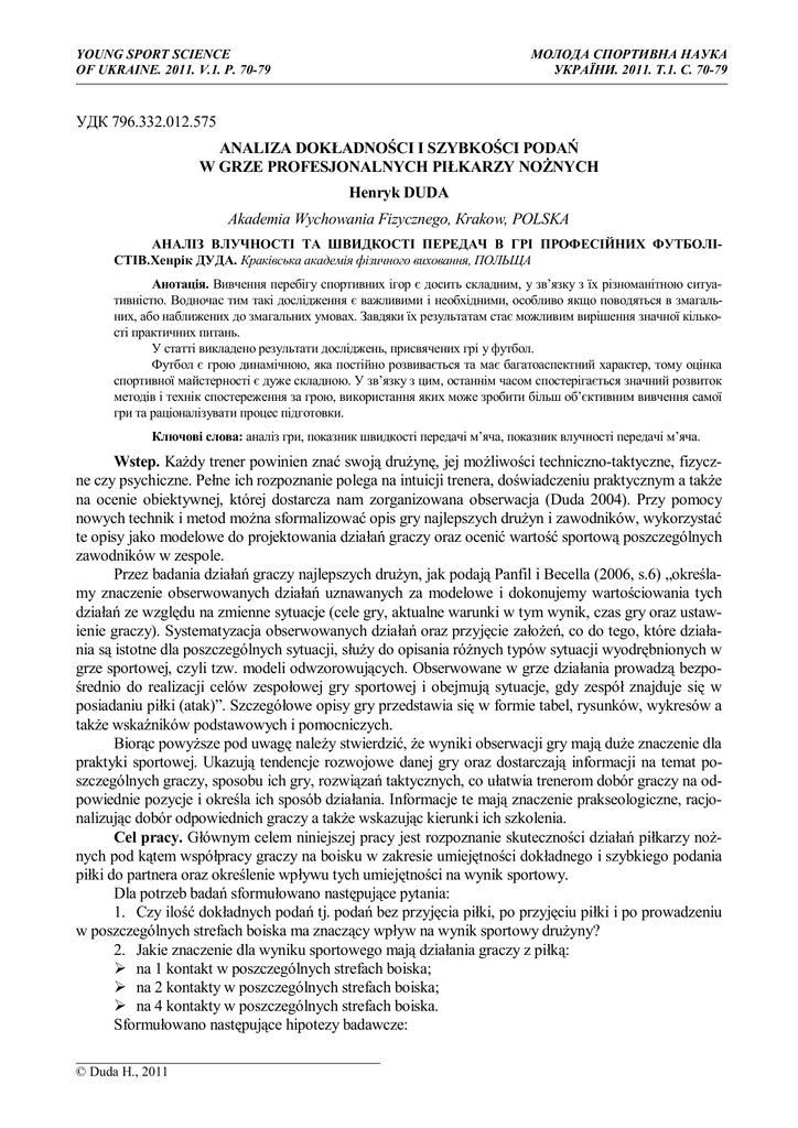 МОЛОДА СПОРТИВНА НАУКА УКРАЇНИ. 2011. Т.1. С. 70-79 YOUNG SPORT SCIENCE OF UKRAINE. 2011. V.1. P. 70-79 УДК 796.332.012.575 ANALIZA DOKŁADNOŚCI I SZYBKOŚCI PODAŃ W GRZE PROFESJONALNYCH PIŁKARZY NOŻNYCH Henryk DUDA Akademia Wychowania Fizycznego, Кrakow, POLSKA АНАЛІЗ ВЛУЧНОСТІ ТА ШВИДКОСТІ ПЕРЕДАЧ В ГРІ ПРОФЕСІЙНИХ ФУТБОЛІСТІВ.Хенрік ДУДА. Краківська академія фізичного виховання, ПОЛЬЩА Анотація. Вивчення перебігу спортивних ігор є досить складним, у зв’язку з їх різноманітною ситуативністю. Водночас тим такі дослідження є важливими і необхідними, особливо якщо поводяться в змагальних, або наближених до змагальних умовах. Завдяки їх результатам стає можливим вирішення значної кількості практичних питань. У статті викладено результати досліджень, присвячених грі у футбол. Футбол є грою динамічною, яка постійно розвивається та має багатоаспектний характер, тому оцінка спортивної майстерності є дуже складною. У зв’язку з цим, останнім часом спостерігається значний розвиток методів і технік спостереження за грою, використання яких може зробити більш об’єктивним вивчення самої гри та раціоналізувати процес підготовки. Ключові слова: аналіз гри, показник швидкості передачі м’яча, показник влучності передачі м’яча. Wstep. Każdy trener powinien znać swoją drużynę, jej możliwości techniczno-taktyczne, fizyczne czy psychiczne. Pełne ich rozpoznanie polega na intuicji trenera, doświadczeniu praktycznym a także na ocenie obiektywnej, której dostarcza nam zorganizowana obserwacja (Duda 2004). Przy pomocy nowych technik i metod można sformalizować opis gry najlepszych drużyn i zawodników, wykorzystać te opisy jako modelowe do projektowania działań graczy oraz ocenić wartość sportową poszczególnych zawodników w zespole. Przez badania działań graczy najlepszych drużyn, jak podają Panfil i Becella (2006, s.6) „określamy znaczenie obserwowanych działań uznawanych za modelowe i dokonujemy wartościowania tych działań ze względu na zmienne sytuacje (cele gry, aktualne warunki w tym wynik, czas gry oraz ustawienie graczy). Systematyzacja obserwowanych działań oraz przyjęcie założeń, co do tego, które działania są istotne dla poszczególnych sytuacji, służy do opisania różnych typów sytuacji wyodrębnionych w grze sportowej, czyli tzw. modeli odwzorowujących. Obserwowane w grze działania prowadzą bezpośrednio do realizacji celów zespołowej gry sportowej i obejmują sytuacje, gdy zespół znajduje się w posiadaniu piłki (atak)”. Szczegółowe opisy gry przedstawia się w formie tabel, rysunków, wykresów a także wskaźników podstawowych i pomocniczych. Biorąc powyższe pod uwagę należy stwierdzić, że wyniki obserwacji gry mają duże znaczenie dla praktyki sportowej. Ukazują tendencje rozwojowe danej gry oraz dostarczają informacji na temat poszczególnych graczy, sposobu ich gry, rozwiązań taktycznych, co ułatwia trenerom dobór graczy na odpowiednie pozycje i określa ich sposób działania. Informacje te mają znaczenie prakseologiczne, racjonalizując dobór odpowiednich graczy a także wskazując kierunki ich szkolenia. Cel pracy. Głównym celem niniejszej pracy jest rozpoznanie skuteczności działań piłkarzy nożnych pod kątem współpracy graczy na boisku w zakresie umiejętności dokładnego i szybkiego podania piłki do partnera oraz określenie wpływu tych umiejętności na wynik sportowy. Dla potrzeb badań sformułowano następujące pytania: 1. Czy ilość dokładnych podań tj. podań bez przyjęcia piłki, po przyjęciu piłki i po prowadzeniu w poszczególnych strefach boiska ma znaczący wpływ na wynik sportowy drużyny? 2. Jakie znaczenie dla wyniku sportowego mają działania graczy z piłką: Ø na 1 kontakt w poszczególnych strefach boiska; Ø na 2 kontakty w poszczególnych strefach boiska; Ø na 4 kontakty w poszczególnych strefach boiska. Sformułowano następujące hipotezy badawcze: © Duda H., 2011 Analiza dokładności i szybkości podań w grze… 71 1. Dokładność i szybkość podań piłki ma wpływ na wynik sportowy drużyny. 2. Szybkość podań piłki ma wpływ na realizację celów gry. Materiał i metody badań. W pracy dokonano szczegółowej obserwacji profesjonalnych piłkarzy (reprezentacji narodowych) w meczu eliminacyjnym Polska – Belgia (wynik 2:0), decydującego o awansie do finału EURO 2008. Analizy badawczej dokonano z wykorzystaniem materiału filmowego nagranego na płycie DVD, gdzie przy wielokrotnym odtwarzaniu sytuacji gry obserwowano badane działania. W metodzie badawczej zastosowano arkusz obserwacyjny, gdzie w odpowiednich rubrykach pod określonym zagadnieniem (parametr obserwacji), notowano wszelkie spostrzeżone fakty, zdarzenia i okoliczności, mające związek z danym zagadnieniem (Łobocki 2006). W arkuszu obserwacyjnym, który został opracowany według Dudy (2008), określono następujące parametry. 1. Liczbę podań zawodników w obserwowanych meczach, w poszczególnych strefach z określoną szybkością podań. 2. Zespołowy wskaźnik dokładności (skuteczności) – wyznaczany jako suma wszystkich działań z