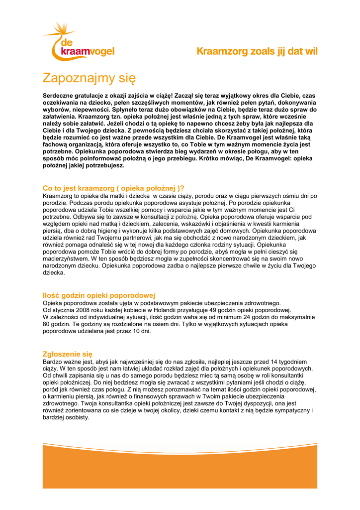 Zapoznajmy się Serdeczne gratulacje z okazji zajścia w ciążę! Zaczął się teraz wyjątkowy okres dla Ciebie, czas oczekiwania na dziecko, pełen szczęśliwych momentów, jak również pełen pytań, dokonywania wyborów, niepewności. Spłyneło teraz dużo obowiązków na Ciebie, będzie teraz dużo spraw do załatwienia. Kraamzorg tzn. opieka położnej jest właśnie jedną z tych spraw, które wcześnie należy sobie załatwić. Jeżeli chodzi o tą opiekę to napewno chcesz żeby była jak najlepsza dla Ciebie i dla Twojego dziecka. Z pewnością będziesz chciała skorzystać z takiej położnej, która będzie rozumieć co jest ważne przede wszystkim dla Ciebie. De Kraamvogel jest właśnie taką fachową organizacją, która oferuje wszystko to, co Tobie w tym ważnym momencie życia jest potrzebne. Opiekunka poporodowa stwierdza bieg wydarzeń w okresie połogu, aby w ten sposób móc poinformować położną o jego przebiegu. Krótko mówiąc, De Kraamvogel: opieka położnej jakiej potrzebujesz. Co to jest kraamzorg ( opieka położnej )? Kraamzorg to opieka dla matki i dziecka w czasie ciąży, porodu oraz w ciągu pierwszych ośmiu dni po porodzie. Podczas porodu opiekunka poporodowa asystuje położnej. Po porodzie opiekunka poporodowa udziela Tobie wszelkiej pomocy i wsparcia jakie w tym ważnym momencie jest Ci potrzebne. Odbywa się to zawsze w konsultacji z położną. Opieka poporodowa oferuje wsparcie pod względem opieki nad matką i dzieckiem, zalecenia, wskazówki i objaśnienia w kwestii karmienia piersią, dba o dobrą higienę i wykonuje kilka podstawowych zajęć domowych. Opiekunka poporodowa udziela również rad Twojemu partnerowi, jak ma się obchodzić z nowo narodzonym dzieckiem, jak również pomaga odnaleść się w tej nowej dla każdego członka rodziny sytuacji. Opiekunka poporodowa pomoże Tobie wrócić do dobrej formy po porodzie, abyś mogła w pełni cieszyć się macierzyństwem. W ten sposób będziesz mogła w zupełności skoncentrować się na swoim nowo narodzonym dziecku. Opiekunka poporodowa zadba o najlepsze pierwsze chwile w życiu dla Twojego dziecka. Ilość godzin opieki poporodowej Opieka poporodowa została ujęta w podstawowym pakiecie ubezpieczenia zdrowotnego. Od stycznia 2008 roku każdej kobiecie w Holandii przysługuje 49 godzin opieki poporodowej. W zależności od indywidualnej sytuacji, ilość godzin waha się od minimum 24 godzin do maksymalnie 80 godzin. Te godziny są rozdzielone na osiem dni. Tylko w wyjątkowych sytuacjach opieka poporodowa udzielana jest przez 10 dni. Zgłoszenie się Bardzo ważne jest, abyś jak najwcześniej się do nas zgłosiła, najlepiej jeszcze przed 14 tygodniem ciąży. W ten sposób jest nam łatwiej układać rozkład zajęć dla położnych i opiekunek poporodowych. Od chwili zapisania się u nas do samego porodu będziesz miec tą samą osobę w roli konsultantki opieki położniczej. Do niej bedziesz mogła się zwracać z wszystkimi pytaniami jeśli chodzi o ciążę, poród jak również czas połogu. Z nią możesz porozmawiać na temat ilości godzin opieki poporodowej, o karmieniu piersią, jak również o finansowych sprawach w Twoim pakiecie ubezpieczenia zdrowotnego. Twoja konsultantka opieki położniczej jest zawsze do Twojej dyspozycji, ona jest również zorientowana co sie dzieje w twojej okolicy, dzieki czemu kontakt z nią będzie sympatyczny i bardziej osobisty. Opieka poporodowa w szpitalu Zaraz po porodzie w szpitalu jest udzielana Tobie i Twojemu dziecku opieka. Zakładając, że urodzisz do południa w szpitalu bez żadnych komplikacji, wówczas popołudniu lub wczesnym wieczorem będziecie mogli opuścić szpital. Po Waszym powrocie do domu chciałabyś skorzystać od razu z pomocy opiekunki poporodowej. W De Kraamvogel jest to zawsze możliwe. De Kraamvogel pomoże Tobie w przygotowaniu się do spokojnej pierwszej nocy po porodzie w domu. Ta pierwsza pomoc trwa przeważnie około dwóch godzin. Od ilości tych pierwszych godzin, zależy ile godzin opieki poporodowej w sumie będzie Ci się należeć. Opieka dla matki i dziecka Opiekunka poporodowa jest przede wszystkim dla matki i nowo narodzonego dziecka. Ona pomaga Tobie jako matce dbać o higiene osobistą. Opiekunka poporodowa będzie dziennie kontrolować u Ciebie: • • • • • • • • • temperaturę ciała tętno połogowe skurcze macicy upławy piersi nogi oddawanie moczu stolec ewentualne zszycia po nacięciu krocza wykonane podczas porodu Ponadto będzie uważać na to jak Ty po porodzie wracasz do sił i czy wystarczająco dużo odpoczywasz. Zadba abyś w zupełności mogła skoncentrować się na swoim nowo narodzonym dziecku i cieszyć się nim. Opieka nad dzieckiem Opiekunka poporodowa w czasie opieki nad nowo narodzonym dzieckiem będzie zwracać uwagę na: • • • • • • • temperaturę ciała kolor zabarwienia skóry oddychanie prawidłowy odruch ssania oddawanie moczu stolec pielęgnacja pępka Wszystkie te informacje opiekunka poporodowa będzie zapisywac w tzw. przewodniku macierzeńskim ( de Kraamwijzer ). Te informacje są bardzo ważne dla Twojej położnej i Twojego lekarza domowego, którzy regularnie w czasie połogu będą do Ciebie przychodzić. Jak również dla pielęgniarki środowiskowej. W zależności od wcześniej uzgodnionych ilości godzin, opiekunka poporodowa będzie wykonywać kilka podstawowych codziennych zajęć domowych. W zależności od sytuacji, bedzie dbać o starsze rodzeństwo. Oczywiście to wszystko w porozumieniu z Tobą, tak aby pomóc Tobie jak najszybciej dość do pełni sił. Rejestracja Wypełnij swoje dane osobowe i wyślij to w kopercie bez znaczka na adres. De Kraamvogel klantenservice Postbus 900 7940 KE Meppel [email protected] www.dekraamvogel.nl My skontaktujemy się jak najszybciej z Tobą, aby razem wszystko sprawnie załatwić. Zwróć uwagę na to, że my rozmawiamy tylko po holendersku i ewentualnie po angielsku