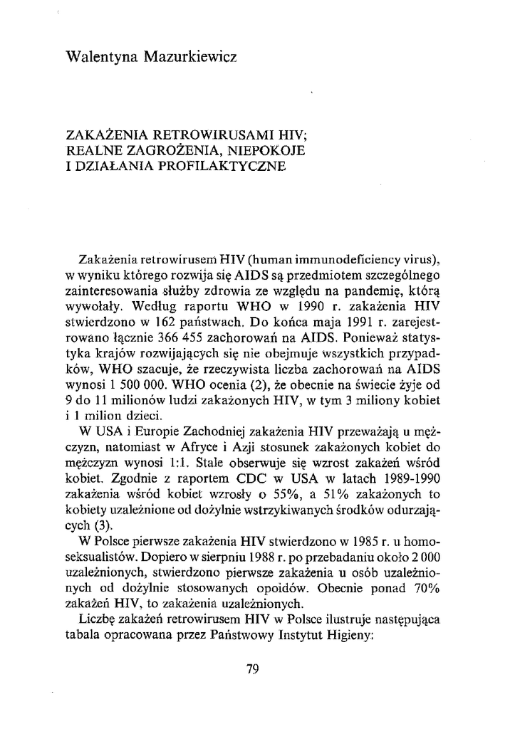 Walentyna Mazurkiewicz ZAKAŻENIA RETROWIRUSAMI HIV; REALNE ZAGROŻENIA, NIEPOKOJE I DZIAŁANIA PROFILAKTYCZNE Zakażenia retrowirusem HIV (human immunodeficiency virus), w wyniku którego rozwija się AIDS są przedmiotem szczególnego zainteresowania służby zdrowia ze względu na pandemię, którą wywołały. Według raportu WHO w 1990 r. zakażenia HIV stwierdzono w 162 państwach. Do końca maja 1991 r. zarejestrowano łącznie 366 455 zachorowań na AIDS. Ponieważ statystyka krajów rozwijających się nie obejmuje wszystkich przypadków, WHO szacuje, że rzeczywista liczba zachorowań na AIDS wynosi l 500 000. WHO ocenia (2), że obecnie na świecie żyje od 9 do II milionów ludzi zakażonych HIV, w tym 3 miliony kobiet i l milion dzieci. W USA i Europie Zachodniej zakażenia HIV przeważają u męż czyzn, natomiast w Afryce i Azji stosunek zakażonych kobiet do mężczyzn wynosi l: l. Stale obserwuje się wzrost zakażeń wśród kobiet. Zgodnie z raportem CDC w USA w latach 1989-1990 zakażenia wśród kobiet wzrosły o 55%, a 51 % zakażonych to kobiety uzależnione od dożylnie wstrzykiwanych środków odurzają cych (3). W Polsce pierwsze zakażenia HIV stwierdzono w 1985 r. u homoseksualistów. Dopiero w sierpniu 1988 r. po przebadaniu około 2 000 uzależnionych, stwierdzono pierwsze zakażenia u osób uzależnio nych od dożylnie stosowanych opoidów. Obecnie ponad 70% zakażeń HIV, to zakażenia uzależnionych. Liczbę zakażeń retrowirusem HIV w Polsce ilustruje następująca tabala opracowana przez Państwowy Instytut Higieny: 79 Rok łącznie liczba wykrytych wzrost zakażeń * % 1985 12 12 - 1986 8 20 67 1987 32 52 160 1988 59 111 113 629 467 ~ 1989 518 1990 806 1435 129 1991 565 2000 70 1992 565 2000 70 Liczby dotyczą zakażeń zarejestrowanych przez PZH do końca czerwca 1992 r. Retrowirus HIV został wyizolowany z krwi, płynu mózgowo-rdzeniowego i nasienia. Wyizolowano go także z wydzieliny szyjki macicy i pochwy, mleka kobiecego, moczu, śliny, owodni, wód płodowych, łez, węzłów chłonnych, tkanki mózgowej i skóry. Z wymienionych w drugiej grupie płynów i tkanek wirusa udało się wyizolować tylko sporadycznie. Wiadomo jednak, że w życiu codziennym zakaźne są tylko kontakty seksualne oraz kontakt z krwią zakażonego, a matka zakażona HIV może przenieść zakażenie na płód. Głównym źródłem zakażenia są kontakty seksualne (80%), tak homo jak i heteroseksualne. Badania przeprowadzone wśród partnerów homoseksualistów zakażonych HIV wykazały, że choroby przenoszone drogą płciową (kiła nabyta wczesna, rzeżączka, opryszczka pospolita i NGU) występujące w roku poprzedzaj"ącym badanie, usposabiały do zakażenia HIV. Pojawienie się choroby przenoszonej drogą płciową po ostatnim kontakcie seksualnym z osobą chorą na AIDS wiązało się z szybszym pojawianiem się przeciwciał anty-HIV w surowicy oraz uogólnionej limfadenapatii u osób bezobjawowych zakażonych HIV (22). Z przeprowadzonych badań wynika, że choroby przenoszone drogą płciową sprzyjają zakażeniu retrowirusem HTLV-IIIjLAV (HIV) oraz progresji zakażenia HIV. Badania Stamma i wsp. (21) 80 potwierdziły cytowaną obserwację, że wrzodziejące zmiany narzą i odbytu wywołane prze kiłę i opryszczkę typu 2, predysponują do zakażenia HIV. Z badań Plummera i wsp. (17) wynika, że owrzodzenia narządów płciowych oraz zakażenia chlamydia trachomatis dróg moczowo-płciowych zwiększają ryzyko zakaże nia HIV, odpowiednio 3,3 i 2,7-krotnie. W obecności stanu zapalnego zwiększa się liczba aktywnych makrofagów bądź stymulowanych limfocytów, które jak wiadomo są szczególnie podatne na zakażenie HIV. Według badań przeprowadzonych przez badaczy z Vancouveru (20) u homoseksualistów również rzeżączka usposabia do zakażeń HIV. Badania szyjki macicy prostytutek z Nairobi (23) przeprowadzone metodą PCR (reakcja łańcuchowa polimerazy), wykazały, że 41 % badanych kobiet stale lub okresowo wydzielało prowirusowe DNA. Dodatnią próbę PCR stwierdzono u od 45% do 53% kobiet z różnie nasilonym stanem zapalnym szyjki, natomiast tylko u 18% kobiet zakażonych HIV bez zmian zapalnych szyjki macicy. Stan zapalny szyjki macicy 4,4 krotnie zwiększa możliwość wydzielania prowirusowego DNA, tym samym także niebezpieczeństwo zakażenia retrowirusem HIV. Według Rum (18), u zakażonych HIV, kiła nabyta przebiega bardziej gwałtownie, może wcześniej przekształcić się w kiłę II lub III okresu lub przebiegać jako kila złośliwa. Także częściej i wcześniej pojawiają się zmiany neurologiczne typowe dla kiły II i III okresu. Liczne doniesienia wskazują, że kontakt płciowy zakażonego HIV mężczyzny z niezakażoną kobietą częściej powoduje zakażenie niż kontakty zakażonej kobiety z niezakażonym mężczyzną. Powodem tego jest m.in. duża liczba cząsteczek wirusa w spermie. Spermatocyty mają receptory strukturalne i czynnościowo odpowiadają ce receptorom CD4, i są one zdolne in vitro do wiązania retrowirusa HIV. Za szczególnie zakaźne uważa się kontakty analne traumatyzujące błonę śluzową i ułatwiające przenikanie retrowirusa HIV. Przypuszcza się, że m.in. dendrity obecne w błonach śluzowych jamy ustnej i narządów płciowych ułatwiają zakażenie drogą płciową. In vitro wykazano podatność tych komórek na zakażenie HIV (J O). W drogach rodnych kobiet obecne są także komórki posiadające receptory CD4 oraz liczne komórki na powierzchni których obecne są antygeny dów płciowych 81 HLA-DR. Spermatocyty mogą je aktywować sprawiając, że stają się one podatne na zakażenie HIV (19). Ostatnio pojawiły się prace wskazujące, że kobiety i mężczyźni w jednakowym stopniu narażeni są na zakażenia HIV (6). Do niedawna istotnym źródłem zakażeń HIV były czynniki krzepnięcia (VIII i IX) stosowane w leczeniu hemofilii. Powszechne badanie wszystkich porcji krwi używanej d