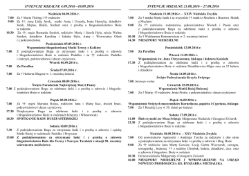 INTENCJE MSZALNE 4.09.2016 –10.09.2016 7.00 9.00 10.30 7.00 7.00 7.00 Niedziela 04.09.2016 r. Za † Marię Thiring i †† rodziców Za ††: żonę Lidię Jurek, matki Annę i Urszulę, brata Henryka, dziadków Jurek, Miętus, Bialik, Szubert oraz z prośbą o błogosławieństwo Boże w rodzinie Za ††: męża Bernarda Sordoń, rodziców Marię i Józefa Hyla, teścia Waltra Sordoń, dziadków Karolinę i Jakuba Hyla, Annę i Wawrzyńca Okoń i z pokrewieństwa Poniedziałek 05.09.2016 r. Wspomnienie błogosławionej Matki Teresy z Kalkuty Z podziękowaniem Bogu za otrzymane łaski i z prośbą o zdrowie i błogosławieństwo Boże w rodzinie Pudelko i za †† rodziców Pudelko i Jończyk, pokrewieństwo i dusze czyśćcowe Wtorek 06.09.2016 r. Za Parafian Środa 07.09.2016 r. Za † Huberta Długosz w 1. rocznicę śmierci Czwartek 08.09.2016 r. Święto Narodzenia Najświętszej Maryi Panny 7.00 Z podziękowaniem Bogu za odebrane łaski i z prośbą o zdrowie i błogosławieństwo Boże w rodzinie 7.00 17.30 18.30 7.30 13.00 Piątek 09.09.2016 r. Za ††: męża Mariana Rossa, rodziców Jana i Martę Kuc, dwóch braci, pokrewieństwo i dusze czyśćcowe Dziękczynna Bogu za odebrane łaski i z prośbą o zdrowie i błogosławieństwo Boże w rodzinach Kluczny i Wiktorowski SPOTKANIE RADY DUSZPASTERSKIEJ Sobota 10.09.2016 r. Z podziękowaniem Bogu za otrzymane łaski i z prośbą o zdrowie i opiekę Matki Bożej w rodzinach: Pudelko i Przywara Z podziękowaniem za otrzymane łaski i z prośbą o zdrowie błogosławieństwo Boże dla Teresy i Narcyza Turskich z okazji 50. rocznicy sakramentu małżeństwa INTENCJE MSZALNE 21.08.2016 – 27.08.2016 10.30 14.30 Niedziela 11.09.2016 r. – XXIV Niedziela Zwykła Za † matkę Marię Janik i za wszystkie †† matki z Mechnic z Bractwa Matek z Mechnic Za †† rodziców, rodzeństwo, pokrewieństwo Wiench i Pasoń oraz z podziękowaniem Bogu za odebrane łaski z prośbą o zdrowie i błogosławieństwo Boże w rodzinie Za † Waldemara Romanowicza w 2. rocznicę śmierci NIESZPORY NIEDZIELNE 7.00 Za Parafian 7.00 9.00 Poniedziałek 12.09.2016 r. Wtorek 13.09.2016 r. Wspomnienie św. Jana Chryzostoma, biskupa i doktora Kościoła 17.30 Z podziękowaniem za odebrane łaski i z prośbą o zdrowie i błogosławieństwo Boże w rodzinie Dziadkiewicz-Majer oraz za †† babcie i dziadków Środa 14.09.2016 r. Święto Podwyższenia Krzyża Świętego 7.00 Intencja wolna Czwartek 15.09.2016 r. Wspomnienie Matki Bożej Bolesnej 7.00 Za † Marię, †† rodziców, brata Piotra, z pokrewieństwa i dusze czyśćcowe Piątek 16.09.2016 r. Wspomnienie Świętych męczenników Korneliusza, papieża i Cypriana, biskupa 7.00 Za † Rozalię Lysy w 30. dzień po śmierci 11.00 12.30 7.00 9.00 10.30 16.00 Sobota 17.09.2016 r. Ślub rzymski (ze Mszą świętą): Małgorzata Niedziela i Grzegorz Zwiorek Z podziękowaniem Bogu za odebrane łaski i z prośbą o zdrowie i błogosławieństwo Boże w rodzinie Niedziela 18.09.2016 r. – XXV Niedziela Zwykła Od nowożeńców Agnieszki i Andrzeja Tyrcha za rodziców z obu stron z podziękowaniem za otrzymane łaski i z prośbą o zdrowie i błog. Boże Za †† rodziców Jana Martę Gonsior, Łucję Gintra Wieczorek, szwagra, szwagierkę , bratową †† z rodziny Chrobok, babcie, dziadków, d.cz. oraz o zdrowie i błogosław. Boże w rodzinie Od nowożeńców Małgorzaty i Grzegorza Zwiorek NIESZPORY NIEDZIELNE I WPROWADZENIE NA URZĄD NOWEGO PROBOSZCZA KS. RYSZARDA MICHALIKA W 614 r. na Ziemię Świętą napadli Persowie pod wodzą Chozroeza. Zburzyli wówczas wszystkie kościoły, także i kościół Bożego Grobu, a wiedząc, jak wielkiej czci doznaje Krzyż Pana Jezusa, zabrali go ze sobą. Cały świat modlił się o odzyskanie Krzyża Świętego. Po zwycięstwie, jakie cesarz Herakliusz odniósł nad Chozroezem, w traktacie pokojowym Persowie zostali zmuszeni do oddania świętej relikwii (628). Podanie głosi, że kiedy sam cesarz chciał na swoich ramionach zanieść Krzyż Chrystusa na Kalwarię, mógł to uczynić dopiero wówczas, kiedy zdjął swoje królewskie szaty. Jest to legenda, gdyż ze świadectwa św. Cyryla Jerozolimskiego (+ 387) wiemy, że już za jego czasów czcigodną relikwię podzielono na drobne części i rozesłano je niemal po wszystkich okolicznych kościołach. Kościół w Krzyżu Jezusa widział zawsze ołtarz, na którym Syn Boży dokonał zbawienia świata. Dlatego każda jego cząstka, tak obficie zroszona Jego Najświętszą Krwią, doznawała zawsze szczególnej czci. Nie chodzi w tym wypadku o autentyczność poszczególnych relikwii, ale o fakt, że przypominają one Krzyż Chrystusa i wielkie dzieło, jakie się na nim dokonało dla dobra rodzaju ludzkiego. O ukrzyżowaniu Pana Jezusa piszą wszyscy Ewangeliści. Co więcej, podają bardzo szczegółowe okoliczności tego wydarzenia. Według świadectwa Ewangelistów Pan Jezus został ukrzyżowany około godziny 12, a umarł o godzinie 15. Jego pogrzeb odbył się ok. godziny 17. Kara ukrzyżowania była u Żydów znana, chociaż w prawie mojżeszowym nie była przewidziana. Aleksander Janneusz (103-76 przed Chrystusem) użył jej dla ukarania zbuntowanych przeciwko niemu faryzeuszów. Taką karę stosowali powszechnie Fenicjanie, Kartagińczycy, Persowie i Rzymianie. Ci ostatni jednak nie stosowali jej wobec obywateli rzymskich. Była to bowiem kara uznawana za hańbiącą i bardzo okrutną. Skazańca odzierano z szat, rzucano go na ziemię, rozciągano mu ramiona i nogi, przybijając je do krzyża. Skazaniec konał z omdlenia i gorączki, dusił się. Na domiar złego wisielca nękało mnóstwo komarów, a bywało, że konającego rozrywały sępy. Krzyż miał zwykle kształt litery T (tau). Ponieważ śmierć na krzyżu miała wszystkie znamiona hańby, dlatego cesarz Konstantyn Wielki zniósł karę śmierci przez ukrzyżowanie (316). Krzyż Chrystusa czci się także czyniąc znak krzyża. Poc