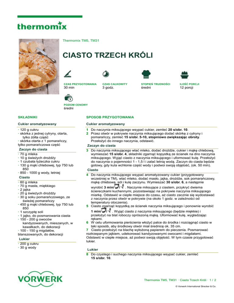 Thermomix TM5, TM31 CIASTO TRZECH KRÓLI CZAS PRZYGOTOWANIA CZAS CAŁKOWITY STOPIEŃ TRUDNOŚCI ILOŚĆ PORCJI 30 min 3 godz. średni 12 porcji POZIOM CENOWY średni SKŁADNIKI SPOSOB PRZYGOTOWANIA Cukier aromatyzowany Cukier aromatyzowany · 120 g cukru · skórka z jednej cytryny, otarta, tylko żółta część · skórka otarta z 1 pomarańczy, tylko pomarańczowa część Zaczyn do ciasta · 70 g mleka · 10 g świeżych drożdży · 1 czubata łyżeczka cukru · 130 g mąki chlebowej, typ 750 lub 850 · 850 - 1000 g wody, letniej Ciasto · 60 g mleka · 70 g masła, miękkiego · 2 jajka · 20 g świeżych drożdży · 30 g soku pomarańczowego, ze świeżej pomarańczy · 450 g mąki chlebowej, typ 750 lub 850 · 1 szczyptę soli · 1 jajko, do posmarowania ciasta · 150 - 200 g owoców kandyzowanych, mieszanych, w kawałkach, do dekoracji · 100 - 150 g migdałów, blanszowanych, do dekoracji Lukier · 200 g cukru · 30 g wody 1 Do naczynia miksującego wsypać cukier, zemleć 20 s/obr. 10. 2 Przez otwór w pokrywie naczynia miksującego dodać skórkę z cytryny i pomarańczy, zemleć 15 s/obr. 5-10, stopniowo zwiększając obroty. Przełożyć do innego naczynia, odstawić. Zaczyn do ciasta 3 Do naczynia miksującego wlać mleko, dodać drożdże, cukier i mąkę chlebową, wymieszać 15 s/obr. 4, składniki zgarnąć kopystką ze ścianek na dno naczynia miksującego. Wyjąć ciasto z naczynia miksującego i uformować kulę. Przełożyć do naczynia o pojemności 1 - 1,5 l i zalać letnią wodą. Zaczyn do ciasta będzie gotowy, gdy kula wchłonie część wody i podwoi swoją objętość, (ok. 50 min). Ciasto 4 Do naczynia miksującego wsypać aromatyzowany cukier (przygotowany wcześniej w TM), wlać mleko, dodać masło, jajka, drożdże, sok pomarańczowy, mąkę chlebową, sól i kulę zaczynu. Wymieszać 30 s/obr. 6, a następnie wyrobić 3 min/ / . Naczynie miksujące z ciastem, przykryć dwiema ściereczkami kuchennymi, pozostawiając na pokrywie naczynia miksującego miarkę. Odstawić w ciepłe miejsce do czasu, aż ciasto zacznie się wydostawać z naczynia przez otwór w pokrywie (na około 1 godz. w zależności od temperatury otoczenia). 5 Ciasto zgarnąć kopystką ze ścianek naczynia miksującego i ponownie wyrobić 1 min/ / . Wyjąć ciasto z naczynia miksującego (będzie miękkie) i przełożyć na blat roboczy oprószoną mąką. Uformować kulę, wygładzając rękami. 6 W celu uformowania pierścienia włożyć palce do środka i rozciągnąć ciasto w taki sposób, aby środkowy otwór miał średnicę ok. 35 cm. 7 Ciasto przełożyć na blachę wyłożoną papierem do pieczenia. Posmarować roztrzepanym jajkiem, udekorować kandyzowanymi owocami i migdałami. Odstawić w ciepłe miejsce, aż podwoi swoją objętość. W tym czasie przygotować lukier. Lukier 8 Do czystego i suchego naczynia miksującego wsypać cukier, zemleć 15 s/obr. 10. Thermomix TM5, TM31 · Ciasto Trzech Króli · 1 / 2 © Vorwerk International Strecker & Co. PRZYDATNE PRZYBORY · skrobak do cytrusów lub nóż do obierania ziemniaków 9 Dodać wodę, wymieszać 20 s/obr. 3 - 4. Przed rozpoczęciem pieczenia, lukrem polać ciasto. 10 Rozgrzać piekarnik do temp. 200°C. Piec 5 min (200°C), a następnie obniżyć temperaturę do 180°C i piec jeszcze przez 15 - 20 min (180°C). · miska WSKAZÓWKA · 2 ściereczki · Aby ciasto dobrze wyrosło, można wcześniej rozgrzać piekarnik do temp. 30°C - · blacha i papier do pieczenia 50°C i odstawić ciasto do piekarnika, następnie uchylić drzwiczki piekarnika. WARTOŚCI ODŻYWCZE Wartość energetyczna 1821 kJ / 435 kcal Białko 8g Węglowodany 77 g Tłuszcze 11 g CZĘŚCI THERMOMIXA kopystka, miarka Thermomix TM5, TM31 · Ciasto Trzech Króli · 2 / 2 © Vorwerk International Strecker & Co.