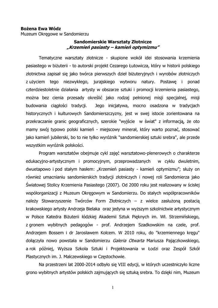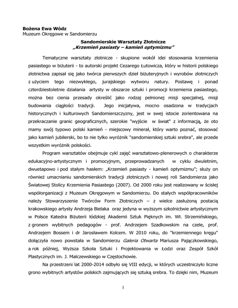 Bożena Ewa Wódz Muzeum Okręgowe w Sandomierzu Sandomierskie Warsztaty Złotnicze „Krzemień pasiasty – kamień optymizmu” Tematyczne warsztaty złotnicze - skupione wokół idei stosowania krzemienia pasiastego w biżuterii - to autorski projekt Cezarego Łutowicza, który w historii polskiego złotnictwa zapisał się jako twórca pierwszych dzieł biżuteryjnych i wyrobów złotniczych z użyciem tego niezwykłego, jurajskiego wytworu natury. Postawę i ponad czterdziestoletnie działania artysty w obszarze sztuki i promocji krzemienia pasiastego, można bez cienia przesady określić jako rodzaj pełnionej misji specjalnej, misji budowania ciągłości tradycji. Jego inicjatywa, mocno osadzona w tradycjach historycznych i kulturowych Sandomierszczyzny, jest w swej istocie zorientowana na przekraczanie granic geograficznych, szerokie "wyjście w świat" z informacją, że oto mamy swój typowo polski kamień - miejscowy minerał, który warto poznać, stosować jako kamień jubilerski, bo to nie tylko wyróżnik "sandomierskiej sztuki srebra", ale przede wszystkim wyróżnik polskości. Program warsztatów obejmuje cykl zajęć warsztatowo-plenerowych o charakterze edukacyjno-artystycznym i promocyjnym, przeprowadzanych w cyklu dwuletnim, dwuetapowo i pod stałym hasłem: „Krzemień pasiasty - kamień optymizmu”; służy on również umacnianiu sandomierskich tradycji złotniczych i nowej roli Sandomierza jako Światowej Stolicy Krzemienia Pasiastego (2007). Od 2000 roku jest realizowany w ścisłej współorganizacji z Muzeum Okręgowym w Sandomierzu. Do stałych współpracowników należy Stowarzyszenie Twórców Form Złotniczych – z wielce zasłużoną postacią krakowskiego artysty Andrzeja Bielaka oraz jedyna w wyższym szkolnictwie artystycznym w Polsce Katedra Biżuterii łódzkiej Akademii Sztuk Pięknych im. Wł. Strzemińskiego, z gronem wybitnych pedagogów - prof. Andrzejem Szadkowskim na czele, prof. Andrzejem Bossem i dr Jarosławem Kolcem. W 2010 roku, do "krzemiennego kręgu" dołączyła nowo powstała w Sandomierzu Galeria Otwarta Mariusza Pajączkowskiego, a rok później, Wyższa Szkoła Sztuki i Projektowania w Łodzi oraz Zespół Szkół Plastycznych im. J. Malczewskiego w Częstochowie. Na przestrzeni lat 2000-2014 odbyło się VIII edycji, w których uczestniczyło liczne grono wybitnych artystów polskich zajmujących się sztuką srebra. To dzięki nim, Muzeum 1 Okręgowe w Sandomierzu gromadzi (metodą darów) i eksponuje, wyjątkową, niepowtarzalną kolekcję biżuterii z tym rzadkim minerałem. To nie tylko największa w Polsce, ale i jedyna na świecie, świadomie kształtowana kolekcja krzemiennych unikatów. Sandomierski zbiór "warsztatowych" realizacji złotniczych i jubilerskich charakteryzuje otwartość (jest uzupełniany nowymi nabytkami), szeroki przegląd form, stylów autorskich i tendencji zdobniczych panujących we współczesnej sztuce złotniczej; od dzieł nawiązujących do rzeczywistych bądź wyobrażeniowych form neolitycznych po bardzo nowoczesne, ale nie stroniące od metafory i symboliki. Znajdziemy w nim przykłady klasycznej biżuterii, jak i małe formy rzeźbiarskie, obiekty i instalacje - wyroby tradycyjne o charakterze użytkowym oraz pozbawione tej cechy, formy pozautylitarne. Sandomierskie Warsztaty Złotnicze są jedynymi działaniami artystycznymi na świecie, które nie uczą techniki, ale pozwalają doświadczyć sfery metafizycznej zagadnienia, skłaniają do refleksji, pobudzają do tworzenia przedmiotów szczególnych. Aneks 1 ARTYŚCI SANDOMIERSKICH WARSZTATÓW ZŁOTNICZYCH "Krzemień pasiasty - kamień optymizmu". 2000-2014 Uczestnicy (65) ANDRZEJ BIELAK (Kraków) * AGATA BIEŃKOWSKA (Sulejówek) * KRZYSZTOF BOGUSŁAWSKI (Słupsk) * ANDRZEJ BOSS (Łódź) * KRZYSZTOF DAROWSKI (Tarnobrzeg) * MAGDALENA DĄBROWSKA (Łódź) * ANNA EWA DŁUGOŁĘCKA (Marki) * ANNA DOMAŃSKA (Warszawa) * EWA EFFENBERG (Łódź) * KATARZYNA FEJDYSZ-GRONECKA (Łowicz) * MARIUSZ GLIWIŃSKI (Sopot) * KAROLINA GŁADYSZ (Iwonicz-Zdrój) * PAULINA GŁĄB (ZSP Częstochowa) * OLGA GOŁĄBEK (ZSP Częstochowa) * TOMASZ JAGIEŁŁO-PIWOSZCZUK (Kraków) * ADAM KACZMAREK (ZSP Częstochowa) * KRZYSZTOF KACZYŃSKI (Sopot) * ALBERT KALETA (Kraków) * DOROTA KEMPKO (Łódź) * JOANNA KILANOWICZ-BOSEK (Otwock) * EWA KLIMCZAK (ZSP Częstochowa) * JAROSŁAW KOLEC (Łódź) * MARIUSZ KONDRACIUK (Łódź) * NORBERT KOTWICKI (Złotów) * ROMAN KOWALKOWSKI (Warszawa) * JUDYTA CECYLIA KRASIŃSKA- DARNOWSKA (Łódź) * JERZY KRZYSZTOF KRET (Kielce) * SERGIUSZ KUCHCZYŃSKI (Łódź) * ELŻBIETA KURKIEWICZ (Łódź) * MARYNA LEWICKA-WALA *1941+2011 (Kraków) * CEZARY ŁUTOWICZ (Sandomierz) * MONIKA MIODEK (Łódź) * MAŁGORZATA MOTYKA-MADEJ (Bielsko-Biała) * YULIIA MYRONCHUK (Zdołbunów na Ukrainie, Łódź) * MARCIN NOWAK (Łódź) * PAWEŁ OLEKSIŃSKI (Gdynia) * MICHALINA 2 OWCZAREK (Łódź) * ANDRZEJ PACAK(Londyn) * MARIUSZ PAJĄCZKOWSKI (Warszawa) * KRZYSZTOF PIOTROWSKI (Kielce) * OLGA PODFILIPSKA-KRYSIŃSKA (Łódź) * ALEKSANDRA RYBAK (Częstochowa) * BOŻENA SKOWRON (Warszawa) * WOJCIECH SKOWRON (Warszawa) * JACEK SKRZYŃSKI (Łask) * WITOLD SKWARSKI (Łódź) * DOROTA SOKOŁOWSKA (Gliwice) * JÓZEF SOSZYŃSKI (Dwernik) * JUSTYNA STASIEWICZ (Koszalin) * MAGDALENA SZADKOWSKA (Łódź) * BARTOSZ SZCZĘSNY (ZSP Częstochowa) * GRZEGORZ RADOSŁAW ŚLĄCZKA (Rzeszów) * MAŁGORZATA WALUŚ (Łódź) * WIKTORIA ANNA WEBER (Łódź) * DOROTA WIETRZYK (Łódź) * ŻANETA WIDERA-KONDRACIUK (Łódź) * JAN WISZNIEWSKI (Giżycko) * ANNA WOJDAN (Kielce) * MAJA WOŹNIAK (Warszawa) * KATARZYNA WÓJCIK (Warszawa) * RADOSŁAW WÓJCIK (Częstochowa) * PATRYCJA ZALEJSKA (ZSP Częstochowa) * GRAŻYNA ZALEWSKA (Kielce) * KATARZYNA ZIĘBA (Wrocław) * TOMASZ ŻYŁKA (Warszawa) Przyjaciele (14) JAN CHAŁUPCZAK (Sandomierz) * BEATA CIESIELSKA (Warszawa) * JACEK MARIA HOHENSEE (Warszawa) * BARBARA KAŃSKA-BIELAK (Kraków) * RYSZARDA I TOMASZ KRZESIMOWSCY (Sando