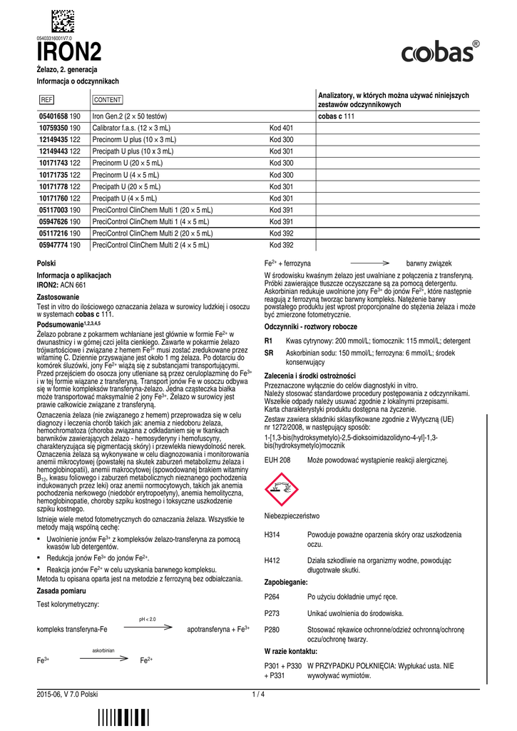 05403316001V7.0 IRON2 Żelazo, 2. generacja Informacja o odczynnikach 05401658 190 10759350 190 12149435 122 12149443 122 10171743 122 10171735 122 10171778 122 10171760 122 05117003 190 05947626 190 05117216 190 05947774 190 Analizatory, w których można używać niniejszych zestawów odczynnikowych cobas c 111 Iron Gen.2 (2 × 50 testów) Calibrator f.a.s. (12 × 3 mL) Precinorm U plus (10 × 3 mL) Precipath U plus (10 x 3 mL) Precinorm U (20 × 5 mL) Precinorm U (4 × 5 mL) Precipath U (20 × 5 mL) Precipath U (4 × 5 mL) PreciControl ClinChem Multi 1 (20 × 5 mL) PreciControl ClinChem Multi 1 (4 × 5 mL) PreciControl ClinChem Multi 2 (20 × 5 mL) PreciControl ClinChem Multi 2 (4 × 5 mL) Kod 401 Kod 300 Kod 301 Kod 300 Kod 300 Kod 301 Kod 301 Kod 391 Kod 391 Kod 392 Kod 392 Polski Fe2+ + ferrozyna Informacja o aplikacjach IRON2: ACN 661 W środowisku kwaśnym żelazo jest uwalniane z połączenia z transferyną. Próbki zawierające tłuszcze oczyszczane są za pomocą detergentu. Askorbinian redukuje uwolnione jony Fe3+ do jonów Fe2+, które następnie reagują z ferrozyną tworząc barwny kompleks. Natężenie barwy powstałego produktu jest wprost proporcjonalne do stężenia żelaza i może być zmierzone fotometrycznie. Zastosowanie Test in vitro do ilościowego oznaczania żelaza w surowicy ludzkiej i osoczu w systemach cobas c 111. Podsumowanie1,2,3,4,5 Żelazo pobrane z pokarmem wchłaniane jest głównie w formie Fe2+ w dwunastnicy i w górnej czci jelita cienkiego. Zawarte w pokarmie żelazo trójwartościowe i związane z hemem Fe3+ musi zostać zredukowane przez witaminę C. Dziennie przyswajane jest około 1 mg żelaza. Po dotarciu do komórek śluzówki, jony Fe2+ wiążą się z substancjami transportującymi. Przed przejściem do osocza jony utleniane są przez ceruloplazminę do Fe3+ i w tej formie wiązane z transferyną. Transport jonów Fe w osoczu odbywa się w formie kompleksów transferyna-żelazo. Jedna cząsteczka białka może transportować maksymalnie 2 jony Fe3+. Żelazo w surowicy jest prawie całkowicie związane z transferyną. Oznaczenia żelaza (nie związanego z hemem) przeprowadza się w celu diagnozy i leczenia chorób takich jak: anemia z niedoboru żelaza, hemochromatoza (choroba związana z odkładaniem się w tkankach barwników zawierających żelazo - hemosyderyny i hemofuscyny, charakteryzująca się pigmentacją skóry) i przewlekła niewydolność nerek. Oznaczenia żelaza są wykonywane w celu diagnozowania i monitorowania anemii mikrocytowej (powstałej na skutek zaburzeń metabolizmu żelaza i hemoglobinopatii), anemii makrocytowej (spowodowanej brakiem witaminy B12, kwasu foliowego i zaburzeń metabolicznych nieznanego pochodzenia indukowanych przez leki) oraz anemii normocytowych, takich jak anemia pochodzenia nerkowego (niedobór erytropoetyny), anemia hemolityczna, hemoglobinopatie, choroby szpiku kostnego i toksyczne uszkodzenie szpiku kostnego. Istnieje wiele metod fotometrycznych do oznaczania żelaza. Wszystkie te metody mają wspólną cechę: ▪ Uwolnienie jonów Fe3+ z kompleksów żelazo-transferyna za pomocą kwasów lub detergentów. ▪ Redukcja jonów Fe3+ do jonów Fe2+. ▪ Reakcja jonów Fe2+ w celu uzyskania barwnego kompleksu. Metoda tu opisana oparta jest na metodzie z ferrozyną bez odbiałczania. Zasada pomiaru Test kolorymetryczny: pH < 2.0 apotransferyna + Fe3+ kompleks transferyna-Fe 2015-06, V 7.0 Polski Odczynniki - roztwory robocze R1 Kwas cytrynowy: 200 mmol/L; tiomocznik: 115 mmol/L; detergent SR Askorbinian sodu: 150 mmol/L; ferrozyna: 6 mmol/L; środek konserwujący Zalecenia i środki ostrożności Przeznaczone wyłącznie do celów diagnostyki in vitro. Należy stosować standardowe procedury postępowania z odczynnikami. Wszelkie odpady należy usuwać zgodnie z lokalnymi przepisami. Karta charakterystyki produktu dostępna na życzenie. Zestaw zawiera składniki sklasyfikowane zgodnie z Wytyczną (UE) nr 1272/2008, w następujący sposób: 1-[1,3-bis(hydroksymetylo)-2,5-dioksoimidazolidyno-4-yl]-1,3bis(hydroksymetylo)mocznik EUH 208 Może powodować wystąpienie reakcji alergicznej. Niebezpieczeństwo H314 Powoduje poważne oparzenia skóry oraz uszkodzenia oczu. H412 Działa szkodliwie na organizmy wodne, powodując długotrwałe skutki. Zapobieganie: P264 Po użyciu dokładnie umyć ręce. P273 Unikać uwolnienia do środowiska. P280 Stosować rękawice ochronne/odzież ochronną/ochronę oczu/ochronę twarzy. W razie kontaktu: askorbinian Fe3+ barwny związek Fe2+ P301 + P330 W PRZYPADKU POŁKNIĘCIA: Wypłukać usta. NIE + P331 wywoływać wymiotów. 1/4 05403316001V7.0 IRON2 Żelazo, 2. generacja P303 + P361 W PRZYPADKU KONTATKU ZE SKÓRĄ (lub z włosami): + P353 Natychmiast usunąć/zdjąć całą zanieczyszczoną odzież. Spłukać skórę pod strumieniem wody/prysznicem. P304 + P340 W PRZYPADKU DOSTANIA SIĘ DO DRÓG ODDECHOWYCH: Wyprowadzić lub wynieść poszkodowanego na świeże powietrze i zapewnić warunki do odpoczynku w pozycji umożliwiającej swobodne oddychanie. P305 + P351 W PRZYPADKU DOSTANIA SIĘ DO OCZU: Ostrożnie + P338 płukać wodą przez kilka minut. Wyjąć soczewki kontaktowe, jeżeli są i można je łatwo usunąć. Nadal płukać. P310 P363 Natychmiast skontaktować się z OŚRODKIEM ZATRUĆ lub lekarzem. Wyprać zanieczyszczoną odzież przed ponownym użyciem. Przechowywanie: P405 Przechowywać pod zamknięciem. Utylizacja: P501 Utylizacja zawartości/pojemnika tylko w miejscu do tego przeznaczonym. Materiały dostarczone w zestawie Patrz "Odczynniki - roztwory robocze" w części o odczynnikach. Niezbędne materiały dodatkowe (niedostarczone w zestawie) Zob. część "Informacje o odczynnikach" Ogólne wyposażenie laboratoryjne Oznaczenie W celu optymalnego działania testu należy stosować się do zaleceń zawartych w niniejszej ulotce dotyczących konkretnego analizatora. Należy postępować zgodnie z poniższą instrukcją obsługi dla operatora, uwzgl