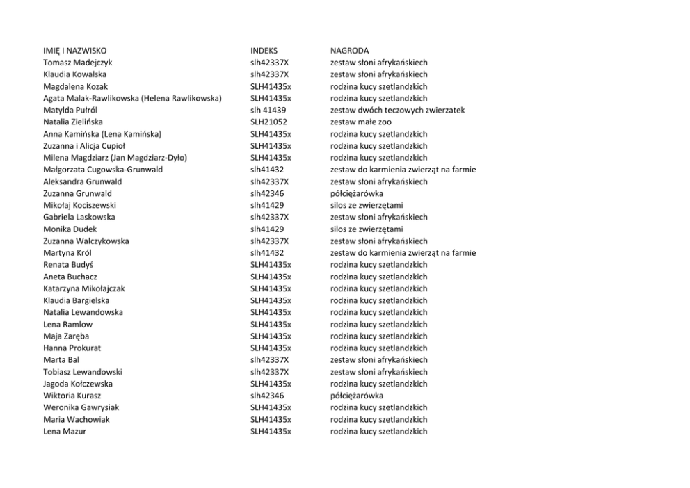 IMIĘ I NAZWISKO Tomasz Madejczyk Klaudia Kowalska Magdalena Kozak Agata Malak-Rawlikowska (Helena Rawlikowska) Matylda Pułról Natalia Zielińska Anna Kamińska (Lena Kamińska) Zuzanna i Alicja Cupioł Milena Magdziarz (Jan Magdziarz-Dyło) Małgorzata Cugowska-Grunwald Aleksandra Grunwald Zuzanna Grunwald Mikołaj Kociszewski Gabriela Laskowska Monika Dudek Zuzanna Walczykowska Martyna Król Renata Budyś Aneta Buchacz Katarzyna Mikołajczak Klaudia Bargielska Natalia Lewandowska Lena Ramlow Maja Zaręba Hanna Prokurat Marta Bal Tobiasz Lewandowski Jagoda Kołczewska Wiktoria Kurasz Weronika Gawrysiak Maria Wachowiak Lena Mazur INDEKS slh42337X slh42337X SLH41435x SLH41435x slh 41439 SLH21052 SLH41435x SLH41435x SLH41435x slh41432 slh42337X slh42346 slh41429 slh42337X slh41429 slh42337X slh41432 SLH41435x SLH41435x SLH41435x SLH41435x SLH41435x SLH41435x SLH41435x SLH41435x slh42337X slh42337X SLH41435x slh42346 SLH41435x SLH41435x SLH41435x NAGRODA zestaw słoni afrykańskiech zestaw słoni afrykańskiech rodzina kucy szetlandzkich rodzina kucy szetlandzkich zestaw dwóch teczowych zwierzatek zestaw małe zoo rodzina kucy szetlandzkich rodzina kucy szetlandzkich rodzina kucy szetlandzkich zestaw do karmienia zwierząt na farmie zestaw słoni afrykańskiech półciężarówka silos ze zwierzętami zestaw słoni afrykańskiech silos ze zwierzętami zestaw słoni afrykańskiech zestaw do karmienia zwierząt na farmie rodzina kucy szetlandzkich rodzina kucy szetlandzkich rodzina kucy szetlandzkich rodzina kucy szetlandzkich rodzina kucy szetlandzkich rodzina kucy szetlandzkich rodzina kucy szetlandzkich rodzina kucy szetlandzkich zestaw słoni afrykańskiech zestaw słoni afrykańskiech rodzina kucy szetlandzkich półciężarówka rodzina kucy szetlandzkich rodzina kucy szetlandzkich rodzina kucy szetlandzkich Laura Liszka SLH41435x Martyna Mrówczyńska (Klaudia Mrówczyńska) SLH41435x Tosia Michalska SLH41435x Marta Zaik-Myślińska (Pola Myślińska) slh42346 Anna Cymerman slh42337X Katarzyna Katarzyna (Lena Jędraszczyk/Katarzyna Jędraszczyk) SLH41435x Tomasz Sobkowiak slh42337X Laura Komenda SLH41435x Antonina Jarzyńska SLH41435x Estera Podlewska slh42337X Krzysztof Stasiak slh 41439 Grzegorz Maj (Magdalena Maj) SLH41435x rodzina kucy szetlandzkich rodzina kucy szetlandzkich rodzina kucy szetlandzkich półciężarówka zestaw słoni afrykańskiech rodzina kucy szetlandzkich zestaw słoni afrykańskiech rodzina kucy szetlandzkich rodzina kucy szetlandzkich zestaw słoni afrykańskiech zestaw dwóch teczowych zwierzatek rodzina kucy szetlandzkich