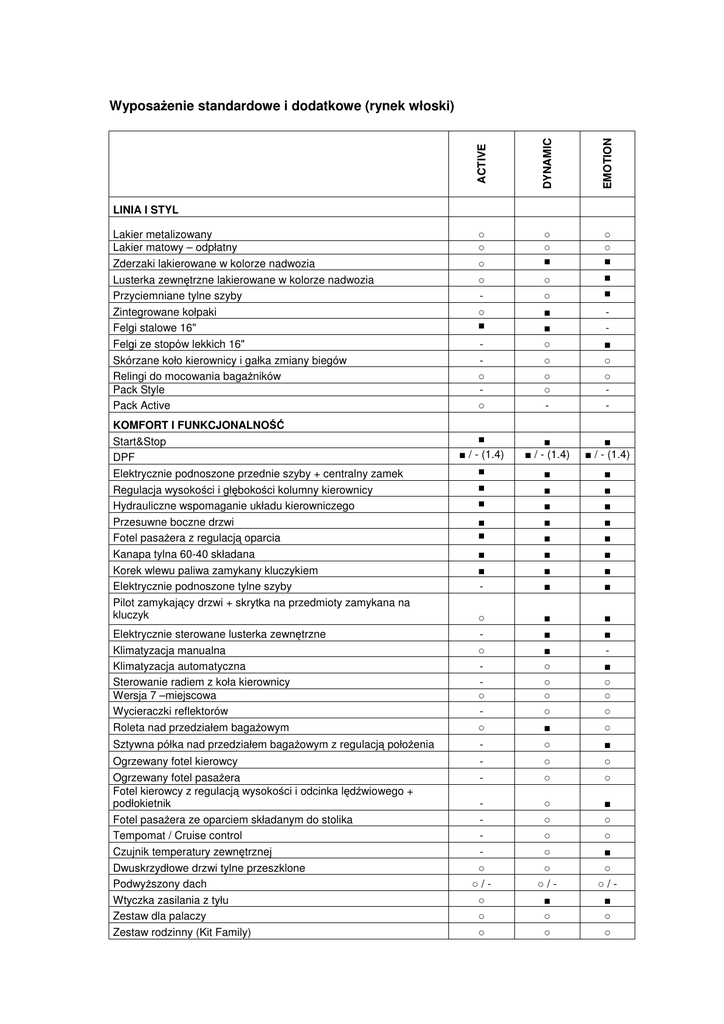 DYNAMIC EMOTION ACTIVE Wyposażenie standardowe i dodatkowe (rynek włoski) ○ ○ ■ ○ ○ ■ ■ ■ LINIA I STYL Lakier metalizowany Lakier matowy – odpłatny Zderzaki lakierowane w kolorze nadwozia Lusterka zewnętrzne lakierowane w kolorze nadwozia Przyciemniane tylne szyby Zintegrowane kołpaki Felgi stalowe 16" Felgi ze stopów lekkich 16" Skórzane koło kierownicy i gałka zmiany biegów Relingi do mocowania bagażników Pack Style Pack Active ○ ○ ○ ○ ○ ■ ○ ○ ■ ■ ○ ○ ○ ○ - ■ ○ ○ - ■ ■ / - (1.4) ■ ■ / - (1.4) ■ ■ - ■ ■ ■ ■ ■ ■ ■ ■ ■ ■ ■ ■ ■ ■ ■ ■ Elektrycznie sterowane lusterka zewnętrzne Klimatyzacja manualna Klimatyzacja automatyczna Sterowanie radiem z koła kierownicy Wersja 7 –miejscowa Wycieraczki reflektorów Roleta nad przedziałem bagażowym ○ ○ ○ ○ ■ ■ ■ ○ ○ ○ ○ ■ ■ ■ ■ ○ ○ ○ ○ Sztywna półka nad przedziałem bagażowym z regulacją położenia - ○ ■ Ogrzewany fotel kierowcy Ogrzewany fotel pasażera Fotel kierowcy z regulacją wysokości i odcinka lędźwiowego + podłokietnik Fotel pasażera ze oparciem składanym do stolika Tempomat / Cruise control Czujnik temperatury zewnętrznej Dwuskrzydłowe drzwi tylne przeszklone Podwyższony dach Wtyczka zasilania z tyłu Zestaw dla palaczy Zestaw rodzinny (Kit Family) - ○ ○ ○ ○ ○ ○/○ ○ ○ ○ ○ ○ ○ ○ ○/■ ○ ○ ■ ○ ○ ■ ○ ○/■ ○ ○ ○ ○ KOMFORT I FUNKCJONALNOŚĆ Start&Stop DPF Elektrycznie podnoszone przednie szyby + centralny zamek Regulacja wysokości i głębokości kolumny kierownicy Hydrauliczne wspomaganie układu kierowniczego Przesuwne boczne drzwi Fotel pasażera z regulacją oparcia Kanapa tylna 60-40 składana Korek wlewu paliwa zamykany kluczykiem Elektrycznie podnoszone tylne szyby Pilot zamykający drzwi + skrytka na przedmioty zamykana na kluczyk ■ ■ / - (1.4) ■ ■ ■ ■ ■ BEZPIECZEŃSTWO ■ ■ ■ ■ ■ ■ ABS czteroczujnikowy + EBD (Electronic Brake Distribution) ESP z Hill-Holderem Poduszki powietrzne z przodu (kierowca + pasażer) Poduszki powietrzne z boku (w tym ochrona kurtynowa) Zagłówki z tyłu Kit fix&go Światła przeciwmgielne Czujnik parkowania Zabezpieczenia przeciwpożarowe Zagłówki przednie zapobiegające urazom kręgów szyjnym (AntiWhiplash) Zabezpieczenie zamków drzwi „Dead lock” Pełnowymiarowe koło zapasowe AUDIO / TELEFONIA / INFORMATYKA Przystosowanie do montazu radioodtwarzacza Głośniki (4 + 2 wysokotonowe) Radio z odtwarzaczem CD, instalacja audio Hi-Fi Radio z odtwarzaczem CD + mp3, instalacja audio Hi-Fi System Blue&me Przygotowanie pod PDA Blue&Me Tom-Tom Pack Blue&Sound MP3 ■ = podstawowe ○ = dodatkowe ■ ■ ○ - ■ ■ ■ ■ ■ ○ ○ ○ ■ ■ ■ ■ ■ ■ ○ ○ ○ ○ ○ ○ ○ ○ ○ ○ ○ ■ ○ ○ - ■ ■ ○ ○ ○ ○ ○ ■ ■ ■ ○ ○ ○ ○ - = niedostępne Zestawienia kolorystyczne zewnętrzne / wewnątrz Wewnątrz na wyposażeniu podstawowym Deska rozdzielcza Szary Wersja wyposażenia Wnętrza Szary Szary Niebieski Szary z wypustkami Czerwony z wypustkami ACTIVE DYNAMIC EMOTION STAR PACMAN TECNOSPACE Czerwony Szary Szary Czerwony Szary Szary Czerwony CZARNYBORDO CZARNYSZARY CZARNY – SZARY CZARNYBORDO CZARNYSZARY CZARNYSZARY CZARNYBORDO Bianco Santarellina / Biały X X X X X X X Rosso Pimpante / Czerwony X X X X - X X Blu Giudizioso / Granat Metalizowane - X X - X X - Avorio Familiare / Kość słoniowa X - X X - X X Rosso Esuberante / Czerwony X X X X - X X Azzurro Idealista / Niebieski - X X - X X - Blu Notturno / Granat Bordeaux Semiserio / Bordo Grigio Impeccabile / Szary X X X X X X X X X X X X X X Grigio Garbato / Szary Nero Coscienza Sporca / Czarny X X X X X X X X X X X X X X Gałka zmiany biegów z dwukolorowej skóry Zewnętrzne Pastelowe