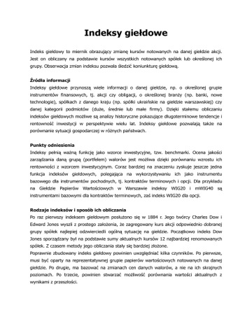 Indeksy giełdowe Indeks giełdowy to miernik obrazujący zmianę kursów notowanych na danej giełdzie akcji. Jest on obliczany na podstawie kursów wszystkich notowanych spółek lub określonej ich grupy. Obserwacja zmian indeksu pozwala śledzić koniunkturę giełdową. Źródła informacji Indeksy giełdowe przynoszą wiele informacji o danej giełdzie, np. o określonej grupie instrumentów finansowych, tj. akcji czy obligacji, o określonej branży (np. banki, nowe technologie), spółkach z danego kraju (np. spółki ukraińskie na giełdzie warszawskiej) czy danej kategorii podmiotów (duże, średnie lub małe firmy). Dzięki stałemu obliczaniu indeksów giełdowych możliwe są analizy historyczne pokazujące długoterminowe tendencje i rentowność inwestycji w perspektywie wielu lat. Indeksy giełdowe pozwalają także na porównanie sytuacji gospodarczej w różnych państwach. Punkty odniesienia Indeksy pełnią ważną funkcję jako wzorce inwestycyjne, tzw. benchmarki. Ocena jakości zarządzania daną grupą (portfelem) walorów jest możliwa dzięki porównaniu wzrostu ich rentowności z wzorcem inwestycyjnym. Coraz bardziej na znaczeniu zyskuje jeszcze jedna funkcja indeksów giełdowych, polegająca na wykorzystywaniu ich jako instrumentu bazowego dla instrumentów pochodnych, tj. kontraktów terminowych i opcji. Dla przykładu na Giełdzie Papierów Wartościowych w Warszawie indeksy WIG20 i mWIG40 są instrumentami bazowymi dla kontraktów terminowych, zaś indeks WIG20 dla opcji. Rodzaje indeksów i sposób ich obliczania Po raz pierwszy indeksem giełdowym posłużono się w 1884 r. Jego twórcy Charles Dow i Edward Jones wyszli z prostego założenia, że zagregowany kurs akcji odpowiednio dobranej grupy spółek najlepiej odzwierciedli ogólną sytuację na giełdzie. Początkowo indeks Dow Jones sporządzany był na podstawie sumy aktualnych kursów 12 najbardziej renomowanych spółek. Z czasem metody jego obliczania stały się bardziej złożone. Poprawnie zbudowany indeks giełdowy powinien uwzględniać kilka czynników. Po pierwsze, musi być oparty na reprezentatywnej grupie papierów wartościowych notowanych na danej giełdzie. Po drugie, ma bazować na zmianach cen danych walorów, a nie na ich skrajnych poziomach. Po trzecie, powinien stwarzać możliwość porównania wartości aktualnych z wynikami z przeszłości. Istnieją dwa podstawowe rodzaje indeksów giełdowych – indeksy dochodowe i indeksy cenowe. Indeksy dochodowe umożliwiają obserwację łącznej zmiany cen danej grupy akcji wraz z przypisanymi tym akcjom prawami majątkowym, tj. prawami do dywidendy czy też prawami poboru akcji; pozwalają łatwo ocenić rentowność inwestycji giełdowych przez porównanie ich do innych form lokowania kapitału. Indeksy cenowe bazują jedynie na odnotowywaniu zmian cen akcji. Ważny jest też podział mierników koniunktury giełdowej na indeksy szerokiego portfela oraz indeksy wąskiego portfela. Te pierwsze uwzględniają wszystkie spółki z danego rynku. Te drugie odnoszą się do wybranej grupy spółek. W obrocie giełdowym można się jeszcze spotkać z pojęciem subindeksu giełdowego. Jest to również indeks giełdowy, ale obliczony tylko dla spółek należących do określonego sektora gospodarki. Indeksy giełdowe stosowane na GPW Giełda Papierów Wartościowych w Warszawie publikuje indeksy giełdowe od 16 kwietnia 1991 r. W początkowym okresie działalności notowanych było jedynie pięć spółek, dla których obliczano Warszawski Indeks Giełdowy (WIG). Wraz z rozwojem polskiego rynku kapitałowego wzrastała liczba stosowanych indeksów i subindeksów. Obecnie stołeczna giełda publikuje 22 tego typu wskaźniki. Wartości indeksów mogą być aktualizowane na bieżąco (co 15 sekund) podczas trwania notowań ciągłych (np. WIG, WIG20 czy mWIG40) lub też ogłaszane trzykrotnie w trakcie sesji giełdowej (np. WIG-banki, WIG-energia). Wiarygodność indeksu giełdowego zależy od wiarygodności notowanych spółek. Z tego powodu GPW stworzyła kryteria bazowe, które muszą spełniać spółki wchodzące w skład któregokolwiek indeksu. Zgodnie z tymi kryteriami: – liczba akcji danej spółki w wolnym obrocie musi być większa niż 10 proc., – wartość akcji danej spółki w wolnym obrocie musi być większa niż 1 mln euro, – spółka nie może być oznaczona w sposób szczególny, – spółka nie może znajdować się w trudnej sytuacji (być zakwalifikowana do subsegmentu Minus 5 skupiającego firmy o małej kapitalizacji, figurować na Liście Alertów lub pozostawać w Strefie Niskiej Płynności). WIG20 Indeksem o największym znaczeniu na warszawskiej giełdzie jest WIG20. Po raz pierwszy obliczony został 16 kwietnia 1994 r. Jest on wyznaczany na podstawie wartości portfela akcji 20 największych i najbardziej płynnych spółek z rynku głównego GPW. Pierwsza wartość indeksu wynosiła 1000 pkt. WIG20 jest indeksem typu cenowego. Nie może w nim uczestniczyć więcej niż pięć spółek z jednego sektora giełdowego. WIG20 jest indeksem bazowym dla indeksów WIG20short i WIG20lev. Do obliczania WIG20 służy formuła WIG20(t) = M(t) / [M(0) x K(t)] x 1000, gdzie: – M(t) oznacza kapitalizację portfela indeksu na sesji „t” – M(0) to kapitalizacja portfela indeksu w dniu bazowym (16 kwietnia 1994 r.) – K(t) to współczynnik korygujący indeks na sesji „t”. Oprócz WIG20 oblicza się wiele innych indeksów istotnych dla warszawskiego parkietu. Najstarszym z nich jest WIG. Jego pierwsza publikacja miała miejsce 16 kwietnia 1991 r. Jest to indeks typu dochodowego i wskazuje on rentowność inwestycji we wszystkie akcje znajdujące się w obrocie na GPW. Innym ważnym indeksem jest mWIG40 będący kontynuacją indeksu MIDWIG. Jest to indeks typu cenowego obejmujący 40 średnich spółek notowanych na GPW. Z indeksu mWIG40 wykluczone są spółki z indeksów WIG20 i sWIG80 oraz spółki zagr