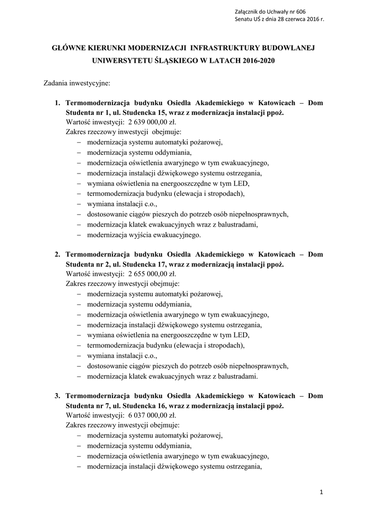 Załącznik do Uchwały nr 606 Senatu UŚ z dnia 28 czerwca 2016 r. GŁÓWNE KIERUNKI MODERNIZACJI INFRASTRUKTURY BUDOWLANEJ UNIWERSYTETU ŚLĄSKIEGO W LATACH 2016-2020 Zadania inwestycyjne: 1. Termomodernizacja budynku Osiedla Akademickiego w Katowicach – Dom Studenta nr 1, ul. Studencka 15, wraz z modernizacja instalacji ppoż. Wartość inwestycji: 2 639 000,00 zł. Zakres rzeczowy inwestycji obejmuje: - modernizacja systemu automatyki pożarowej, - modernizacja systemu oddymiania, - modernizacja oświetlenia awaryjnego w tym ewakuacyjnego, - modernizacja instalacji dźwiękowego systemu ostrzegania, - wymiana oświetlenia na energooszczędne w tym LED, - termomodernizacja budynku (elewacja i stropodach), - wymiana instalacji c.o., - dostosowanie ciągów pieszych do potrzeb osób niepełnosprawnych, - modernizacja klatek ewakuacyjnych wraz z balustradami, - modernizacja wyjścia ewakuacyjnego. 2. Termomodernizacja budynku Osiedla Akademickiego w Katowicach – Dom Studenta nr 2, ul. Studencka 17, wraz z modernizacją instalacji ppoż. Wartość inwestycji: 2 655 000,00 zł. Zakres rzeczowy inwestycji obejmuje: - modernizacja systemu automatyki pożarowej, - modernizacja systemu oddymiania, - modernizacja oświetlenia awaryjnego w tym ewakuacyjnego, - modernizacja instalacji dźwiękowego systemu ostrzegania, - wymiana oświetlenia na energooszczędne w tym LED, - termomodernizacja budynku (elewacja i stropodach), - wymiana instalacji c.o., - dostosowanie ciągów pieszych do potrzeb osób niepełnosprawnych, - modernizacja klatek ewakuacyjnych wraz z balustradami. 3. Termomodernizacja budynku Osiedla Akademickiego w Katowicach – Dom Studenta nr 7, ul. Studencka 16, wraz z modernizacją instalacji ppoż. Wartość inwestycji: 6 037 000,00 zł. Zakres rzeczowy inwestycji obejmuje: - modernizacja systemu automatyki pożarowej, - modernizacja systemu oddymiania, - modernizacja oświetlenia awaryjnego w tym ewakuacyjnego, - modernizacja instalacji dźwiękowego systemu ostrzegania, 1 - wymiana oświetlenia na energooszczędne w tym LED, modernizacja instalacji hydrantowej, termomodernizacja budynku (elewacja i stropodach), usunięcie i utylizacja szkodliwych płyt zawierających azbest, wymiana instalacji c.o., dostosowanie ciągów pieszych do potrzeb osób niepełnosprawnych, wymiana drzwi wejściowych na przesuwne z dostosowaniem do potrzeb osób niepełnosprawnych, adaptacja rampy na podjazd do potrzeb osób niepełnosprawnych, modernizacja schodów ewakuacyjnych, modernizacja pokoi wraz z węzłami sanitarnymi do potrzeb osób niepełnosprawnych, roboty towarzyszące w tym wymiana instalacji odgromowej. 4. Przebudowa budynku Wydziału Filologicznego Uniwersytetu Śląskiego przy placu Sejmu Śląskiego 1 w Katowicach wraz ze zmianą sposobu użytkowania. Wartość inwestycji: 7 519 000,00 zł. Zakres rzeczowy inwestycji obejmuje: - instalację sygnalizacji pożaru, dźwiękowy system ostrzegania, system klap i okien oddymiających jak również instalację oświetlenia ewakuacyjnego oraz oświetlenia awaryjnego, - wydzielenie stref pożarowych – wydzielenie klatek schodowych i wymiana części drzwi na drzwi o odporności ogniowej, - rozbudowę sieci logicznej łącznie z siecią dedykowaną, - modernizację trzech sal wykładowych oraz korytarza parteru, I, II, III i IV piętra wraz z klatkami schodowymi, - przebudowę korytarza suteren, - przebudowę sanitariatów w suterenie, na parterze I, II, III, IV i V piętrze, - przebudowę dachu, - likwidację barier architektonicznych – ciągi komunikacyjne, sanitariaty, platformy schodowe, - przebudowę sali konsumpcyjnej bufetu na poziomie suteren na salę dydaktyczną, - przebudowę dużego zespołu sanitariatów damskich na IV piętrze, na potrzeby sali wykładowej, - wykonanie instalacji wodociągowej (hydrantowej) przeciwpożarowej. 5. Termomodernizacja budynku Wydziału w Katowicach przy ul. Bankowej 14 Wartość inwestycji: 10 204 852,00 zł. Zakres rzeczowy inwestycji obejmuje: - ocieplenie stropodachu, Matematyki, Fizyki i Chemii 2 - wymiana oświetlenia wbudowanego, - wymiana instalacji c.o. z wymiennikiem i wentylacji mechanicznej z odzyskiem ciepła, - wymiana wskazanych okien i ścian oszklonych, - ocieplenie stropodachów łączników, - ocieplenie ścian piwnicy do gruntu, - ocieplenie ściany gr. 35 cm, - wymiana drzwi. 6. Przebudowa i remont budynku przy ul. Bankowej 5 w Katowicach wraz ze zmianą sposobu użytkowania części pomieszczeń i projektem zagospodarowania terenu: 1) renowacja zabytkowej elewacji budynku Wartość inwestycji: 1 880 000,00 zł. Projekt elewacji uzgodniony ze Śląskim Wojewódzkim Konserwatorem Zabytków w Katowicach uzyskał pozwolenie nr 1724/2015 z dnia 28.08.2015 r. na prowadzenie robót budowlanych i konserwatorskich przy zabytku wpisanym do rejestru zabytków oraz zmianę sposobu korzystania z zabytku. Program prac konserwatorskich: - usunięcie wtórnego żywicznego tynku oraz zdestruowanego tynku pierwotnego, - zabezpieczenie murów ceglanych przed wzrostem mikrobiologicznym, - wykonanie systemowych tynków renowacyjnych, - malowanie farbą elewacyjną (kolorystyka pierwotna), - laserowe oczyszczenie detali wystroju architektonicznego - sztuczny kamień, - wymiana rynien, rur spustowych, obróbek blacharskich i części pokrycia dachu. 2) Laboratorium Inicjatyw Społecznych i Integracji Twórczej wartość inwestycji: 12 260 683,00 zł. Trwają prace związane z wykonaniem projektów wykonawczych przebudowy budynku i dostosowania wnętrz na potrzeby opisanego projektu. Posiadamy projekt budowlany i pozwolenie na prowadzenie robót budowlanych i konserwatorskich przy zabytku wpisanym do rejestru zabytków oraz zmianę sposobu korzystania z zabytku. 7. SPINplace – przestrzeń kreatywna, coworkingu i współpracy z gospodarką, ul. Uniwersytecka Wartość inwestycji: 2 000 000,00 zł. Celem projektu jest stworzenie ogólnouczelnianego centrum kreatywności, coworkingu, prototypow