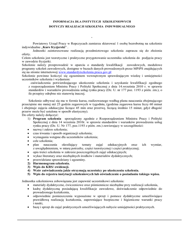 INFORMACJA DLA INSTYTUCJI SZKOLENIOWYCH DOTYCZY REALIZACJI SZKOLENIA INDYWIDUALNEGO . Powiatowy Urząd Pracy w Ropczycach zamierza skierować 1 osobę bezrobotną na szkolenie indywidualne „Kurs fryzjerski” . Jednostki zainteresowane realizacją przedmiotowego szkolenia zaprasza się do złożenia oferty. Celem szkolenia jest teoretyczne i praktyczne przygotowanie uczestnika szkolenia do podjęcia pracy w zawodzie fryzjerki. Szkolenie należy przeprowadzić w oparciu o standardy kwalifikacji zawodowych, modułowe programy szkoleń zawodowych, dostępne w bazach danych prowadzonych przez MPiPS znajdujących się na stronie internetowej www.standardyiszkolenia.praca.gov.pl Szkolenie powinno kończyć się egzaminem wewnętrznym sprawdzającym wiedzę i umiejętności uczestników szkolenia i wydaniem: -zaświadczenia potwierdzającego ukończenie szkolenia i uzyskanie kwalifikacji zgodnego z rozporządzeniem Ministra Pracy i Polityki Społecznej z dnia 14.września 2010 r. w sprawie standardów i warunków prowadzenia usług rynku pracy (Dz. U. nr 177 poz. 1193 z późn. zm.), o ile przepisy odrębne nie stanowią inaczej. Szkolenie odbywać się ma w formie kursu, realizowanego według planu nauczania obejmującego przeciętnie nie mniej niż 25 godzin zegarowych w tygodniu, (godzina zegarowa kursu liczy 60 minut i obejmuje zajęcia edukacyjne liczące 45 min oraz przerwę, liczącą średnio 15 minut, gdyż długość przerw może być ustalona w sposób elastyczny). Do oferty należy dołączyć: 1) Program szkolenia sporządzony zgodnie z Rozporządzeniem Ministra Pracy i Polityki Społecznej z dnia 14 września 2010r. w sprawie standardów i warunków prowadzenia usług rynku pracy (Dz. U. Nr 177, poz.1193 z późn. zm.) zawierający w szczególności: nazwę i zakres szkolenia; czas trwania i sposób organizacji szkolenia; wymagania wstępne dla uczestników szkolenia; cele szkolenia; plan nauczania określający tematy zajęć edukacyjnych oraz ich wymiar, z uwzględnieniem, w miarę potrzeby, części teoretycznej i części praktycznej; opis treści szkolenia w zakresie poszczególnych zajęć edukacyjnych; wykaz literatury oraz niezbędnych środków i materiałów dydaktycznych; przewidziane sprawdziany i egzaminy. 2) Harmonogram szkolenia. 3) Wpis do KRS/ ewidencji. 4) Wzór zaświadczenia jakie otrzymają uczestnicy po ukończeniu szkolenia. 5) Wpis do rejestru instytucji szkoleniowych lub oświadczenie o posiadaniu takiego wpisu. Jednostka szkoleniowa zobowiązana jest zapewnić uczestnikowi szkolenia: materiały dydaktyczne, ćwiczeniowe oraz piśmiennicze niezbędne przy realizacji szkolenia, kadrę dydaktyczną posiadającą kwalifikacje zawodowe, doświadczenie odpowiednie do prowadzonego kształcenia, odpowiednie pomieszczenia wyposażone w sprzęt i pomoce dydaktyczne umożliwiające prawidłową realizację kształcenia, zapewniające bezpieczne i higieniczne warunki pracy i nauki, bazę i sprzęt do zajęć praktycznych umożliwiających nabycie umiejętności praktycznych. IInnssttyyttuuccjjaa sszzkkoolleenniioow waa m maa oobboow wiiąązzeekk uubbeezzppiieecczzyyćć oossoobbęę sskkiieerroow waannąą nnaa sszzkkoolleenniiee,, kkttóórryy w w ttrraakkcciiee sszzkkoolleenniiaa ppooddjjąąłł zzaattrruuddnniieenniiee,, iinnnnąą pprraaccęę zzaarroobbkkoow wąą lluubb ddzziiaałłaallnnoośśćć ggoossppooddaarrcczząą ii kkoonnttyynnuuuujjee sszzkkoolleenniiee oodd nnaassttęęppssttw w nniieesszzcczzęęśślliiw wyycchh w wyyppaaddkkóów w ppoow wssttaałłyycchh w w zzw wiiąązzkkuu zzee sszzkkoolleenniieem m oorraazz w w ddrrooddzzee ddoo m i e j s c a s z k o l e n i a i z p o w r o t e m . miejsca szkolenia i z powrotem. Prosimy o składanie ofert do 10.10.2013r. Szkolenie należy przeprowadzić w miesiącu październik –listopad 2013r. Zaleca się złożenia oferty na formularzu ofertowym zamieszczonym poniżej. W przypadku przygotowania oferty na innym formularzu muszą być w nim zawarte wszelkie informacje zawarte w formularzu ofertowym przygotowanym przez PUP w Ropczycach. Oferty można przesyłać faxem, pocztą lub drogą elektroniczną. Powiatowy Urząd Pracy w Ropczycach ul. Najświętszej Marii Panny 2 39-100 Ropczyce Tel. 17 2231692 Fax. 17 2227569 e-mail: [email protected] Wybór instytucji szkoleniowej zostanie dokonany na podstawie następujących kryteriów: 1. Dostosowanie programu szkolenia odpowiednio do identyfikowanego na rynku pracy zapotrzebowania na kwalifikacje 2. Jakość oferowanego programu szkolenia, w tym wykorzystanie standardów kwalifikacji zawodowych i 3. 4. 5. 6. 7. 8. modułowych programów szkoleń zawodowych, dostępnych w bazach danych prowadzonych przez ministra Certyfikaty jakości usług posiadane przez instytucję szkoleniową Dostosowanie kwalifikacji i doświadczenia kadry dydaktycznej do zakresu szkolenia Dostosowanie wyposażenia dydaktycznego i pomieszczeń do potrzeb szkolenia, z uwzględnieniem bezpiecznych i higienicznych warunków realizacji szkolenia Rodzaj dokumentów potwierdzających ukończenie szkolenia i uzyskanie kwalifikacji Koszty szkolenia Sposób organizacji zajęć praktycznych określonych w programie szkolenia Podczas wyboru instytucji szkoleniowej uwzględniony będzie także: 1. 2. termin i czas realizacji szkolenia dostępność miejsca szkolenia dla osoby wnioskującej.