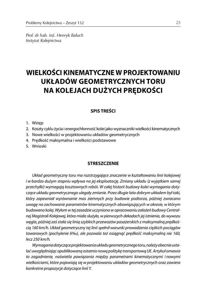 Problemy Kolejnictwa – Zeszyt 152 23 Prof. dr hab. inż. Henryk Bałuch Instytut Kolejnictwa WIELKOŚCI KINEMATYCZNE W PROJEKTOWANIU UKŁADÓW GEOMETRYCZNYCH TORU NA KOLEJACH DUŻYCH PRĘDKOŚCI SPIS TREŚCI 1. 2. 3. 4. 5. Wstęp Koszty cyklu życia i energochłonność kolei jako wyznaczniki wielkości kinematycznych Nowe wielkości w projektowaniu układów geometrycznych Prędkość maksymalna i wielkości podstawowe Wnioski STRESZCZENIE Układ geometryczny toru ma rozstrzygające znaczenie w kształtowaniu linii kolejowej i w bardzo dużym stopniu wpływa na jej eksploatację. Zmiany układu (z wyjątkiem samej przechyłki) wymagają kosztownych robót. W całej historii budowy kolei wymagania dotyczące układu geometrycznego ulegały zmianie. Przez długie lata dobrym układem był taki, który zapewniał wyrównanie mas ziemnych przy budowie podtorza, później zwracano uwagę na zachowanie parametrów kinematycznych obowiązujących w okresie, w którym budowano kolej. Wyłom w tej zasadzie uczyniono w opracowaniu założeń budowy Centralnej Magistrali Kolejowej, która miała służyła, w pierwszych dekadach jej istnienia, do wywozu węgla, później zaś stała się linią szybkich przewozów pasażerskich z maksymalną prędkością 160 km/h. Układ geometryczny tej linii spełnił warunki prowadzenia ciężkich pociągów towarowych (pochylenie 6‰), ale pozwala też osiągnąć prędkość maksymalną nie 160, lecz 250 km/h. Wymagania dotyczące projektowania układu geometrycznego toru, należy obecnie ustalać uwzględniając opublikowaną ostatnio nową politykę transportową UE. Artykuł omawia to zagadnienie, naświetla powiązania między parametrami kinematycznymi i nowymi wielkościami, które pojawiają się w projektowaniu układów geometrycznych oraz zawiera konkretne propozycje dotyczące linii Y. H. Bałuch 24 1. WSTĘP Nadrzędne warunki kształtowania wszelkich budowli kolejowych wyznacza dynamika, w której podstawowymi pojęciami są masa i przyspieszenie. W układach geometrycznych toru, kształtujących położenie linii kolejowych na wiele dziesiątków lat, byłoby trudno operować masą i cechami dynamicznymi pojazdów szynowych, których generacje są znacznie krótsze niż czasy eksploatacji linii. Z tego powodu, głównie analizy dynamiczne przy projektowaniu układów geometrycznych sprowadzono do analiz kinematycznych, przyjmując jako wielkość podstawową przyspieszenie działające na pojazd znajdujący się w łuku. Od dziesiątków lat parametr ten oraz pozostałe wielkości kinematyczne stanowią podstawę wyznaczania minimalnych promieni łuków, przechyłki, długości ramp przechyłkowych i krzywych przejściowych [2]. Operowanie wielkościami kinematycznymi ma też tę zaletę, że jest dobrze wyczuwalne jako cecha bliska dynamice. Wprowadzony w Technicznych Specyfikacjach Interoperacyjności [3] niedomiar przechyłki i w normie [10]1 gradient tego niedomiaru w czasie są powiązane zależnościami funkcyjnymi z dotychczasowymi wielkościami i w istocie rzeczy niczego nowego nie wnoszą. Nie ma więc naukowych i formalnych podstaw, by odchodzić od dotychczasowej symboliki i zasad obliczania układów geometrycznych, tym bardziej że i tak w cytowanej normie trzeba było w pewnych przypadkach pozostać przy przyspieszeniu. Liczne wielkości graniczne i wspomniane niezbyt wyczuwalne pojęcia, zwłaszcza gradient niedomiaru przechyłki, może skłonić do przyjmowania przy projektowaniu układów geometrycznych na kolejach dużych prędkości pewnych wartości stałych bez analizowania każdego pojedynczego łuku w trudnych warunkach terenowych. Na takie uproszczenie może też wywierać wpływ narzucony czas projektowania. Artykuł ten przedstawia znaczenie właściwie zaprojektowanych układów geometrycznych w świetle nowej polityki transportowej Unii Europejskiej, powiązania wielkości geometrycznych podanych w opracowaniach [3] i [10] z wielkościami kinematycznymi oraz algorytmy podstawowych obliczeń układów geometrycznych toru (przechyłki, długości krzywej przejściowej, minimalnego promienia łuku i maksymalnej prędkości), przy zastosowaniu dotychczasowych i nowych wielkości. Zwraca też uwagę na konieczność rozważnego sięgania do wartości granicznych i naświetla wybór maksymalnej prędkości, na jaką powinny być projektowane układy geometryczne toru. 2. KOSZTY CYKLU ŻYCIA I ENERGOCHŁONNOŚĆ KOLEI JAKO WYZNACZNIKI WIELKOŚCI KINEMATYCZNYCH W kosztach cyklu życia linii kolejowej największy udział mają koszty jej eksploatacji (rys. 1). W pierwszej połowie ubiegłego stulecia przy projektowaniu linii kolejowych 1 Norma ta dotyczy linii do prędkości nie przekraczających 300 km/h. Wielkości kinematyczne w projektowaniu układów geometrycznych toru … 25 duże znaczenie przywiązywano do takiego kształtowania trasy, aby było możliwe wyrównanie mas ziemnych przy zachowaniu warunków granicznych. Często więc wprowadzano minimalne promienie łuków i maksymalne pochylenia w dążeniu do uzyskania najmniejszych kosztów budowy. Rys. 1. Orientacyjny rozkład kosztów w cyklu życia nawierzchni kolejowej: 1) planowanie i projektowanie, 2) budowa, 3) eksploatacja, 4) wymiana [9] W pierwszej połowie XXI wieku w projektowaniu, budowie i eksploatacji kolei dużych prędkości, których sieć powinna być zakończona do roku 2050, należy kierować się nową polityką transportową Unii Europejskiej2, zakładającą m.in. drastyczne zmniejszenie emisji gazów cieplarnianych, która do 2050 roku powinna zmaleć o 80÷95% w porównaniu z rokiem 1990, w tym o 60% w transporcie. Decyzja ta powinna znaleźć odzwierciedlenie również w założeniach do budowy kolei dużych prędkości w Polsce. Paradygmatem więc powinno być zbudowanie kolei o możliwie najmniejszej energochłonności w całym cyklu jej życia. Wymaga to m.in. zaprojektowania takiego układu geometrycznego toru, który zapewni małe o