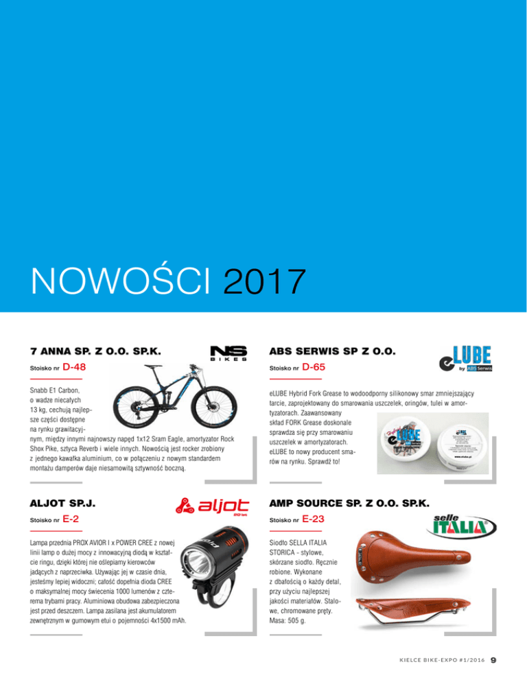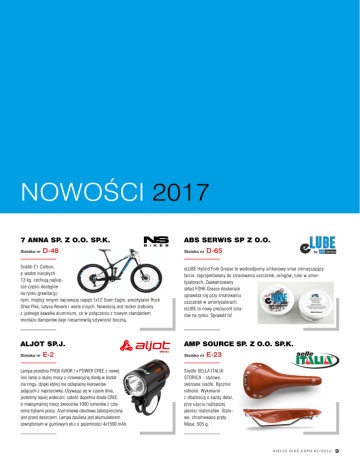 tarcz czy zastosowania osłonek w stylu tych z motocrossu, jednak na razie żadne z nich nie zostały wprowadzone w życie. Biorąc pod uwagę potrzeby kolarzy-amatorów, dla których hamulce tarczowe okazały się lepszym rozwiązaniem, pozytywnym sygnałem ze strony UCI jest zatwierdzenie udziału rowerów z takimi hamulcami w wyścigach Grand Fondo i przełajowych. Pozwoli to na dalszy rozwój tego typu maszyn i wypracowanie rozwiązań, które będą satysfakcjonujące także dla zawodowców. Dowodem na to jest fakt, że Shimano w najnowszej odsłonie swojej topowej grupy osprzętu przeznaczonej do profesjonalne- go ścigania Dura-Ace zaprezentowało także system hamulców tarczowych. Testy swojego rozwiązania prowadzi także Campagnolo, a SRAM, prekursor tego trendu, wprowadził je do swojej grupy eTAP. Szersze opony szosowe Zawodnicy już docenili szersze ogumienie i w peletonie coraz rzadziej można spotkać opony o rozmiarze 23C. Szersze opony mają niepodważalne zalety. Producenci rowerów uważnie obserwują zawodowców i wyciągają właściwe wnioski, dlatego opony 25C już w tym sezonie zaczęły dominować także w seryj- nych rowerach, nawet tych z najwyższej półki. W nadchodzących latach tendencja ta będzie się tylko pogłębiać, a opony węższe niż 25 mm staną się specjalistycznymi oponami na odcinki o szczególnie gładkich i niechropowatych nawierzchniach. Wraz z szerokością opon wyraźnie postępuje tendencja poszerzania obręczy. Szersza opona ułożona na szerszej obręczy uzyskuje optymalny rozmiar oraz profil. Dlatego w nowych kołach, w miejsce dotychczasowych obręczy o szerokości 15–16 mm, coraz częściej stosowane są modele, których szerokość przekracza 18–19 mm, rozmiar do niedawna stosowany w rowerach MTB. n NOWOŚCI 2017 7 ANNA SP. Z O.O. SP.K. Stoisko nr D-48 ABS SERWIS SP Z O.O. Stoisko nr D-65 Snabb E1 Carbon, o wadze niecałych 13 kg, cechują najlepsze części dostępne na rynku grawitacyjnym, między innymi najnowszy napęd 1x12 Sram Eagle, amortyzator Rock Shox Pike, sztyca Reverb i wiele innych. Nowością jest rocker zrobiony z jednego kawałka aluminium, co w połączeniu z nowym standardem montażu damperów daje niesamowitą sztywność boczną. eLUBE Hybrid Fork Grease to wodoodporny silikonowy smar zmniejszający tarcie, zaprojektowany do smarowania uszczelek, oringów, tulei w amortyzatorach. Zaawansowany skład FORK Grease doskonale sprawdza się przy smarowaniu uszczelek w amortyzatorach. eLUBE to nowy producent smarów na rynku. Sprawdź to! ALJOT SP.J. AMP SOURCE SP. Z O.O. SP.K. Stoisko nr E-2 Lampa przednia PROX AVIOR I x POWER CREE z nowej linii lamp o dużej mocy z innowacyjną diodą w kształcie ringu, dzięki której nie oślepiamy kierowców jadących z naprzeciwka. Używając jej w czasie dnia, jesteśmy lepiej widoczni; całość dopełnia dioda CREE o maksymalnej mocy świecenia 1000 lumenów z czterema trybami pracy. Aluminiowa obudowa zabezpieczona jest przed deszczem. Lampa zasilana jest akumulatorem zewnętrznym w gumowym etui o pojemności 4x1500 mAh. Stoisko nr E-23 Siodło SELLA ITALIA STORICA - stylowe, skórzane siodło. Ręcznie robione. Wykonane z dbałością o każdy detal, przy użyciu najlepszej jakości materiałów. Stalowe, chromowane pręty. Masa: 505 g. K I E LC E B I K E - E X P O # 1 / 2 0 1 6 9 N O W O Ś C I 2 0 1 7 ANGRE PHU Stoisko nr D-26 APG CO. Sp.j. Stoisko nr G-28 ® Fotelik Bobike MINI ONE z osłoną dla dzieci w wieku od 9 miesięcy do 3 lat, o masie od 9 do 15 kg. Wykonany z trwałych materiałów, posiada trzypunktowe pasy bezpieczeństwa, klamrę Easy-Click, regulowane podnóżki, wygodne, wodoodporne siedzenie z miękkiej pianki EVA, oryginalną osłonę przeciwwiatrową. Uniwersalny uchwyt, montaż na wsporniku kierownicy lub do ramy kierownicy A-HEAD. Dostępny w 7 kolorach. MOON ARCTURUS-AUTO - funkcja automatycznego wyłączania w dzień i włączania w nocy, funkcja oszczędzania baterii, 7 trybów pracy, moc do 70 LM, czas pracy 1,2- 17 godz., akumulator Li-Po, ładowanie - mikro USB. Wym. 57,5x28,5x19. Wykonana w technologii COB, z wysokiej jakości materiałów. ARKUS&ROMET SP. Z O.O. Stoisko nr F-2 Kolekcja Romet 2017 to innowacyjne technologie i zaawansowane materiały. Rowery lżejsze, szybsze i bardziej funkcjonalne. Nowa generacja systemu zawieszenia Swift Link, technologia Boost, karbonowe ramy i opony w standardzie Plus to większa przyczepność i pewność jazdy. Rozbudowana grupa rowerów elektrycznych to odpowiedź i kreacja nadchodzących zmian. Stoisko nr F-2 Stoisko nr F-2 Romet Monsun i Mustang 2017 to rowery Cross Country, które powstały z myślą o wygrywaniu. Niska waga, dynamika i precyzja prowadzenia to cechy, które odnajdziesz w modelach Monsun i Mustang. Wysokiej klasy włókna węglowe, lekkie aluminium i starannie dobrane komponenty gwarantują, że nasze rowery sprawdzą się w kluczowych momentach rywalizacji. Obydwa modele dadzą Ci potencjał sportowych możliwości. ASPIRE SPORTS S.R.O. Stoisko nr C-14 Romet JIG Plus 2017 - konstrukcja tego modelu zapewnia świetną zabawę na singletrackach. W tym sezonie dołącza kolejny model JIG PLUS z oponami w tym standardzie i powiększonym skokiem widelca, zapewniającymi jeszcze większą przyczepność i pewność prowadzenia. Cannondale zaprezentował kolejną generację prawdziwie kultowego Scalpela – model Scalpel-Si. Nowy Scalpel to najbardziej dopracowany rower na trudne technicznie trasy współczesnego cross-country, jednocześnie najlżejszy i najsztywniejszy full do XC na rynku. ASPERIA GROUP SP. Z O. O. BBF BIKE GMBH Stoisko nr G-12 Stoisko nr F-11 Plecak sportowy FORCE PILOT to najwyższa jakość w atrakcyjnej cenie. Pojemność plecaka – 10 litrów. Wewnątrz Rower crossowy CTX 1.5 to klasyk, oferujący sprawdzone komponenty w połączeniu z doskonałą jakością wykończenia i przy- uchwyt na bukłak o pojemności do 3 litrów. Posiada odblaski oraz specjalne kie