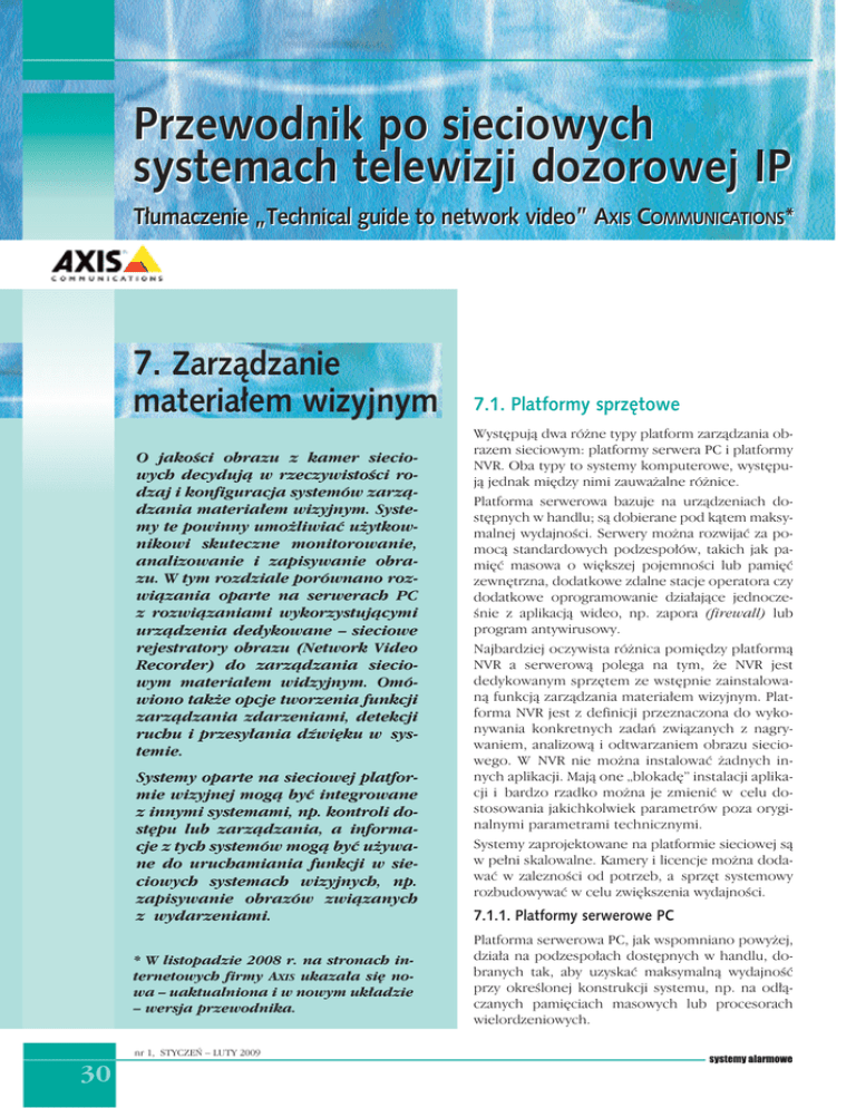 Przewodnik po sieciowych systemach telewizji dozorowej IP Tłumaczenie „Technical guide to network video” AXIS COMMUNICATIONS* 7. Zarządzanie materiałem wizyjnym O jakości obrazu z kamer sieciowych decydują w rzeczywistości rodzaj i konfiguracja systemów zarządzania materiałem wizyjnym. Systemy te powinny umożliwiać użytkownikowi skuteczne monitorowanie, analizowanie i zapisywanie obrazu. W tym rozdziale porównano rozwiązania oparte na serwerach PC z rozwiązaniami wykorzystującymi urządzenia dedykowane – sieciowe rejestratory obrazu (Network Video Recorder) do zarządzania sieciowym materiałem widzyjnym. Omówiono także opcje tworzenia funkcji zarządzania zdarzeniami, detekcji ruchu i przesyłania dźwięku w systemie. Systemy oparte na sieciowej platformie wizyjnej mogą być integrowane z innymi systemami, np. kontroli dostępu lub zarządzania, a informacje z tych systemów mogą być używane do uruchamiania funkcji w sieciowych systemach wizyjnych, np. zapisywanie obrazów związanych z wydarzeniami. * W listopadzie 2008 r. na stronach internetowych firmy AXIS ukazała się nowa – uaktualniona i w nowym układzie – wersja przewodnika. nr 1, STYCZEŃ – LUTY 2009 30 7.1. Platformy sprzętowe Występują dwa różne typy platform zarządzania obrazem sieciowym: platformy serwera PC i platformy NVR. Oba typy to systemy komputerowe, występują jednak między nimi zauważalne różnice. Platforma serwerowa bazuje na urządzeniach dostępnych w handlu; są dobierane pod kątem maksymalnej wydajności. Serwery można rozwijać za pomocą standardowych podzespołów, takich jak pamięć masowa o większej pojemności lub pamięć zewnętrzna, dodatkowe zdalne stacje operatora czy dodatkowe oprogramowanie działające jednocześnie z aplikacją wideo, np. zapora (firewall) lub program antywirusowy. Najbardziej oczywista różnica pomiędzy platformą NVR a serwerową polega na tym, że NVR jest dedykowanym sprzętem ze wstępnie zainstalowaną funkcją zarządzania materiałem wizyjnym. Platforma NVR jest z definicji przeznaczona do wykonywania konkretnych zadań związanych z nagrywaniem, analizową i odtwarzaniem obrazu sieciowego. W NVR nie można instalować żadnych innych aplikacji. Mają one „blokadę” instalacji aplikacji i bardzo rzadko można je zmienić w celu dostosowania jakichkolwiek parametrów poza oryginalnymi parametrami technicznymi. Systemy zaprojektowane na platformie sieciowej są w pełni skalowalne. Kamery i licencje można dodawać w zalezności od potrzeb, a sprzęt systemowy rozbudowywać w celu zwiększenia wydajności. 7.1.1. Platformy serwerowe PC Platforma serwerowa PC, jak wspomniano powyżej, działa na podzespołach dostępnych w handlu, dobranych tak, aby uzyskać maksymalną wydajność przy określonej konstrukcji systemu, np. na odłączanych pamięciach masowych lub procesorach wielordzeniowych. przewodnik... obrazu realizowane za pomocą oprogramowania do zarządzania materiałem wizyjnym zainstalowanego na komputerze lub rejestratorze NVR. 7.2.1. Monitoring za pomocą interfejsu sieciowego Ponieważ platforma serwerowa bazuje na podzespołach standardowych, można korzystać zarówno ze sprzętu wybranego przez użytkownika, jak i urządzeń oraz usług zapewnianych przez dostawcę urządzeń. W sieciowym systemie dozoru wizyjnego obraz może być oglądany z dowolnego punktu w sieci z dostępem do przeglądarki internetowej. Każda kamera ma wbudowany serwer sieci Web z adresem IP, dlatego do wyświetlenia obrazu na komputerze wystarczy otworzyć przeglądarkę internetową i w polu adresu wpisać adres IP kamery. Po ustanowieniu połączenia przez komputer w przeglądarce jest automatycznie wyświetlana strona startowa kamery sieciowej. Na stronie startowej „na żywo” jest widoczny obraz z kamery oraz łącza do zmiany ustawień kamery, np. rozdzielczości obrazu, ustawień sieciowych i wiadomości e-mail, chyba że system jest chroniony hasłem. 7.1.2. Platformy NVR Pod względem rejestracji i odtwarzania rejestrator NVR jest nieco podobny do rejestratora DVR (Digital Video Recorder). DVR jest w rzeczywistości systemem hybrydowym, mogącym obsługiwać kamery analogowe i zapisywać obraz na dysku twardym w formacie cyfrowym. NVR jest systemem całkowicie cyfrowym, który odbiera cyfrowe obrazy/strumienie wizyjne z sieci i zapisuje je na dysku twardym w formacie cyfrowym. Niektóre rejestratory DVR są wyposażone w podstawowy interfejs sieciowy zapewniający możliwość zdalnego podglądu. W systemach NVR nie ma dedykowanego monitora ani klawiatury. Operacje wyświetlania i zarządzania w NVR odbywają się zdalnie poprzez sieć za pomocą komputera. Platforma NVR zapewnia optymalną wydajność dla ustalonej liczby kamer, przez co jest mniej skalowalny niż platforma serwerowa. Jest więc przeznaczona do mniejszych systemów, w których liczba kamer mieści się w granicach wydajności konstrukcyjnej NVR. Zaletą platformy NVR jest łatwiejsza instalacja niż w przypadku platformy serwerowej. 7.2.2. Monitoring za pomocą oprogramowania do zarządzania materiałem wizyjnym Obraz można wyświetlać bezpośrednio w standardowej przeglądarce internetowej, można też zainstalować oprogramowanie do zarządzania materiałem wizyjnym, jeżeli wymaga się większej liczby opcji wyświetlania czy zapisywania i zarządzania materiałem wideo. Na rynku dostępnych jest wiele różnych programów: od niezależnych aplikacji dla jednego komputera, po zaawansowane programy typu klient/serwer zapewniające obsługę wielu użytkowników naraz. Najczęściej dostępne w nich funkcje obejmują monitorowanie obrazu, nagrywanie i odtwarzanie, zarządzanie zdarzeniami i alarmowanie o nich np. za pomocą syreny lub wiadomości e-mail. 7.2.3. Nagrywanie obrazu sieciowego 7.2. Monitorowanie i nagrywanie Zarządzanie materiałem wizyjnym w sieciowym systemie wizyjnym obejmuje monitorowanie obrazu, które może być realizowane 