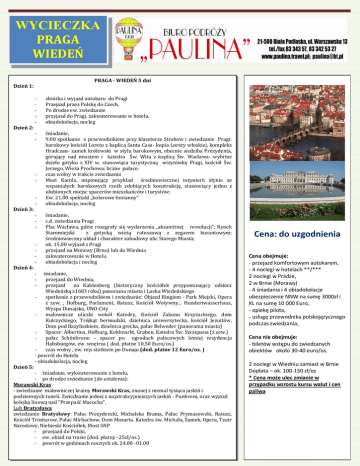 WYCIECZKA WYCIECZKA DO PRAGA PARYŻA WIEDEŃ 6 dni PRAGA - WIEDEŃ 5 dni Dzień 1: Dzień 2: - zbiórka i wyjazd autokaru do Pragi Przejazd przez Polskę do Czech, Po drodze ew. zwiedzanie przyjazd do Pragi, zakwaterowanie w hotelu, obiadokolacja, nocleg - śniadanie, 9.00 spotkanie z przewodnikiem przy klasztorze Strahow i zwiedzanie Pragi: barokowy kościół Loreto z kaplicą Santa Casa- kopia Lorety włoskiej, kompleks Hradczan- zamek królewski w stylu barokowym, obecnie siedziba Prezydenta, górujący nad miastem i katedra Św. Wita z kaplicą Św. Wacława- wybitne dzieło gotyku z XIV w. stanowiąca turystyczną wizytówkę Pragi, kościół Św. Jerzego, Wieża Prochowa; liczne pałace; czas wolny w trakcie zwiedzania Most Karola, imponujący przykład średniowiecznej inżynierii słynie ze wspaniałych barokowych rzeźb zdobiących konstrukcję, stanowiący jedno z ulubionych miejsc spacerów mieszkańców i turystów; Ew. 21.00 spektakl „kolorowe fontanny” obiadokolacja, nocleg - Dzień 3: - Dzień 4: Dzień 5: - śniadanie, c.d. zwiedzania Pragi Plac Wacława, gdzie rozegrały się wydarzenia „aksamitnej rewolucji”; Rynek Staromiejski z gotycką wieżą ratuszową z zegarem kurantowym; średniowieczny układ i charakter zabudowy ulic Starego Miasta; ok. 15.00 wyjazd z Pragi przejazd na Morawy (Brno) lub do Wiednia zakwaterowanie w Hotelu obiadokolacja i nocleg - śniadanie, przejazd do Wiednia, przejazd na Kahlenberg (historyczny kościółek przypominający odsiecz Wiedeńską z1683 roku) panorama miasta i Lasku Wiedeńskiego spotkanie z przewodnikiem i zwiedzanie: Objazd Ringiem - Park Miejski, Opera z zew. , Hofburg, Parlament, Ratusz, Kościół Wotywny... Hundertwasserhaus, Wyspa Dunajska, UNO-City malownicze uliczki wokół Katedry, Kościół Zakonu Krzyżackiego, dom Kulczyckiego, Trójkąt bermudzki, dzielnica uniwersytecka, kościół Jezuitów, Dom pod Bazyliszkiem, dzielnica grecka, pałac Belweder (panorama miasta) Spacer: Albertina, Hofburg, Kohlmarkt, Graben, Katedra Św. Szczepana (z zew.) pałac Schönbrunn – spacer po ogrodach pałacowych letniej rezydencja Habsburgów, ew. wnętrza ( dod. płatne 10,50 Euro/os.) czas wolny , ew. rejs statkiem po Dunaju (dod. płatne 12 Euro/os. ) - powrót do Hotelu - obiadokolacja, nocleg - śniadanie, wykwaterowanie z hotelu, - po drodze zwiedzanie (do ustalenia): Morawski Kras - zwiedzanie malowniczej krainy Morawski Kras, znanej z niemal tysiąca jaskiń i podziemnych tuneli. Zwiedzanie jednej z najatrakcyjniejszych jaskiń - Punkveni, oraz wyjazd kolejką linową nad "Przepaść Macocha", Lub Bratysława zwiedzanie Bratysławy: Pałac Prezydencki, Michalska Brama, Pałac Prymasowski, Ratusz, Kościół Trinitarow, Pałac Mirbachow, Dom Mozarta, Katedra św. Michała, Zamek, Opera, Teatr Narodowy, Niebieski Kościółek, Most SNP - przejazd do Polski, - ew. obiad na trasie (dod. płatny -25zł/os.) - powrót w godzinach nocnych ok. 24.00 -01.00 Cena: do uzgodnienia Cena obejmuje: - przejazd komfortowym autokarem, - 4 noclegi w hotelach **/*** 2 noclegi w Pradze, 2 w Brnie (Morawy) - 4 śniadania i 4 obiadokolacje ubezpieczenie NNW na sumę 3000zł i KL na sumę 10 000 Euro, - opiekę pilota, - usługę przewodnika polskojęzycznego podczas zwiedzania, Cena nie obejmuje: - biletów wstępu do zwiedzanych obiektów około 30-40 euro/os. 2 noclegi w Wiedniu zamiast w Brnie Dopłata – ok. 100-150 zł/os * Cena może ulec zmianie w przypadku wzrostu kursu walut i cen paliwa
