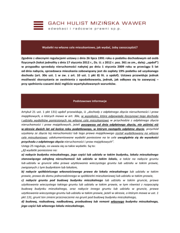 Wydatki na własne cele mieszkaniowe, jak wydać, żeby zaoszczędzić? Zgodnie z obecnymi regulacjami ustawy z dnia 26 lipca 1991 roku o podatku dochodowym od osób fizycznych (tekst jednolity z dnia 17 stycznia 2012 r., Dz. U. z 2012 r. poz. 361 ze zm., dalej: „updof”) w przypadku sprzedaży nieruchomości nabytej po dniu 1 stycznia 2009 roku w przeciągu 5 lat od dnia nabycia, sprzedawca mieszkania zobowiązany jest do zapłaty 19% podatku od uzyskanego dochodu (art. 30e ust. 1 w zw. z art. 10 ust. 1 pkt 8) lit. a updof). Ustawa przewiduje jednak możliwość skorzystania ze zwolnienia z opodatkowania, jednak, jak odbywa się to zazwyczaj – przy spełnieniu czasami dość mgliście wyartykułowanych warunków. Podstawowe informacje Artykuł 21 ust. 1 pkt 131) updof przewiduje, iż „dochody z odpłatnego zbycia nieruchomości i praw majątkowych, o których mowa w art. 30e, w wysokości, która odpowiada iloczynowi tego dochodu i udziału wydatków poniesionych na własne cele mieszkaniowe w przychodzie z odpłatnego zbycia nieruchomości i praw majątkowych, jeżeli począwszy od dnia odpłatnego zbycia, nie później niż w okresie dwóch lat od końca roku podatkowego, w którym nastąpiło odpłatne zbycie, przychód uzyskany ze zbycia tej nieruchomości lub tego prawa majątkowego został wydatkowany na własne cele mieszkaniowe; udokumentowane wydatki poniesione na te cele uwzględnia się do wysokości przychodu z odpłatnego zbycia nieruchomości i praw majątkowych”. Ustęp 25 reguluje, co uważa się za takie wydatki. Są to: „1) wydatki poniesione na: a) nabycie budynku mieszkalnego, jego części lub udziału w takim budynku, lokalu mieszkalnego stanowiącego odrębną nieruchomość lub udziału w takim lokalu, a także na nabycie gruntu lub udziału w gruncie albo prawa użytkowania wieczystego gruntu lub udziału w takim prawie, związanych z tym budynkiem lub lokalem, b) nabycie spółdzielczego własnościowego prawa do lokalu mieszkalnego lub udziału w takim prawie, prawa do domu jednorodzinnego w spółdzielni mieszkaniowej lub udziału w takim prawie, c) nabycie gruntu pod budowę budynku mieszkalnego lub udziału w takim gruncie, prawa użytkowania wieczystego takiego gruntu lub udziału w takim prawie, w tym również z rozpoczętą budową budynku mieszkalnego, oraz nabycie innego gruntu lub udziału w gruncie, prawa użytkowania wieczystego gruntu lub udziału w takim prawie, jeżeli w okresie, o którym mowa w ust. 1 pkt 131, grunt ten zmieni przeznaczenie na grunt pod budowę budynku mieszkalnego, d) budowę, rozbudowę, nadbudowę, przebudowę lub remont własnego budynku mieszkalnego, jego części lub własnego lokalu mieszkalnego, GACH, HULIST, MIZIŃSKA, WAWER – ADWOKACI I RADCOWIE PRAWNI SP.P. e) rozbudowę, nadbudowę, przebudowę lub adaptację na cele mieszkalne własnego budynku niemieszkalnego, jego części, własnego lokalu niemieszkalnego lub własnego pomieszczenia niemieszkalnego - położonych w państwie członkowskim Unii Europejskiej lub w innym państwie należącym do Europejskiego Obszaru Gospodarczego albo w Konfederacji Szwajcarskiej;” Artykuł 21 ust. 26 updof stanowi z kolei, iż: „Przez własny budynek, lokal lub pomieszczenie, o których mowa w ust. 25 pkt 1 lit. d i e, rozumie się budynek, lokal lub pomieszczenie stanowiące własność lub współwłasność podatnika lub do którego podatnikowi przysługuje spółdzielcze własnościowe prawo do lokalu, prawo do domu jednorodzinnego w spółdzielni mieszkaniowej lub udział w takich prawach.” Biorąc pod uwagę takie brzmienie przepisów pojawić się może kilka wątpliwości natury praktycznej. Wynajem – tak czy nie? Organy podatkowe: raz tak, raz nie Organy w wydawanych interpretacjach podatkowych nie są zgodne co do tego, czy realizacja „własnych celów mieszkaniowych” obejmuje li tylko sytuacje nabycia nieruchomości w celu zamieszkania przez samego podatnika, czy też podatnik ten może nieruchomość tę nabyć dla siebie a następnie wynająć w części albo w całości mając np. zamiar przyszłego zamieszkania w nieruchomości. Dyrektor Izby Skarbowej w Katowicach w wydanej dnia 7 grudnia 2011 roku w sprawie o sygn. akt IBPBII/2/415-1004/11/ŁCz interpretacji indywidualnej stwierdził np., że „Realizacja własnych celów mieszkaniowych winna polegać na tym, że w przypadku nabycia nowej nieruchomości to w niej podatnik faktycznie winien takie cele realizować. Tymczasem w opisanym we wniosku zdarzeniu wnioskodawczyni wskazała, iż zakupiony lokal mieszkalny zamierza wynająć. (…) Już z literalnego brzmienia powyższego przepisu jednoznacznie wynika, że przeznaczając lokal mieszkalny na wynajem innej osobie lub osobom wnioskodawczyni nie spełnia przesłanki określonej w art. 21 ust. 1 pkt 131 ustawy o podatku dochodowym od osób fizycznych obligującej wnioskodawczynię do zaspokajania własnych potrzeb mieszkaniowych w nowo nabytym lokalu mieszkalnym. Tym samym w nieruchomości tej cele mieszkaniowe realizować będzie nie wnioskodawczyni, lecz najemca lokalu mieszkalnego. Powyższe oznacza, że w żadnej mierze nie można pogodzić tak przedstawionego zdarzenia z przesłanką wynikającą z art. 21 ust. 1 pkt 131 ustawy. O własnych potrzebach nie sposób mówić, gdy podatnik zakupił lokal mieszkalny w celach najmu całości lub części i istotnie wynajmuje lokal mieszkalny w celach zarobkowych.”. Wojewódzki Sąd Administracyjny Łodzi w wyroku z dnia 24 lutego 2012 roku orzekł, iż przeznaczenie przychodu ze zbycia nieruchomości na nabycie lokalu mieszkalnego w celu jego odsprzedaży lub wynajmu nie uprawnia do skorzystania ze zwolnienia podatkowego (I SA/Łd 1639/11). Podobne rozstrzygnięcie zapadło w Wyroku Wojewódzkiego Sądu Administracyjnego w Łodzi z dnia 12 września 2012 roku, sygn. akt I SA/Łd 874/12: „Wydatkowanie przychodu z odpłatnego zbycia nieruchomości zgodnie z treścią art. 21 ust. 25 pkt