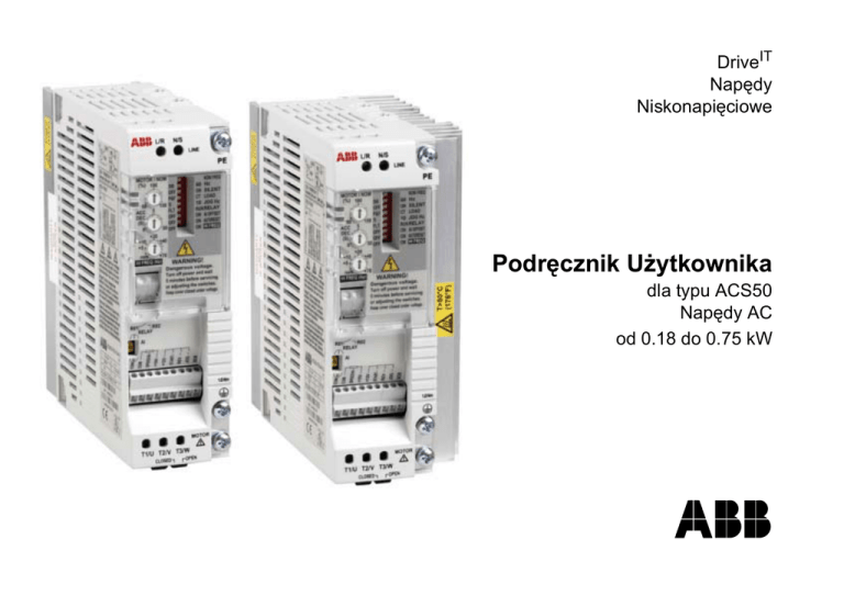 DriveIT Napędy Niskonapięciowe Podręcznik Użytkownika dla typu ACS50 Napędy AC od 0.18 do 0.75 kW Podręczniki użytkownika w innych językach można odszukać na stronie internetowej: http://www.abb.com. W tym celu należy wprowadzić ACS50 UG w polu wyszukiwarki. 3AFE 68247756 REV C PL Obowiązujący od: 30.01.2004 © 2004 ABB Oy. Wszystkie prawa zastrzeżone. ABB Sp. z o.o. Dział Sprzedaży Napędów 91-205 Łódź Polska Telefon +48 42 613 49 55-58 Fax +48 42 613 49 01 Internet http://www.abb.com http://www.abb.pl/napedy E-mail [email protected] 3 Instrukcje bezpieczeństwa O niniejszym podręczniku Przed przystąpieniem do instalacji należy uważnie zapoznać się z poniższymi instrukcjami. Ostrzeżenie! Niebezpieczne napięcie! Instalacja ACS50 może być wykonywana jedynie przez wykwalifikowanego elektryka. Nigdy nie wykonywać żadnych prac przy napędzie, kablu silnika lub silniku, kiedy jest załączone zasilanie sieciowe. Po wyłączeniu zasilania sieciowego należy odczekać co najmniej 5 minut zanim rozpocznie się prace przy napędzie, aby kondensatory obwodu pośredniego rozładowały się. Uwaga: Przełączniki 2-pozycyjne DIP są pod niebezpiecznym napięciem. Uwaga: Nawet gdy silnik nie pracuje, na zaciskach obwodu zasilania L/R, N/S, T1/U, T2/V i T3/W nadal występuje niebezpieczne napięcie. Uwaga: Nawet kiedy przemiennik jest wyłączony, na zaciskach przekaźnika wyjściowego mogą występować niebezpieczne napięcia pochodzące z przyłączonego okablowania zewnętrznego. Ostrzeżenie! Wysoka temperatura! Podczas normalnej pracy napęd może osiągnąć wysoką temperaturę (>80 °C). Należy upewnić się, że obsługa przemiennika będzie bezpieczna, postępując zgodnie z niniejszymi instrukcjami. Podręcznik ten jest przewodnikiem dostarczającym informacji niezbędnych do instalacji i pierwszego uruchomienia napędu. Sprawdzenie dostawy Dostawa obejmuje: 1. ACS50 2. Podręcznik Użytkownika 3. Dwa zaciski dla kabla sterowania (tylko jednostki z EMC) Należy sprawdzić tabliczkę znamionową i upewnić się, czy dostawa jest zgodna z zamówieniem. ACS50-01_-____-_ Filtr EMC: E = filtr zintegrowany, N = bez filtra Maksymalny ciągły prąd wyjściowy (I2): 01A4 = 1.4 A, 02A2 = 2.2 A, 04A3 = 4.3 A Napięcie zasilania (U1): 1 = 110…120 VAC +10%/-15% 2 = 200…240 VAC +10%/-15% Ogólne instrukcje bezpieczeństwa ACS50 uruchomi silnik automatycznie po chwilowym zaniku i powrocie napięcia zasilania, jeżeli obecne jest zewnętrzne polecenie startu. Na tabliczce znamionowej wydrukowany jest numer seryjny (S/N). Nigdy nie należy naprawiać uszkodzonego urządzenia samodzielnie. (Y = rok produkcji, WW = tydzień kalendarzowy roku produkcji ACS50 nie jest przeznaczony do napraw w miejscu instalacji. Należy skontaktować się z Dostawcą w celu wymiany uszkodzonego urządzenia na nowe. Nie należy instalować ACS50 w pomieszczeniach ogólnie dostępnych. Nie wolno przyłączać napięcia zasilania częściej niż co trzy minuty. Zmiana pozycji przełącznika DIP oddziaływuje na funkcjonowanie i zachowanie się przemiennika. Należy upewnić się, czy nie spowoduje ona zagrożenia bezpieczeństwa personelu lub uszkodzenia mienia. 4 Przegląd urządzenia Napęd ACS50 przeznaczony jest do regulacji prędkości obrotowej silników indukcyjnych 3-fazowych prądu przemiennego. Uziemienie ochronne (PE), str. 13 Zaciski zasilania, str. 13 LED zasilania, str. 17 Przełączniki 2-pozycyjne DIP, str. 10 LED błędu, str. 17 Potencjometry sterownicze, str. 12 Zaciski przekaźnika wyjściowego, str. 14 Zaciski kabli sterowania, str. 14 Osłona kabla silnika, str. 13 Analogowy przełącznik wyboru sygnału wejściowego (napięcie/prąd), str. 14 Zaciski montażowe, str. 8 - 9 Zaciski kabla silnika, str. 13. Przesuwna pokrywa zapewnia dodatkową izolację. W celu zamknięcia, należy przesunąć pokrywę w lewo. Płyta dociskowa, str. 15 (tylko jednostki z EMC) 5 Kolejne kroki instalowania i pierwszego uruchomienia Przed przystąpieniem do instalacji należy przeczytać Instrukcje bezpieczeństwa. Czynność Str. 1 Sprawdzić dostawę. 3 2 Upewnić się, że warunki środowiskowe w miejscu instalacji są odpowiednie dla ACS50. 6 3 Zamontować urządzenie. 8-9 4 Sprawdzić możliwość zastosowania nastaw standardowych: częstotliwość znamionowa silnika 50 Hz, obciążenie pompowe lub wentylatorowe, maksymalna częstotliwość wyjściowa 50 Hz. Jeżeli dla danej aplikacji nastawy standardowe nie są odpowiednie, nastawić przełączniki 2-pozycyjne DIP. 10 5 Upewnić się, że ustawienie potencjometru MOTOR I NOM jest zgodne z prądem znamionowym silnika. Zdefiniuje to działanie funkcji zabezpieczenia temperaturowego silnika. 12 6 Jeżeli to konieczne, nastawić czas przyspieszania/hamowania potencjometrem ACC/DEC. 12 7 Przyłączyć kabel zasilania i kabel silnika. 13 8 Przyłączyć przewody sterowania. 14 9 Załączyć zasilanie. Zaświeci się zielona dioda LED. Uwaga: Silnik zacznie się obracać, jeżeli aktywny jest sygnał startu. 10 Ustawić zadawanie prędkości i wydać polecenie startu. Silnik zacznie przyspieszać do zadanej prędkości. 16 6 Ograniczenia środowiskowe Miejsce zainstalowania Przechowywanie i transportowanie w opakowaniu ochronnym Temperatura otoczenia -20 °C (-4 °F), niedopuszczalne oszronienie +40 °C (104 °F), przy obciążeniu normalnym +50 °C (122 °F), pod warunkiem, że prąd ciągły wyjściowy wynosi maksimum 85% znamionowego prądu wyjściowego I2. -40 °C (-40 °F) do +70 °C (158 °F) Wysokość n.p.m. 0…2000 m (0...6,600 ft). Dla wysokości 1000...2000 m (3,300...6,600 ft), PN i I2 ulegają obniżeniu o 1% na każde 100 m. Brak ograniczeń Wilgotność względna Poniżej 95%, kondensacja niedopuszczalna Poniżej 95%, kondensacja niedopuszczalna Poziomy zanieczyszczeń (IEC 721-3-3) • Niedopuszczalna obecność kurzu przewodzącego • Czyste powietrze, wolne od substancji korozyjnych i kurzu przewodzącego • Gazy chemi