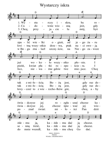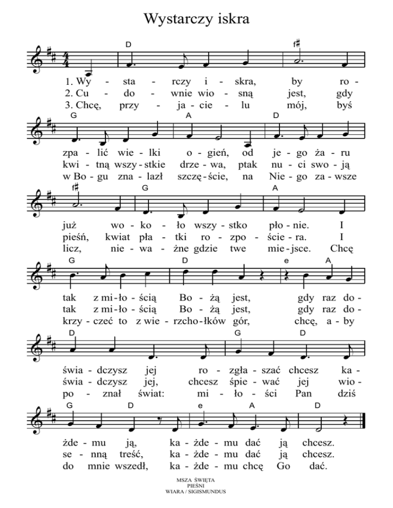 Wystarczy iskra # & # 44 & & ## ## 1. Wy - sta 2. Cu - do 3. Chcę, przy G œ. & ## - j œ œ f # œ œ œ by jest, mój, ro gdy byś œ . œj œ œ D œ ˙ œ o - gień, od drze - wa, ptak szczę - ście, na j œ œ œ. je - go ża - ru nu - ci swo - ją Nie - go za - wsze A œ œ ˙ œ wo - ko - ło wszy - stko pło - nie. kwiat pła - tki ro - zpo - ście - ra. nie - wa - żne gdzie twe mie - jsce. j œ œ œ œ œ D D œ œ œ. świa - dczysz świa - dczysz po - znał G jej jej, świat: D œ œ żde - mu ją, se - nną treść, do mnie wszedł, j œ I I Chcę e œ Œ A Œ œ tak z mi- ło - ścią Bo - żą jest, tak z mi- ło - ścią Bo - żą jest, krzy - czeć to z wie - rzcho- łków gór, œ # ˙. œ A G ˙. f rczy i - skra, wnie wio - sną ja - cie - lu zpa - lić wie - lki kwi - tną wszy - stkie w Bo - gu zna - lazł # # Gœ . & & œ. œ już pieśń, licz, ## j œ œ D œ œ gdy raz do gdy raz do chcę, a - by G D œ œ œ. ro - zgła - szać chcesz chcesz śpie - wać jej mi - ło - ści Pan e ‰ j œ. œ j œ œ. A ka - żde - mu dać ka - żde - mu dać ka - żde - mu chcę MSZA ŚWIĘTA PIEŚNI WIARA / SIGISMUNDUS j œ ją ją Go D ˙ chcesz. chcesz. dać. j œ ka wio dziś Œ