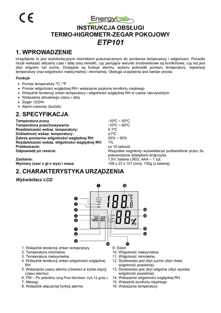 INSTRUKCJA OBSŁUGI TERMO-HIGROMETR-ZEGAR POKOJOWY ETP101 1. WPROWADZENIE Urządzenie to jest wielofunkcyjnym miernikiem przeznaczonym do pomiarów temperatury i wilgotności. Ponadto może wskazać aktualny czas i datę oraz określić, czy panujące warunki środowiskowe są komfortowe, czy też jest zbyt wilgotno lub sucho. Dostępne są funkcje alarmu, wyboru jednostki pomiaru temperatury, rejestracji temperatury oraz wilgotności maksymalnej i minimalnej. Obsługa urządzenia jest bardzo prosta. Funkcje • • • • • • Pomiar temperatury ºC / ºF Pomiar wilgotności względnej RH i wskazanie poziomu komfortu cieplnego Wskaźnik tendencji zmian temperatury i wilgotności względnej RH w czasie rzeczywistym Wskazania aktualnego czasu i daty Zegar 12/24h Alarm czasowy (budzik) 2. SPECYFIKACJA Temperatura pracy Temperatura przechowywania Rozdzielczość wskaz. temperatury: Dokładność wskaz. temperatury: Zakres pomiarów wilgotności względnej RH: Rozdzielczość wskaz. wilgotności względnej RH: Próbkowanie: Odpowiedź po resecie: Zasilanie: Wymiary (szer x gł x wys) i masa: -10ºC ~ 50ºC -10ºC ~ 60ºC 0,1ºC ±1ºC 20% ~ 90% 1% co 10 sekund Wszystkie segmenty wyświetlacza podświetlone przez 3s, potwierdzone dźwiękiem brzęczyka 1,5V: bateria LR03, AAA – 1 szt. 108 x 23 x 101 [mm], 130g (z baterią) 2. CHARAKTERYSTYKA URZĄDZENIA Wyświetlacz LCD 1. Wskaźnik tendencji zmian temperatury 2. Temperatura minimalna 3. Temperatura maksymalna 4. Wskaźnik tendencji zmian wilgotności względnej RH 5. Wskazanie czasu alarmu (również w trybie edycji czasu alarmu) 6. PM – Po południu (ang.Post Meridiem; tryb 12-godz.) 7. Miesiąc 8. Wskaźnik włączonej funkcji alarmu 9. Dzień 10. Wilgotność maksymalna 11. Wilgotność minimalna 12. Środowisko jest zbyt suche (zbyt niska wilgotność powietrza) 13. Środowisko jest zbyt wilgotne (zbyt wysoka wilgotność powietrza) 14. Wskazanie wilgotności względnej RH 15. Wskaźnik komfortu cieplnego 16. Wskazanie temperatury Przyciski Reset • Kasowanie wszystkich ustawień i powrót do stanu fabrycznego Mode • Zmiana wyświetlanej informacji: zegar (czas) lub data • Wejście do edycji ustawień zegara • W trybie edycji ustawień zegara przejście do edycji następnej pozycji (wartości) Set Alm • Zmiana wartości migoczącej pozycji (wartości) • Aktywacja / wyłączenie funkcji alarmu Alm / Clear • Wyświetlenie ustawionego czasu alarmu • Usunięcie aktualnie wyświetlonej wartości minimalnej lub maksymalnej temperatury oraz wilgotności Max./Min. • Wyświetlenie wartości maksymalnej lub minimalnej temperatury i wilgotności • Powrót do wskazywania aktualnych wartość i temperatury i wilgotności ºC / ºF (panel tylny) • Zmiana jednostki wskazań temperatury ºC lub ºF • Zmiana trybu wyświetlania zegara (12/24h) 3. OBSŁUGA 3.1 RESET Wcisnąć przycisk „RESET”, aby usunąć wszystkie ustawienia i przywrócić urządzenie do stanu fabrycznego (domyślnie: godzina 12:00 w trybie 24-godzinnym, data: 1-01 /pierwszy stycznia/). 3.2 USTAWIENIA CZASU I DATY Upewnić się, że na wyświetlaczu wskazywany jest aktualny czas. 3.2 USTAWIENIA CZASU I DATY Upewnić się, że na wyświetlaczu wskazywany jest aktualny czas. • Wcisnąć przycisk „Mode”, aby przejść między wyświetlaniem aktualnego czasu a datą. Jeśli wskazywana jest data, na wyświetlacz automatycznie wróci wskazanie czasu po około 8s. • Aby wejść w tryb edycji ustawień zegara, należy wcisnąć i przytrzymać przycisk „Mode”, aż wskazanie godziny na zegarze zacznie migotać. Migoczące wskazanie może być edytowane za pomocą przycisku „Set Alm” (dłuższe przytrzymanie spowoduje szybsze zmiany). Wciśnięcie przycisku „Mode” powoduje przejście między wskazaniami: godziny > minuty > miesiąc > dzień > opuszczenie edycji. Jeśli żaden przycisk nie zostanie wciśnięty przez 8s, nastąpi powrót do wyświetlania czasu. 3.3 ALARM (BUDZIK) W trybie wyświetlania aktualnego czasu lub daty wciśnięcie przycisku „Set Alm” powoduje aktywację lub wyłączenie funkcji alarmu. Jeśli funkcja alarmu jest aktywna, na wyświetlaczu widoczny jest symbol . 3.4 EDYCJA USTAWIEŃ ZEGARA I ALARMU Aby wyświetlić ustawiony czas alarmu, należy wcisnąć przycisk „Alm/Clear” – na wyświetlaczu pojawi się wskazanie czasu alarmu oraz symbol „AL”. Aby wejść w tryb edycji czasu alarmu, należy wcisnąć i przytrzymać przycisk „Alm/Clear”, aż wskazanie godziny czasu alarmu zacznie migotać. Wciskanie przycisku „Set Alm” powoduje zmiany migoczącego wskazania (dłuższe przytrzymanie spowoduje szybsze zmiany). W trybie edycji czasu alarmu wciskanie przycisku „Alm/Clear” powoduje przejście między wskazaniami: godziny > minuty > opuszczenie edycji. 3.5 WYŁĄCZENIE ALARMU W TRAKCIE JEGO TRWANIA Jeśli włączona jest funkcja alarmu (budzika), to w ustawionym czasie urządzenie zacznie emitować dźwięk brzęczyka przez jedną minutę. Alarm można przerwać wciskając dowolny przycisk. -2- 3.6 TEMPERATURA I WILGOTNOŚĆ WZGLĘDNA W normalnym stanie na wyświetlaczu wskazana jest aktualna wartość temperatury i wilgotności względnej. Wciśnięcie przycisku „Max./Min.” powoduje wyświetlenie maksymalnych wartości temperatury i wilgotności względnej, zarejestrowanych od czasu ostatniego kasowania tych wartości. Na wyświetlaczu widoczny jest symbol „MAX”. Ponowne wciśnięcie przycisku „Max./Min.” powoduje wyświetlenie minimalnych wartości temperatury i wilgotności względnej, zarejestrowanych od czasu ostatniego kasowania tych wartości. Na wyświetlaczu widoczny jest symbol „MIN”. Ponowne (trzecie) wciśnięcie przycisku „Max./Min.” powoduje z powrotem wyświetlenie aktualnych wartości temperatury i wilgotności względnej. Podczas, gdy na wyświetlaczu widoczne są maksymalne lub minimalne wartości temperatury i wilgotności względnej, wciśnięcie przycisku „