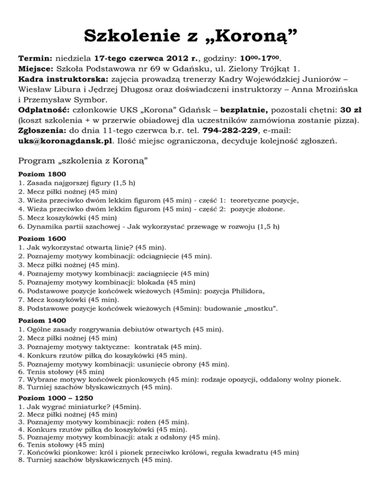 Szkolenie z „Koroną” Termin: niedziela 17-tego czerwca 2012 r., godziny: 1000-1700. Miejsce: Szkoła Podstawowa nr 69 w Gdańsku, ul. Zielony Trójkąt 1. Kadra instruktorska: zajęcia prowadzą trenerzy Kadry Wojewódzkiej Juniorów – Wiesław Libura i Jędrzej Długosz oraz doświadczeni instruktorzy – Anna Mrozińska i Przemysław Symbor. Odpłatność: członkowie UKS „Korona” Gdańsk – bezpłatnie, pozostali chętni: 30 zł (koszt szkolenia + w przerwie obiadowej dla uczestników zamówiona zostanie pizza). Zgłoszenia: do dnia 11-tego czerwca b.r. tel. 794-282-229, e-mail: [email protected]. Ilość miejsc ograniczona, decyduje kolejność zgłoszeń. Program „szkolenia z Koroną” Poziom 1800 1. Zasada najgorszej figury (1,5 h) 2. Mecz piłki nożnej (45 min) 3. Wieża przeciwko dwóm lekkim figurom (45 min) - część 1: teoretyczne pozycje, 4. Wieża przeciwko dwóm lekkim figurom (45 min) - część 2: pozycje złożone. 5. Mecz koszykówki (45 min) 6. Dynamika partii szachowej - Jak wykorzystać przewagę w rozwoju (1,5 h) Poziom 1600 1. Jak wykorzystać otwartą linię? (45 min). 2. Poznajemy motywy kombinacji: odciągnięcie (45 min). 3. Mecz piłki nożnej (45 min). 4. Poznajemy motywy kombinacji: zaciągnięcie (45 min) 5. Poznajemy motywy kombinacji: blokada (45 min) 6. Podstawowe pozycje końcówek wieżowych (45min): pozycja Philidora, 7. Mecz koszykówki (45 min). 8. Podstawowe pozycje końcówek wieżowych (45min): budowanie „mostku”. Poziom 1400 1. Ogólne zasady rozgrywania debiutów otwartych (45 min). 2. Mecz piłki nożnej (45 min) 3. Poznajemy motywy taktyczne: kontratak (45 min). 4. Konkurs rzutów piłką do koszykówki (45 min). 5. Poznajemy motywy kombinacji: usunięcie obrony (45 min). 6. Tenis stołowy (45 min) 7. Wybrane motywy końcówek pionkowych (45 min): rodzaje opozycji, oddalony wolny pionek. 8. Turniej szachów błyskawicznych (45 min). Poziom 1000 – 1250 1. Jak wygrać miniaturkę? (45min). 2. Mecz piłki nożnej (45 min) 3. Poznajemy motywy kombinacji: rożen (45 min). 4. Konkurs rzutów piłką do koszykówki (45 min). 5. Poznajemy motywy kombinacji: atak z odsłony (45 min). 6. Tenis stołowy (45 min) 7. Końcówki pionkowe: król i pionek przeciwko królowi, reguła kwadratu (45 min) 8. Turniej szachów błyskawicznych (45 min).