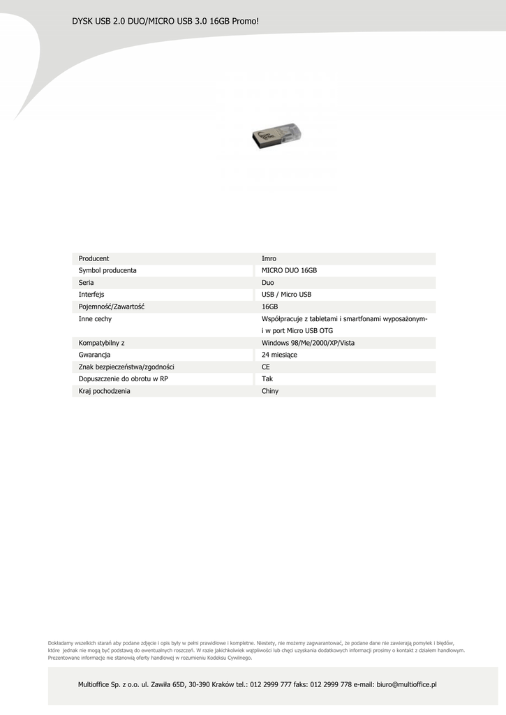 DYSK USB 2.0 DUO/MICRO USB 3.0 16GB Promo! Producent Imro Symbol producenta MICRO DUO 16GB Seria Duo Interfejs USB / Micro USB Pojemność/Zawartość 16GB Inne cechy Współpracuje z tabletami i smartfonami wyposażonymi w port Micro USB OTG Kompatybilny z Windows 98/Me/2000/XP/Vista Gwarancja 24 miesiące Znak bezpieczeństwa/zgodności CE Dopuszczenie do obrotu w RP Tak Kraj pochodzenia Chiny Dokładamy wszelkich starań aby podane zdjęcie i opis były w pełni prawidłowe i kompletne. Niestety, nie możemy zagwarantować, że podane dane nie zawierają pomyłek i błędów, które jednak nie mogą być podstawą do ewentualnych roszczeń. W razie jakichkolwiek wątpliwości lub chęci uzyskania dodatkowych informacji prosimy o kontakt z działem handlowym. Prezentowane informacje nie stanowią oferty handlowej w rozumieniu Kodeksu Cywilnego. Multioffice Sp. z o.o. ul. Zawiła 65D, 30-390 Kraków tel.: 012 2999 777 faks: 012 2999 778 e-mail: [email protected]