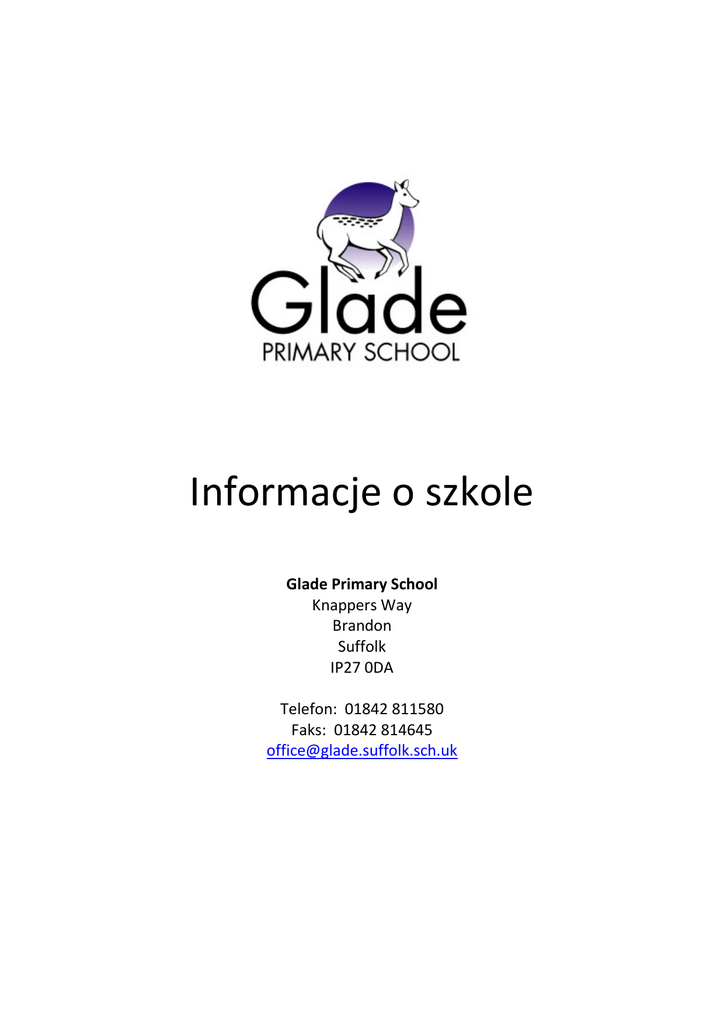 Informacje o szkole Glade Primary School Knappers Way Brandon Suffolk IP27 0DA Telefon: 01842 811580 Faks: 01842 814645 [email protected] Witamy w Szkole Podstawowej Glade Oto krótki przewodnik o tym, co powinieneś wiedzieć, skoro Twoje dziecko uczy się w Glade. Godziny szkolne 08:40–08:50 08:50 12:00–13:00 13:00–15:15 15:15 Nauczyciele są na placu zabaw Początek zajęć Obiad Lekcje Koniec zajęć Nieobecności/spóźnienia Należy dopilnować, aby dziecko przychodziło do szkoły punktualnie. Dzieci powinny przychodzić do szkoły od 08:40, a najpóźniej o 08:50, gdy dzwoni dzwonek i dzieci wchodzą do klasy. Dzieci, które przyjdą po sprawdzeniu obecności, czyli po 08:50, muszą najpierw zgłosić się do sekretariatu w celu zarejestrowania swojej obecności i załatwienia spraw związanych z obiadem. Jesteśmy zobowiązani do odnotowywania wszystkich nieobecności i spóźnień. Nieobecność jest oznaczana jako usprawiedliwiona, jeżeli wystąpiła z powodów medycznych lub religijnych. W przypadku niepodania uzasadnionego powodu lub jego niezgodności z powyższymi kategoriami, nieobecność zostanie oznaczona jako nieusprawiedliwiona. W trakcie trwania semestru rodzice nie są uprawnieni do zabierania ze sobą dzieci na urlop. Mogą jednak poprosić o specjalne pozwolenie na nieobecność, która zostanie usprawiedliwiona z poniższych powodów: • • • Rodzice pracują w sektorze usług lub są pozostałymi pracownikami, którzy nie otrzymują urlopu w trakcie wakacji szkolnych. Rodzina musi przebywać razem i wzajemnie się wspierać w trakcie lub po okresie trudnej sytuacji. Rodzice podlegają ustalonemu porządkowi urlopów, który nie może być zmieniony oraz przedstawiono dowód na to. Jeżeli dziecko będzie miało co najmniej pięć dni nieusprawiedliwionych nieobecności w semestrze, rodzice mogą otrzymać mandat karny. Mandat wynosi 60 funtów na rodzica za jedno dziecko. W celu uzyskania dalszych informacji prosimy o kontakt z dyrektorem szkoły. Udostępniamy również broszurę informacyjną dla rodziców i opiekunów. 2 Mundurek szkolny Wszystkie dzieci są zobowiązane do noszenia mundurków i muszą mieć bluzę lub sweter szkolny. Bluzy, koszulki polo, polary i swetry można zamówić na stronie www.schooluniformsplus.co.uk z dostawą do domu. Szkoła nie posiada zapasu mundurków. Chłopcy: Szare lub czarne spodnie (lub szorty w semestrze letnim) Niebieskie lub białe koszulki/polo (z kołnierzem) Czarne, szare lub niebieskie skarpetki Dziewczęta: Szare lub czarne spódnice lub spodnie (lub szorty w semestrze letnim) Niebieskie lub białe koszulki/polo (z kołnierzem) Czarne, szare, niebieskie lub białe skarpetki albo rajstopy Letnie sukienki w niebieską kratkę lub niebieskie paski Obuwie powinno być zwykłe: czarne buty lub buty sportowe/tenisówki. Obuwie musi być jednolite: czarne bez innych oznaczeń, płaskie lub prawie płaskie i odpowiednie do biegania na placu zabaw. Strój na zajęcia wychowania fizycznego (WF): Czarne spodenki i biały t-shirt. Tenisówki lub buty do sportów na świeżym powietrzu. Podeszwa tenisówek powinna zapewniać dobrą przyczepność. Zwykły dres nakładany na strój do WF podczas zimnej pogody. Strój na basen: spodenki kąpielowe dla chłopców i kostiumy kąpielowe (nie bikini) dla dziewcząt. Wszystkie dzieci są zobowiązane do noszenia czepka na basenie. Dzieci muszą posiadać podpisany i ściągany na sznurek worek do WF. Włosy Wszystkie dzieci, dziewczęta i chłopcy są zobowiązane do związywania wystarczająco długich włosów. Jest to ważne zarówno ze względu na zdrowie i bezpieczeństwo jak i elegancki wygląd i gotowość do nauki w szkole. Włosy muszą być związane w czasie zajęć WF. W czasie pływania wszystkie dzieci są zobowiązane do noszenia czepka. Dzieci nie powinny mieć fryzur ekstremalnych, takich jak Mohikanin lub włosy z wygolonymi partiami. Biżuteria i rzeczy wartościowe Jedyna dopuszczalna biżuteria w szkole to drobne kolczyki w uszach (po jednym kolczyku w uchu). Pozostała biżuteria jest niedozwolona. Jeśli dzieci są posyłane do szkoły z kolczykami, których nie można usunąć, ponieważ uszy przekłuto w ciągu ostatnich sześciu tygodni, rodzice są zobowiązani do naklejenia taśmy na uszy w celu pokrycia ich na lekcjach wychowania fizycznego. Zguba własności dziecka w szkole może być przykra, a wypadków spowodowanych przez dzieci, które depczą kolczyki w czasie WF należy unikać. W szkole można nosić zegarki. 3 Należy pamiętać, aby wyraźnie podpisać imieniem i nazwiskiem dziecka wszystkie worki, mundurki i strój na WF. Szkoła nie ponosi odpowiedzialności za przedmioty wartościowe i biżuterię przyniesioną do szkoły przez dzieci. Szkolne obiady Nasze szkolne kuchnie zapewniają obiady, które są zarówno smaczne jak i zbilansowane. Menu zmienia się co tydzień, a dzieci mogą wybierać każdego dnia: mięso / rybę lub potrawy wegetariańskie. Dzieci mogą wybierać do obiadu warzywa lub surówkę, owoce są zawsze dostępne wraz z codziennym deserem. Szkolne obiady są mają bardzo korzystna jakość w stosunku do ceny. Lista menu jest wysyłana do domu na początku każdego semestru, ponadto, dla przypomnienia, wisi również w recepcji szkoły. Zwykle dzieci jedzą szkolny obiad albo suchy prowiant (packed lunch) i nie jest to zamienne w ciągu tygodnia. Wszystkie posiłki należy opłacać z wyprzedzeniem, korzystając ze strony ParentMail (www.parentmail2.co.uk). Rodzice mogą „doładować” konto dziecka przy użyciu karty kredytowej, debetowej lub konta PayPal. Można też zapłacić gotówką w sekretariacie szkoły. Minimalna kwota doładowania wynosi 10 funtów na dziecko. Dzieci, których rodzice otrzymują zasiłek Income Support lub Income Based Job Seekers Allowance są uprawnieni do bezpłatnych obiadów szkolnych; formularz wniosku jest dostępny w sekretariacie szkoły. W porze lunchu suchy prowiant n