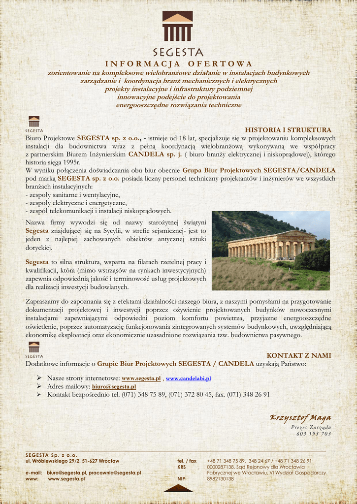 INFORMACJA OFERTOWA zorientowanie na kompleksowe wielobranżowe działanie w instalacjach budynkowych zarządzanie i koordynacja branż mechanicznych i elektrycznych projekty instalacyjne i infrastruktury podziemnej innowacyjne podejście do projektowania energooszczędne rozwiązania techniczne HISTORIA I STRUKTURA Biuro Projektowe SEGESTA sp. z o.o., - istnieje od 18 lat, specjalizuje się w projektowaniu kompleksowych instalacji dla budownictwa wraz z pełną koordynacją wielobranżową wykonywaną we współpracy z partnerskim Biurem Inżynierskim CANDELA sp. j. ( biuro branży elektrycznej i niskoprądowej), którego historia sięga 1995r. W wyniku połączenia doświadczania obu biur obecnie Grupa Biur Projektowych SEGESTA/CANDELA pod marką SEGESTA sp. z o.o. posiada liczny personel techniczny projektantów i inżynierów we wszystkich branżach instalacyjnych: - zespoły sanitarne i wentylacyjne, - zespoły elektryczne i energetyczne, - zespół telekomunikacji i instalacji niskoprądowych. Nazwa firmy wywodzi się od nazwy starożytnej świątyni Segesta znajdującej się na Sycylii, w strefie sejsmicznej- jest to jeden z najlepiej zachowanych obiektów antycznej sztuki doryckiej. Segesta to silna struktura, wsparta na filarach rzetelnej pracy i kwalifikacji, która (mimo wstrząsów na rynkach inwestycyjnych) zapewnia odpowiednią jakość i terminowość usług projektowych dla realizacji inwestycji budowlanych. Zapraszamy do zapoznania się z efektami działalności naszego biura, z naszymi pomysłami na przygotowanie dokumentacji projektowej i inwestycji poprzez ożywienie projektowanych budynków nowoczesnymi instalacjami zapewniającymi odpowiedni poziom komfortu powietrza, przyjazne energooszczędne oświetlenie, poprzez automatyzację funkcjonowania zintegrowanych systemów budynkowych, uwzględniającą ekonomikę eksploatacji oraz ekonomicznie uzasadnione rozwiązania tzw. budownictwa pasywnego. KONTAKT Z NAMI Dodatkowe informacje o Grupie Biur Projektowych SEGESTA / CANDELA uzyskają Państwo: Nasze strony internetowe: www.segesta.pl , www.candelabi.pl Adres mailowy: [email protected] Kontakt bezpośrednio tel. (071) 348 75 89, (071) 372 80 45, fax. (071) 348 26 91 Krzysztof Maga Pr eze s Za rząd u 603 19 3 7 03 SEGESTA Sp. z o.o. ul. Wróblewskiego 29/2, 51-627 Wrocław e-mail: [email protected], [email protected] www: www.segesta.pl tel. / fax KRS NIP +48 71 348 75 89, 348 24 67 / +48 71 348 26 91 0000287138, Sąd Rejonowy dla Wrocławia Fabrycznej we Wrocławiu, VI Wydział Gospodarczy 8982130138 KIM JESTEŚMY I CO NAS WYRÓŻNIA SEGESTA to wielobranżowe instalacyjne biuro projektowe zapewniające usługi inżynierskokonsultingowe oraz projektowe z pełną koordynacją oraz integracją systemów budynkowych. SEGESTA to wzajemnie skoordynowane wszystkie branże instalacyjne instalacje sanitarne i gazowe, wentylacja i klimatyzacja oraz ciepłownictwo, instalacje elektryczne wraz z automatyką, instalacje teletechniczne i niskoprądowe BMS,SMS oraz AKPiA. SEGESTA to pewność wykonania usługi z rzetelnym i interdyscyplinarnym podejściem do analizowanych zagadnień technicznych i formalno – prawnych całego procesu budowlanego SEGESTA to uwzględnianie wymagań rynku i przepisów budowlanych, przy zastosowaniu energooszczędnych i ekologicznych rozwiązań technicznych Jeden z obiektów wybudowanych na podstawie naszej dokumentacji – Zespół budynków biurowych firmy SKANSKA Grunwaldzki Center we Wrocławiu, jako pierwszy na Dolnym Śląsku, spełnił warunki stawiane przez Komisję Europejską w zakresie certyfikacji nieruchomości w systemie GreenBuilding- LEED. CO JEST DLA NAS WAŻNE Profesjonalizm Rzetelność Wiarygodność Terminowość Sumienność Odpowiedzialność Pozytywne zaangażowanie w relacje z wszystkimi uczestnikami procesu inwestycyjnego JAK PRACUJEMY Dynamicznie, elastycznie, z pełnym zaangażowaniem uwzględniając specyficzne wymagania różnych Zleceniodawców Dostosowujemy się do wizji architektonicznej i organizacyjnej budynku Rozwiązujemy problemy inżynieryjno – techniczne Uwzględniamy odpowiednie procedury zarządzania projektami i procesem budowlanym Integrujemy pracę poszczególnych systemów i instalacji Stosujemy energooszczędne rozwiązania techniczne, analizując każdorazowo funkcjonalność przedstawianych propozycji Poszerzamy stale swoją wiedzę i umiejętności. Włączamy ekologiczne aspekty przy projektowaniu nowoczesnych, inteligentnych i pasywnych obiektów. KO M PL E K S OWE P RO JE KT Y I N STAL A C Y JN E DOKUMENTACJA KONSULTING ANALIZY KOSZTOWE 2 SZEŚĆ PODSTAWOWYCH OBSZARÓW NASZEJ DZIAŁALNOŚCI 1. INSTALACJE SANITARNE I GAZOWE Instalacje sanitarne wody użytkowej kanalizacji sanitarnej i deszczowej, grzewcze - centralnego ogrzewania i ciepła technologicznego gazowe tryskaczowe Sieci i przyłącza sanitarne wodno - kanalizacyjne cieplne i gazowe 2. KLIMATYZACJA I WENTYLACJA Klimatyzacja Instalacje chłodu Wentylacja bytowa i oddymiania 3. INSTALACJE ELEKTRYCZNE Instalacje elektryczne Oświetlenie i gniazda wtykowe Obwody siłowe i dystrybucja mocy Automatyka budynkowa Inteligentne instalacje Sterowanie i automatyka Sieci energetyczne – linie kablowe i napowietrzne Stacje transformatorowe, agregatornie 4. INSTALACJE NISKOPRĄDOWE Instalacji łączności i komunikacji: sieci strukturalne, interkomu, nagłośnienia (PA), Audio -Video (AV), RTV Instalacje ochrony mienia: Sygnalizacji Włamania i Napadu (SWIN), TV dozorowej (CCTV), kontroli dostępu (KD) oraz rozliczeń klientów, domofonowe; Instalacje bezpieczeństwa: System Sygnalizacji Pożaru (SSP), Instalacje Sterowania Oddymianiem (SOD), System detekcji gazu (CO, LPG), Dźwiękowe Systemy Ostrzegawcze (DSO) 5. SYSTEM BMS – monitorowanie i sterowanie pracy instalacji i zintegrowanych systemów budynkowych. 6. SYSTEM SMS – monitorowanie i sterowanie pracy instalacji i systemów bezpieczeństwa budynków. KO M PL E K S OWE P RO JE KT Y I N STAL 