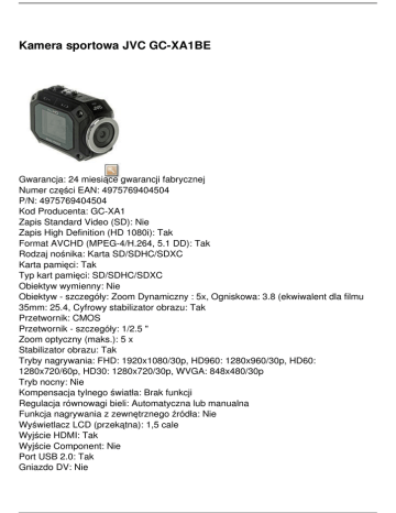 Kamera sportowa JVC GC-XA1BE Gwarancja: 24 miesiące gwarancji fabrycznej Numer części EAN: 4975769404504 P/N: 4975769404504 Kod Producenta: GC-XA1 Zapis Standard Video (SD): Nie Zapis High Definition (HD 1080i): Tak Format AVCHD (MPEG-4/H.264, 5.1 DD): Tak Rodzaj nośnika: Karta SD/SDHC/SDXC Karta pamięci: Tak Typ kart pamięci: SD/SDHC/SDXC Obiektyw wymienny: Nie Obiektyw - szczegóły: Zoom Dynamiczny : 5x, Ogniskowa: 3.8 (ekwiwalent dla filmu 35mm: 25.4, Cyfrowy stabilizator obrazu: Tak Przetwornik: CMOS Przetwornik - szczegóły: 1/2.5 " Zoom optyczny (maks.): 5 x Stabilizator obrazu: Tak Tryby nagrywania: FHD: 1920x1080/30p, HD960: 1280x960/30p, HD60: 1280x720/60p, HD30: 1280x720/30p, WVGA: 848x480/30p Tryb nocny: Nie Kompensacja tylnego światła: Brak funkcji Regulacja równowagi bieli: Automatyczna lub manualna Funkcja nagrywania z zewnętrznego źródła: Nie Wyświetlacz LCD (przekątna): 1,5 cale Wyjście HDMI: Tak Wyjście Component: Nie Port USB 2.0: Tak Gniazdo DV: Nie Gniazdo AV: Nie Gniazdo S-Video (mini DIN): Nie Wbudowana lampa błyskowa: Nie Wbudowana lampa video: Wymiary (wys x szer x gr): 53x 74x 35 mm Wyposażenie: akumulator, kabels USB,folia ochronna na ekran LCD, osłona obiektywu x 2, Uniwersalne Mocowanie (np na kask), Mocowanie do gogli. Opis: Kamera sportowa JVC, wodoodporna do 5m, odporna na upadki do 2m, pyło i mrozoodporna do -10 stopni C - nie wymaga stosowania dodatkowej obudowy ochronnej Informacje dodatkowe: Wi-Fi, Time-Lapse REC, łączność ze smartfonem Strona www: http://www.adixxion.pl / Zoom cyfrowy (maks.): 5 x Regulacja ostrości: Automatyczna Zdjęcia - rozdzielczość: 5 Megapikseli Waga: 126 g P/N:: 4975769404504 Numer części EAN:: 4975769404504 Cena: 878.40 PLN Powered by TCPDF (www.tcpdf.org)