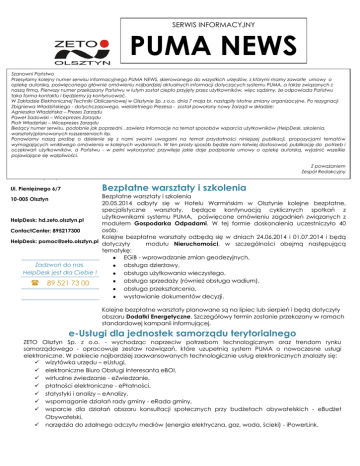 SERWIS INFORMACYJNY PUMA NEWS Zmieniamy się dla przyszłości Szanowni Państwo Przesyłamy kolejny numer serwisu informacyjnego PUMA NEWS, skierowanego do wszystkich urzędów, z którymi mamy zawarte umowy o opiekę autorską, poświęconego głównie omówieniu najbardziej aktualnych informacji dotyczących systemu PUMA, a także związanych z naszą firmą. Pierwszy numer przekazany Państwu w lutym został ciepło przyjęty przez użytkowników, więc sądzimy, że odpowiada Państwu taka forma kontaktu i będziemy ją kontynuować. W Zakładzie Elektronicznej Techniki Obliczeniowej w Olsztynie Sp. z o.o. dnia 7 maja br. nastąpiły istotne zmiany organizacyjne. Po rezygnacji Zbigniewa Władzińskiego - dotychczasowego, wieloletniego Prezesa - został powołany nowy Zarząd w składzie: Agnieszka Władzińska – Prezes Zarządu Paweł Sadowski – Wiceprezes Zarządu Piotr Władziński – Wiceprezes Zarządu Bieżący numer serwisu, podobnie jak poprzedni , zawiera informacje na temat sposobów wsparcia użytkowników (HelpDesk, szkolenia, warsztaty)planowanych rozszerzeniach itp. Ponawiamy naszą prośbę o dzielenie się z nami swoimi uwagami na temat przydatności niniejszej publikacji, propozycjami tematów wymagających wnikliwego omówienia w kolejnych wydaniach. W ten prosty sposób będzie nam łatwiej dostosować publikację do potrzeb i oczekiwań użytkowników, a Państwu - w pełni wykorzystać przywileje jakie daje podpisanie umowy o opiekę autorską, wyjaśnić wszelkie pojawiające się wątpliwości. HelpDesk PUMA Z poważaniem Zespół Redakcyjny ZETO Olsztyn Sp. z o.o. Ul. Pieniężnego 6/7 Bezpłatne warsztaty i szkolenia Bezpłatne warsztaty i szkolenia 20.05.2014 odbyły się w Hotelu Warmińskim w Olsztynie kolejne bezpłatne, specjalistyczne warsztaty, będące kontynuacją cyklicznych spotkań z użytkownikami systemu PUMA, poświęcone omówieniu zagadnień związanych z HelpDesk: hd.zeto.olsztyn.pl modułem Gospodarka Odpadami. W tej formie doskonalenia uczestniczyło 40 osób. ContactCenter: 895217300 Kolejne bezpłatne warsztaty odbędą się w dniach 24.06.2014 i 01.07.2014 i będą HelpDesk: [email protected] dotyczyły modułu Nieruchomości, w szczególności obejmą następującą tematykę: EGiB - wprowadzanie zmian geodezyjnych, Zadzwoń do nas. obsługa dzierżawy, HelpDesk jest dla Ciebie ! obsługa użytkowania wieczystego, obsługa sprzedaży (również obsługa wadium), 89 521 73 00 obsługa przekształcenia, wystawianie dokumentów decyzji. 10-005 Olsztyn Kolejne bezpłatne warsztaty planowane są na lipiec lub sierpień i będą dotyczyły obszaru Dodatki Energetyczne. Szczegółowy termin zostanie przekazany w ramach standardowej kampanii informującej. e-Usługi dla jednostek samorządu terytorialnego ZETO Olsztyn Sp. z o.o. - wychodząc naprzeciw potrzebom technologicznym oraz trendom rynku samorządowego - opracowuje zestaw rozwiązań, które uzupełnią system PUMA o nowoczesne usługi elektroniczne. W pakiecie najbardziej zaawansowanych technologicznie usług elektronicznych znalazły się: wizytówka urzędu – eUsługi, elektroniczne Biuro Obsługi Interesanta eBOI, wirtualne zwiedzanie - eZwiedzanie, płatności elektroniczne - ePłatności, statystyki i analizy – eAnalizy, wspomaganie działań rady gminy - eRada gminy, wsparcie dla działań obszaru konsultacji społecznych przy budżetach obywatelskich - eBudżet Obywatelski, narzędzia do zdalnego odczytu mediów (energia elektryczna, gaz, woda, ścieki) - iPowerLink. STRONA 2 PUMA – NEWS Dodatkowe rozszerzenia systemu PUMA W okresie od lutego 2014 do kwietnia 2014 niezależnie od bieżącej aktualizacji systemu w kolejnych wersjach systemu PUMA pojawiło się około 25 dodatkowych, bezpłatnych funkcjonalności wspierających między innymi obszary gospodarki odpadami, kasy, kadr, ewidencję ludności i inne. Najważniejsze z nich to: W ramach modułu Kadry została dodana informacja miesięczna o zatrudnieniu, kształceniu lub działalności na rzecz osób niepełnosprawnych INF – 1 dla pracodawców zatrudniających powyżej dwudziestu pięciu pracowników w przeliczeniu na pełny wymiar czasu pracy i osiągających co najmniej 6 % wskaźnik zatrudnienia osób niepełnosprawnych. W ramach modułu Gospodarka odpadami – Opłaty: wprowadzono do systemu nową funkcjonalność umożliwiającą dodawanie deklaracji na podstawie innej już istniejącej w systemie, co w znacznym stopniu przyczynia się do skrócenia czasu wprowadzania korekt deklaracji dla mieszkańców, rozszerzono funkcjonalność anulowania deklaracji o możliwość anulowania naliczenia tylko ostatniego roku, na który deklaracja została naliczona, do obsługi deklaracji dostępnych w module wprowadzona została również możliwość oznaczania na deklaracji miesięcy, na które ma ona zostać naliczona, dodano możliwość określenia na etapie wprowadzania deklaracji do systemu informacji, czy z danej nieruchomości będzie odbierany popiół; zgromadzone informacje odnośnie odbioru popiołu prezentowane są również na szczegółowym zestawieniu punktów adresowych. W ramach modułu Kasa wprowadzono możliwość wyboru zawartości drukowanej na dowodzie wpłaty; dzięki rozszerzeniu o nowy parametr w ustawieniach modułu istnieje opcja wyboru czy drukowane mają być pola Sprawdził / Zatwierdził, czy ma być pozostawione miejsce na pieczęć. W ramach modułu Urząd Stanu Cywilnego dodano możliwość drukowania w oparciu o dwa nowe szablony dla zawiadomień o przypiskach. W ramach modułu Eksporty danych rozszerzono funkcjonalność generowania wyciągu adresowego o informację dotyczącą numeru obwodu wyborczego bądź opcjonalnie okręgu wyborczego. W ramach modułu Ewidencja Ludności: zrealizowano modyfikację polegającą na automatycznej aktualizacji danych rejestru dodatkowego / niegłosujących w module WYBORCY w wyniku wykonania operacji zmiany danych (pesel, imię, nazwisko, oby