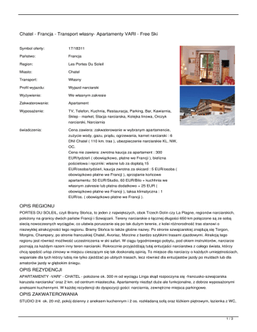 Chatel - Francja - Transport własny- Apartamenty VARI - Free Ski Symbol oferty: 17/18311 Państwo: Francja Region: Les Portes Du Soleil Miasto: Chatel Transport: Własny Profil wyjazdu: Wyjazd narciarski Wyżywienie: We własnym zakresie Zakwaterowanie: Apartament Wyposażenie: TV, Telefon, Kuchnia, Restauracja, Parking, Bar, Kawiarnia, Sklep - market, Stacja narciarska, Kolejka linowa, Orczyk narciarski, Narciarnia świadczenia: Cena zawiera: zakwaterowanie w wybranym apartamencie, zużycie wody, gazu, prądu, ogrzewania, karnet narciarski : 6 DNI Chatel ( 110 km. tras ), ubezpieczenie narciarskie KL, NW, OC. Cena nie zawiera: zwrotna kaucja za apartament : 300 EUR/tydzień ( obowiązkowo, płatne we Francji ), bielizna pościelowa i ręczniki: własne lub za dopłatą 15 EUR/osoba/tydzień, kaucja zwrotna za skicard : 5 EUR/osoba ( obowiązkowo płatne we Francji ), sprzątanie końcowe apartamentu: 50 EUR/Studio, 60 EUR/Bilo + kuchhnia we własnym zakresie lub płatna dodatkowo + 25 EUR ( obowiązkowo płatne we Francji ), taksa klimatyczna : 1 EUR/os. ( obowiązkowo płatne we Francji ). OPIS REGIONU PORTES DU SOLEIL, czyli Bramy Słońca, to jeden z największych, obok Trzech Dolin czy La Plagne, regionów narciarskich, położony na granicy dwóch państw Francji i Szwajcarii. Tereny narciarskie o łącznej długości 650 km połączone są ze sobą siecią nowoczesnych wyciągów, co ułatwia poruszanie się po tak dużym terenie, z kolei różnorodność tras stanowi o niezwykłej atrakcyjności tego regionu. Bramy Słońca to także głośne nazwy. Po stronie szwajcarskiej znajdują się Torgon, Morgins, Champery, po stronie francuskiej Chatel, Avoriaz, Morzine z bardzo szybkimi trasami zjazdowymi. Atrakcją tego regionu jest również możliwość uczestniczenia w ski safari. W ciągu tygodniowego pobytu, pod okiem instruktorów, narciarze poznają za każdym razem inny teren narciarski. Rokrocznie przyjeżdżają tutaj entuzjaści narciarstwa z całego świata, którzy chcą spędzić urlop zimowy w miejscu cieszącym się tak doskonałą opinią. To miejsce dla narciarzy o każdych umiejętnościach, wspaniałe dla tych którzy lubią nie tylko zjeżdżać po ubitych trasach, lecz również dla entuzjastów jazdy po muldach lub dla amatorów jazdy w głębokim śniegu. OPIS REZYDENCJI APARTAMENTY -VARI” - CHATEL - położone ok. 300 m od wyciągu Linga skąd rozpoczyna się -francusko-szwajcarska karuzela narciarska” oraz 2 km. od centrum miasteczka. Apartamenty niezbyt duże ale funkcjonalne, z dobrze wyposażonymi aneksami kuchennymi. W każdej rezydencji do dyspozycji gości: narciarnia, zewnętrzne miejsca parkingowe. OPIS ZAKWATEROWANIA STUDIO 2/4 ok. 20 m2, pokój dzienny z aneksem kuchennym i 2 os. rozkładaną sofą oraz łóżkiem piętrowym, łazienka z WC, 1/3 TV. BILO 3/5 ok. 25 m2, pokój dzienny z aneksem kuchennym i 2 os. rozkładaną sofą oraz łóżkiem piętrowym, sypialnia 2 osobowa, łazienka z WC, TV. CENA ZAWIERA -zakwaterowanie w wybranym apartamencie - zużycie wody, gazu, prądu, ogrzewania, miejsce parkingowe (jedno dla apartamentu) - karnet narciarski: 6 DNI Chatel (110 km. tras narciarskich) - ubezpieczenie narciarskie: KL, NW, OC CENA NIE ZAWIERA - zwrotna kaucja za apartament: 300 EUR/tydzień (obowiązkowo, płatne we Francji) - sprzątanie końcowe apartamentu: 50/Studio, 60 EUR/Bilo + kuchnia we własnym zakresie lub płatna dodatkowo + 25 EUR (obowiązkowo, płatne we Francji) - kaucja zwrotna za skicard: 5 EUR/osoba (obowiązkowo płatne we Francji) - taksa klimatyczna: 1 EUR/osoba (obowiązkowo płatne we Francji) ZNIŻKI - zniżki dla dzieci i młodzieży oraz seniorów pow. 65 lat UWAGI - apartamenty nie są wyposażone w środki czystości, papier toaletowy, worki na śmieci itp. - zakwaterowanie w dniu przyjazdu 16.00-19.00, wykwaterowanie w dniu wyjazdu do godz. 09.00 TERMINY: od: 2017-03-04 do: 2017-03-11 (8 dni), miejsca: zamów cena od: 1306 PLN = 304 EUR dodatkowe informacje/uwagi: Skipass 6 dni Chatel - w cenie od: 2017-03-11 do: 2017-03-18 (8 dni), miejsca: zamów cena od: 1150 PLN = 267 EUR dodatkowe informacje/uwagi: Skipass 6 dni Chatel - w cenie od: 2017-03-18 do: 2017-03-25 (8 dni), miejsca: zamów cena od: 1161 PLN = 270 EUR dodatkowe informacje/uwagi: Skipass 6 dni Chatel - w cenie od: 2017-03-25 do: 2017-04-01 (8 dni), miejsca: zamów cena od: 1075 PLN = 250 EUR dodatkowe informacje/uwagi: Skipass 6 dni Chatel - w cenie od: 2017-04-01 do: 2017-04-08 (8 dni), miejsca: zamów cena od: 1075 PLN = 250 EUR dodatkowe informacje/uwagi: Skipass 6 dni Chatel - w cenie od: 2017-04-08 do: 2017-04-15 (8 dni), miejsca: zamów cena od: 1075 PLN = 250 EUR dodatkowe informacje/uwagi: Skipass 6 dni Chatel - w cenie CENNIK: Długość pobytu: 8 dni 8 dni 8 dni 8 dni Grupa cenowa: F C D B 15 15 15 1275 1260 1170 105 110 95 1020 1010 940 Ubezpieczenie (obligatoryjne) (*) Ubezpieczenie narciarskie KL,NW, OC 15 Pobyt w obiekcie (do wyboru) Apartament Bilo 5 standardowo dla osób: 5 minimalnie: 2 1440 Wolne łóżko w apartamencie 110 (*) Apartament Studio 4 standardowo dla osób: 4 minimalnie: 2 1155 Waluta: EUR Aktualne ceny z systemu S.A.R.T. (-) - cena usługi, podatku kalkulowana przy osobie lub gratis 2/3 (*) - kwota wliczona w cenę standardową 3/3