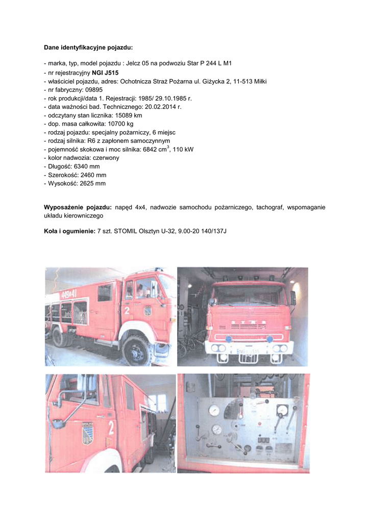 Dane identyfikacyjne pojazdu: - marka, typ, model pojazdu : Jelcz 05 na podwoziu Star P 244 L M1 - nr rejestracyjny NGI J515 właściciel pojazdu, adres: Ochotnicza Straż Pożarna ul. Giżycka 2, 11-513 Miłki nr fabryczny: 09895 rok produkcji/data 1. Rejestracji: 1985/ 29.10.1985 r. data ważności bad. Technicznego: 20.02.2014 r. odczytany stan licznika: 15089 km dop. masa całkowita: 10700 kg rodzaj pojazdu: specjalny pożarniczy, 6 miejsc rodzaj silnika: R6 z zapłonem samoczynnym 3 pojemność skokowa i moc silnika: 6842 cm , 110 kW kolor nadwozia: czerwony Długość: 6340 mm Szerokość: 2460 mm Wysokość: 2625 mm Wyposażenie pojazdu: napęd 4x4, nadwozie samochodu pożarniczego, tachograf, wspomaganie układu kierowniczego Koła i ogumienie: 7 szt. STOMIL Olsztyn U-32, 9.00-20 140/137J