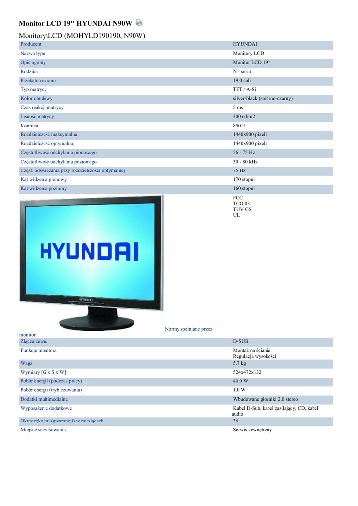 Monitor LCD 19" HYUNDAI N90W Monitory\LCD (MOHYLD190190, N90W) Producent HYUNDAI Nazwa typu Monitory LCD Opis ogólny Monitor LCD 19" Rodzina N - seria Przekątna ekranu 19.0 cali Typ matrycy TFT / A-Si Kolor obudowy silver-black (srebrno-czarny) Czas reakcji matrycy 5 ms Jasność matrycy 300 cd/m2 Kontrast 850 :1 Rozdzielczość maksymalna 1440x900 pixeli Rozdzielczość optymalna 1440x900 pixeli Częstotliwość odchylania pionowego 56 - 75 Hz Częstotliwość odchylania poziomego 30 - 80 kHz Częst. odświeżania przy rozdzielczości optymalnej 75 Hz Kąt widzenia pionowy 170 stopni Kąt widzenia poziomy 160 stopni FCC TCO 03 TUV GS UL Normy spełniane przez monitor Złącza zewn. Funkcje monitora D-SUB Waga Montaż na ścianie Regulacja wysokości 5.7 kg Wymiary [G x S x W] 524x472x132 Pobór energii (podczas pracy) 40.0 W Pobór energii (tryb czuwania) 1.0 W Dodatki multimedialne Wbudowane głośniki 2.0 stereo Wyposażenie dodatkowe Okres rękojmi (gwarancji) w miesiącach Kabel D-Sub, kabel zasilający, CD, kabel audio 36 Miejsce serwisowania Serwis zewnętrzny
