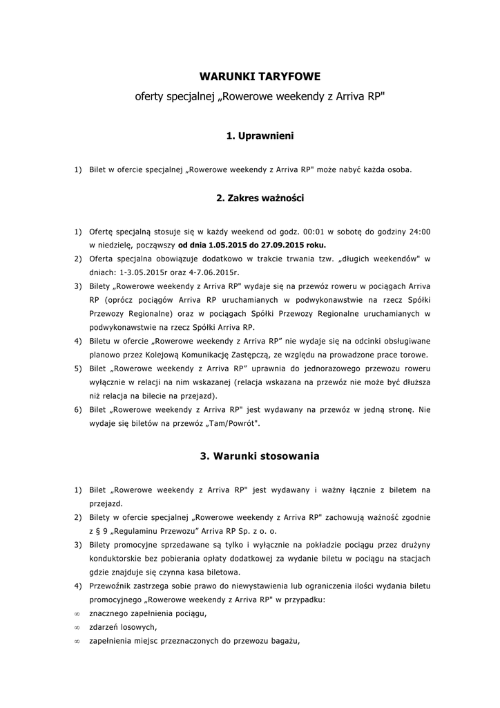WARUNKI TARYFOWE oferty specjalnej „Rowerowe weekendy z Arriva RP" 1. Uprawnieni 1) Bilet w ofercie specjalnej „Rowerowe weekendy z Arriva RP" może nabyć każda osoba. 2. Zakres ważności 1) Ofertę specjalną stosuje się w każdy weekend od godz. 00:01 w sobotę do godziny 24:00 w niedzielę, począwszy od dnia 1.05.2015 do 27.09.2015 roku. 2) Oferta specjalna obowiązuje dodatkowo w trakcie trwania tzw. „długich weekendów" w dniach: 1-3.05.2015r oraz 4-7.06.2015r. 3) Bilety „Rowerowe weekendy z Arriva RP" wydaje się na przewóz roweru w pociągach Arriva RP (oprócz pociągów Arriva RP uruchamianych w podwykonawstwie na rzecz Spółki Przewozy Regionalne) oraz w pociągach Spółki Przewozy Regionalne uruchamianych w podwykonawstwie na rzecz Spółki Arriva RP. 4) Biletu w ofercie „Rowerowe weekendy z Arriva RP” nie wydaje się na odcinki obsługiwane planowo przez Kolejową Komunikację Zastępczą, ze względu na prowadzone prace torowe. 5) Bilet „Rowerowe weekendy z Arriva RP” uprawnia do jednorazowego przewozu roweru wyłącznie w relacji na nim wskazanej (relacja wskazana na przewóz nie może być dłuższa niż relacja na bilecie na przejazd). 6) Bilet „Rowerowe weekendy z Arriva RP" jest wydawany na przewóz w jedną stronę. Nie wydaje się biletów na przewóz „Tam/Powrót". 3. Warunki stosowania 1) Bilet „Rowerowe weekendy z Arriva RP" jest wydawany i ważny łącznie z biletem na przejazd. 2) Bilety w ofercie specjalnej „Rowerowe weekendy z Arriva RP" zachowują ważność zgodnie z § 9 „Regulaminu Przewozu” Arriva RP Sp. z o. o. 3) Bilety promocyjne sprzedawane są tylko i wyłącznie na pokładzie pociągu przez drużyny konduktorskie bez pobierania opłaty dodatkowej za wydanie biletu w pociągu na stacjach gdzie znajduje się czynna kasa biletowa. 4) Przewoźnik zastrzega sobie prawo do niewystawienia lub ograniczenia ilości wydania biletu promocyjnego „Rowerowe weekendy z Arriva RP" w przypadku: • znacznego zapełnienia pociągu, • zdarzeń losowych, • zapełnienia miejsc przeznaczonych do przewozu bagażu, • uruchomienia Kolejowej Komunikacji Zastępczej 5) W pociągach uruchamianych przez spółkę Arriva RP rower można przewieźć: • w przedziale przystosowanym do przewozu roweru • w pierwszym przedsionku pierwszego wagonu lub ostatnim przedsionku ostatniego wagonu w składzie pociągu, • w przedziale lub wyznaczonym miejscu, dla podróżnych z większym bagażem ręcznym, 4. Opłaty 1) Bilety promocyjne w ofercie specjalnej „Rowerowe weekendy z Arriva RP" sprzedawane są w cenie zryczałtowanej wynoszącej 1 zł. 2) Od cen biletów wydawanych z opłatą zryczałtowaną nie stosuje się ulg ustawowych i handlowych. 5. Zmiany umowy przewozu 1) Zmiana umowy przewozu, przejście do wagonu lub pociągu innego przewoźnika jest niedozwolone. 2) Odstąpienie od umowy przewozu odbywa się na zasadach określonych w § 19-20 „Regulaminu Przewozu " Arriva RP Sp. z o.o. 6. Zmiany warunków taryfowych 1) Arriva RP Sp. z o.o. zachowuje prawo do całkowitej likwidacji tej oferty przewozowej bez podania przyczyny.