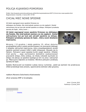 POLICJA KUJAWSKO-POMORSKA Źródło: http://kujawsko-pomorska.policja.gov.pl/kb/informacje/wiadomosci/28771,Chcial-miec-nowe-spodnie.html Wygenerowano: Czwartek, 2 marca 2017, 07:59 CHCIAŁ MIEĆ NOWE SPODNIE 20 latek zapragnął nowe spodnie firmowe na zbliżające się Święta. Nie miał jednak zamiaru za nie zapłacić. Został zatrzymany tuż po tym jak ukradł spodnie ze sklepu. Policjanci przekażą sprawę do Sądu , który oceni ... 20 latek zapragnął nowe spodnie firmowe na zbliżające się Święta. Nie miał jednak zamiaru za nie zapłacić. Został zatrzymany tuż po tym jak ukradł spodnie ze sklepu. Policjanci przekażą sprawę do Sądu , który oceni działanie mężczyzny. Wczoraj / 13 grudnia / około godziny 15, oficer dyżurny grudziądzkiej policji został poinformowany że pracownik jednego z sklepów zatrzymał mężczyznę, który prawdopodobnie ukradł spodnie wartości prawie 140zł z półki sklepowej. Okazało się to faktem. Policjanci spod zapiętej kurtki wyjęli spodnie. 20latek miał pecha … jego zachowanie dokładnie zaobserwował pracownik sklepu, który widząc, że młody człowiek wychodzi ze sklepu nie płacąc za spodnie wybiegł za nim na ulicę i zatrzymał go. Mężczyzna odpowie za kradzież. Wkrótce policjanci przekażą sprawę do Sądu . Kodeks Wykroczeń za kradzież cudzej rzeczy ruchomej , jeżeli jej wartość nie przekracza 250zł przewiduje karę aresztu, ograniczenia wolności albo grzywny. nadkom.Marzena Solochewicz-Kostrzewska oficer prasowy KMP w Grudziądzu Autor: P_Duziak_2010 Publikacja: P_Duziak_2010 Ocena: 0/5 (0) Tweetnij