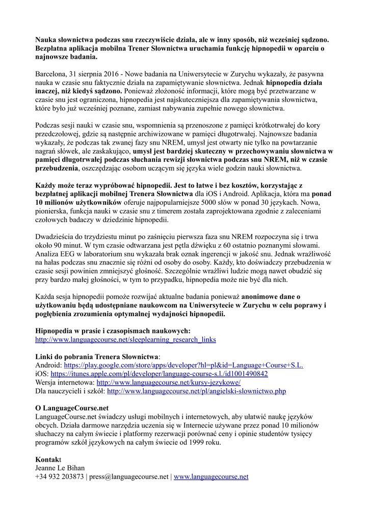 Nauka słownictwa podczas snu rzeczywiście działa, ale w inny sposób, niż wcześniej sądzono. Bezpłatna aplikacja mobilna Trener Słownictwa uruchamia funkcję hipnopedii w oparciu o najnowsze badania. Barcelona, 31 sierpnia 2016 - Nowe badania na Uniwersytecie w Zurychu wykazały, że pasywna nauka w czasie snu faktycznie działa na zapamiętywanie słownictwa. Jednak hipnopedia działa inaczej, niż kiedyś sądzono. Ponieważ złożoność informacji, które mogą być przetwarzane w czasie snu jest ograniczona, hipnopedia jest najskuteczniejsza dla zapamiętywania słownictwa, które było już wcześniej poznane, zamiast nabywania zupełnie nowego słownictwa. Podczas sesji nauki w czasie snu, wspomnienia są przenoszone z pamięci krótkotrwałej do kory przedczołowej, gdzie są następnie archiwizowane w pamięci długotrwałej. Najnowsze badania wykazały, że podczas tak zwanej fazy snu NREM, umysł jest otwarty nie tylko na powtarzanie nagrań słówek, ale zaskakująco, umysł jest bardziej skuteczny w przechowywaniu słownictwa w pamięci długotrwałej podczas słuchania rewizji słownictwa podczas snu NREM, niż w czasie przebudzenia, oszczędzając osobom uczącym się języka wiele godzin nauki słownictwa. Każdy może teraz wypróbować hipnopedii. Jest to łatwe i bez kosztów, korzystając z bezpłatnej aplikacji mobilnej Trenera Słownictwa dla iOS i Android. Aplikacja, która ma ponad 10 milionów użytkowników oferuje najpopularniejsze 5000 słów w ponad 30 językach. Nowa, pionierska, funkcja nauki w czasie snu z timerem została zaprojektowana zgodnie z zaleceniami czołowych badaczy w dziedzinie hipnopedii. Dwadzieścia do trzydziestu minut po zaśnięciu pierwsza faza snu NREM rozpoczyna się i trwa około 90 minut. W tym czasie odtwarzana jest pętla dźwięku z 60 ostatnio poznanymi słowami. Analiza EEG w laboratorium snu wykazała brak oznak ingerencji w jakość snu. Jednak wrażliwość na hałas podczas snu znacznie się różni od osoby do osoby. Każdy, kto doświadczy przebudzenia w czasie sesji powinien zmniejszyć głośność. Szczególnie wrażliwi ludzie mogą nawet obudzić się przy bardzo małej głośności, w tym to przypadku, hipnopedia może nie być dla nich. Każda sesja hipnopedii pomoże rozwijać aktualne badania ponieważ anonimowe dane o użytkowaniu będą udostępniane naukowcom na Uniwersytecie w Zurychu w celu poprawy i pogłębienia zrozumienia optymalnej wydajności hipnopedii. Hipnopedia w prasie i czasopismach naukowych: http://www.languagecourse.net/sleeplearning_research_links Linki do pobrania Trenera Słownictwa: Android: https://play.google.com/store/apps/developer?hl=pl&id=Language+Course+S.L. iOS: https://itunes.apple.com/pl/developer/language-course-s.l./id1001490842 Wersja internetowa: http://www.languagecourse.net/kursy-jezykowe/ Dla nauczycieli i szkół: http://www.languagecourse.net/pl/angielski-slownictwo.php O LanguageCourse.net LanguageCourse.net świadczy usługi mobilnych i internetowych, aby ułatwić naukę języków obcych. Działa darmowe narzędzia uczenia się w Internecie używane przez ponad 10 milionów słuchaczy na całym świecie i platformy rezerwacji porównać ceny i opinie studentów tysięcy programów szkół językowych na całym świecie od 1999 roku. Kontakt Jeanne Le Bihan +34 932 203873 | [email protected] | www.languagecourse.net www.languagecourse.net/press/ LanguageCourse S.L. Carrer Casp, 17. 8th floor 08010 Barcelona, Hiszpania
