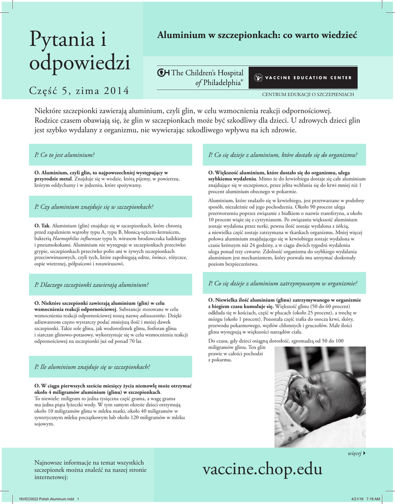 Pytania i odpowiedzi Aluminium w szczepionkach: co warto wiedzieć Część 5, z im a 2 0 1 4 VA C C I N E E D U C AT I O N C E N T E R CENTRUM EDUKACJI O SZCZEPIENIACH Niektóre szczepionki zawierają aluminium, czyli glin, w celu wzmocnienia reakcji odpornościowej. Rodzice czasem obawiają się, że glin w szczepionkach może być szkodliwy dla dzieci. U zdrowych dzieci glin jest szybko wydalany z organizmu, nie wywierając szkodliwego wpływu na ich zdrowie. P. Co to jest aluminium? P. Co się dzieje z aluminium, które dostało się do organizmu? O. Aluminium, czyli glin, to najpowszechniej występujący w przyrodzie metal. Znajduje się w wodzie, którą pijemy, w powietrzu, którym oddychamy i w jedzeniu, które spożywamy. O. Większość aluminium, które dostało się do organizmu, ulega szybkiemu wydaleniu. Mimo że do krwiobiegu dostaje się całe aluminium znajdujące się w szczepionce, przez jelita wchłania się do krwi mniej niż 1 procent aluminium obecnego w pokarmie. O. Tak. Aluminium (glin) znajduje się w szczepionkach, które chronią przed zapaleniem wątroby typu A, typu B, błonicą-tężcem-krztuścem, bakterią Haemophilus influenzae typu b, wirusem brodawczaka ludzkiego i pneumokokami. Aluminium nie występuje w szczepionkach przeciwko grypie, szczepionkach przeciwko polio ani w żywych szczepionkach przeciwwirusowych, czyli tych, które zapobiegają odrze, śwince, różyczce, ospie wietrznej, półpaścowi i rotawirusowi. Aluminium, które znalazło się w krwiobiegu, jest przetwarzane w podobny sposób, niezależnie od jego pochodzenia. Około 90 procent ulega przetworzeniu poprzez związanie z białkiem o nazwie transferyna, a około 10 procent wiąże się z cytrynianem. Po związaniu większość aluminium zostaje wydalona przez nerki, pewna ilość zostaje wydalona z żółcią, a niewielka część zostaje zatrzymana w tkankach organizmu. Mniej więcej połowa aluminium znajdującego się w krwiobiegu zostaje wydalona w czasie krótszym niż 24 godziny, a w ciągu dwóch tygodni wydaleniu ulega ponad trzy czwarte. Zdolność organizmu do szybkiego wydalania aluminium jest mechanizmem, który pozwala mu utrzymać doskonały poziom bezpieczeństwa. P. Dlaczego szczepionki zawierają aluminium? P. Co się dzieje z aluminium zatrzymywanym w organizmie? P. Czy aluminium znajduje się w szczepionkach? O. Niektóre szczepionki zawierają aluminium (glin) w celu wzmocnienia reakcji odpornościowej. Substancje stosowane w celu wzmocnienia reakcji odpornościowej noszą nazwę adiuwantów. Dzięki adiuwantom często wystarczy podać mniejszą ilość i mniej dawek szczepionki. Takie sole glinu, jak wodorotlenek glinu, fosforan glinu i siarczan glinowo-potasowy, wykorzystuje się w celu wzmocnienia reakcji odpornościowej na szczepionki już od ponad 70 lat. P. Ile aluminium znajduje się w szczepionkach? O. Niewielka ilość aluminium (glinu) zatrzymywanego w organizmie z biegiem czasu kumuluje się. Większość glinu (50 do 60 procent) odkłada się w kościach, część w płucach (około 25 procent), a trochę w mózgu (około 1 procent). Pozostała część trafia do osocza krwi, skóry, przewodu pokarmowego, węzłów chłonnych i gruczołów. Małe ilości glinu występują w większości narządów ciała. Do czasu, gdy dzieci osiągną dorosłość, zgromadzą od 50 do 100 miligramów glinu. Ten glin prawie w całości pochodzi z pokarmu. O. W ciągu pierwszych sześciu miesięcy życia niemowlę może otrzymać około 4 miligramów aluminium (glinu) w szczepionkach. To niewiele: miligram to jedna tysięczna część grama, a wagę grama ma jedna piąta łyżeczki wody. W tym samym okresie dzieci otrzymują około 10 miligramów glinu w mleku matki, około 40 miligramów w syntetycznym mleku początkowym lub około 120 miligramów w mleku sojowym. więcej4 Najnowsze informacje na temat wszystkich szczepionek można znaleźć na naszej stronie internetowej: 16VEC0022 Polish Aluminum.indd 1 vaccine.chop.edu 4/21/16 7:18 AM Aluminium (glin) w szczepionkach: co warto wiedzieć P. Czy ilość aluminium w szczepionkach jest bezpieczna? O. Tak. Odpowiadając na to pytanie, warto przyjrzeć się, komu szkodzi glin. Osoby te można podzielić na dwie grupy: Są to wcześniaki, które otrzymują dużo glinu w płynach podawanych dożylnie, oraz osoby z długotrwałymi zaburzeniami czynności nerek, które otrzymują dużo glinu, głównie w lekach zabojętniających kwasy. (Średnia zalecana dawka leków zobojętniających kwasy zawiera około 1000 razy więcej glinu, niż znajduje się w szczepionce.) W obu tych grupach pacjentów z powodu dużej ilości glinu odłożonego w organizmie mogą występować zaburzenia czynności mózgu, wady kości lub anemia. Aby glin miał szkodliwy wpływ na zdrowie, muszą być spełnione dwa kryteria: Taka osoba musi mieć nieprawidłowo działające lub całkowicie uszkodzone nerki oraz musi przez wiele miesięcy lub lat otrzymywać dużą dawkę glinu. Są to sytuacje, kiedy do organizmu trafia duża ilość glinu, ale niewystarczająca ilość go opuszcza. P. Czy aluminium zawarte w szczepionkach może zaszkodzić zdrowym dzieciom? O. Nie. Ilość aluminium (glinu) w szczepionkach w porównaniu z ilością, która może być szkodliwa, jest bardzo mała. Można na to spojrzeć w taki sposób: wszystkie niemowlęta są karmione piersią lub smoczkiem. Ponieważ zarówno mleko matki, jak i syntetyczne mleko początkowe zawierają glin, w układzie krwionośnym wszystkich dzieci przez cały czas znajduje się odrobina glinu. Jest to bardzo mała ilość: około 5 nanogramów (miliardowych części grama) na mililitr krwi (mniej więcej jedna piąta łyżeczki). W rzeczywistości ilość glinu w szczepionkach jest tak znikoma, że nawet po wstrzyknięciu szczepionki zmiana poziomu glinu we krwi niemowlęcia jest niewykrywalna. Inaczej jest u osób mających problemy zdrowotne spowodowane obecnością glinu, u których poziom t