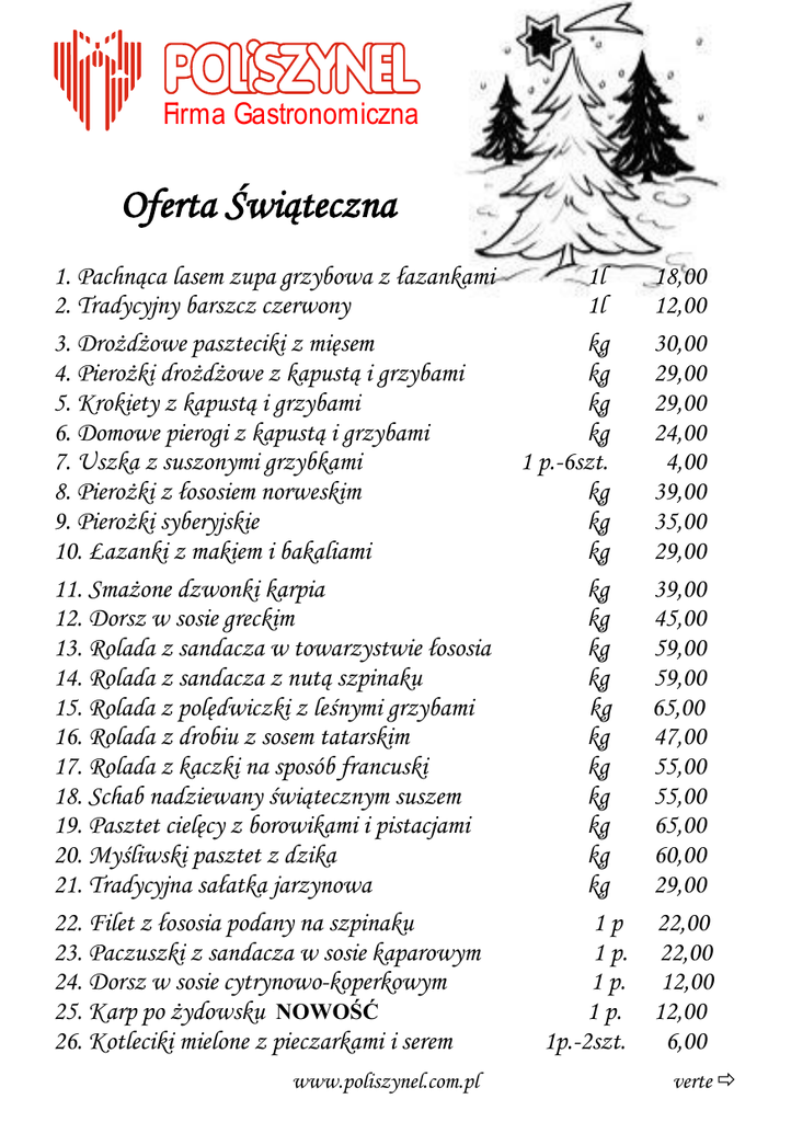 Firma Gastronomiczna Oferta Świąteczna 1. Pachnąca lasem zupa grzybowa z łazankami 1l 2. Tradycyjny barszcz czerwony 1l 3. Drożdżowe paszteciki z mięsem kg 4. Pierożki drożdżowe z kapustą i grzybami kg 5. Krokiety z kapustą i grzybami kg 6. Domowe pierogi z kapustą i grzybami kg 7. Uszka z suszonymi grzybkami 1 p.-6szt. 8. Pierożki z łososiem norweskim kg 9. Pierożki syberyjskie kg 10. Łazanki z makiem i bakaliami kg 11. Smażone dzwonki karpia kg 12. Dorsz w sosie greckim kg 13. Rolada z sandacza w towarzystwie łososia kg 14. Rolada z sandacza z nutą szpinaku kg 15. Rolada z polędwiczki z leśnymi grzybami kg 16. Rolada z drobiu z sosem tatarskim kg 17. Rolada z kaczki na sposób francuski kg 18. Schab nadziewany świątecznym suszem kg 19. Pasztet cielęcy z borowikami i pistacjami kg 20. Myśliwski pasztet z dzika kg 21. Tradycyjna sałatka jarzynowa kg 22. Filet z łososia podany na szpinaku 1p 23. Paczuszki z sandacza w sosie kaparowym 1 p. 24. Dorsz w sosie cytrynowo-koperkowym 1 p. 25. Karp po żydowsku NOWOŚĆ 1 p. 26. Kotleciki mielone z pieczarkami i serem 1p.-2szt. www.poliszynel.com.pl 18,00 12,00 30,00 29,00 29,00 24,00 4,00 39,00 35,00 29,00 39,00 45,00 59,00 59,00 65,00 47,00 55,00 55,00 65,00 60,00 29,00 22,00 22,00 12,00 12,00 6,00 verte 27. Ruloniki z podudzia kurczęcia z nadzieniem 1 p.-2 szt. 12,00 pieczarkowo-serowym w delikatnym sosie śmietanowym 28. Pierś kaczki berberyjskiej w owocowym suszu i winie 1p. 22,00 29. Kaczka pieczona w całości NOWOŚĆ 1 szt.- ok. 1,8kg 100,00 30. Wołowina gajowego w sosie z leśnych grzybów 1 p.- 2 szt. 22,00 31. Medaliony z polędwiczki w sosie żurawinowym 1 p.-2 szt 16,00 32. Bigos świąteczny z dodatkiem grzybów i śliwek kg 26,00 33. Żeberka w musztardzie i miodzie 1 p. 12,00 34. Karkówka pieczona w całości ze śliwką NOWOŚĆ kg 55,00 Dania porcjowane na półmiskach lub w opakowaniach jednorazowych 35. Tradycyjny śledź „Hektor” 60/60g 3,80 36. Śledź w domowej śmietanie 60/60g 4,20 37. Złocisty sandacz w galaretce 50/50g 10,00 38.Świąteczny karp w galarecie 100/100g 7,90 39. Pstrąg w delikatnej galaretce 50/50g 7,50 40. Łosoś norweski w galaretce z białego wina 100/100g 13,00 41. Tatar z łososia norweskiego 100g 12,00 42. Placuszek z łososiem norweskim 50g 7,00 43. Tatar ze śledzia 100 g 5,00 44. Ruloniki z łososia z musem zimowym 50g 7,00 45. Krewetka tygrysia podana na limonce 2 szt 9,00 Świąteczne słodkości 46. Puszysty sernik z bakaliami 1kg 35,00 47.Czekoladowy torcik Royal NOWOŚĆ 1 szt.- ok. 0,7kg 45,00 48. Drożdżowa strucla makowa 1 szt. - ok. 1kg. 35,00 49. Makowiec elbląski na kruchym spodzie 1 kg 35,00 Zamówienia przyjmujemy w biurze przy ul. Wspólnej 11-13, telefonicznie 55 235 11 29, 55 230 40 30, jak również we wszystkich placówkach firmy, e-mail: [email protected] Zamówienia powyżej 100 PLN – dowóz GRATIS Zdrowych i smacznych Świąt Bożego Narodzenia życzy Firma Gastronomiczna
