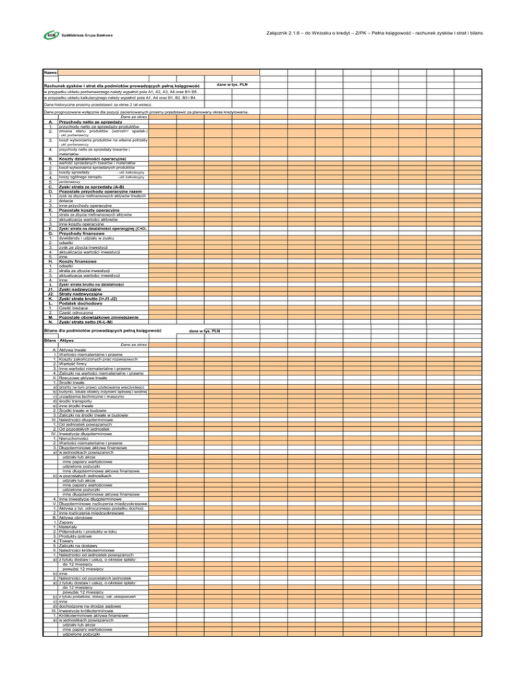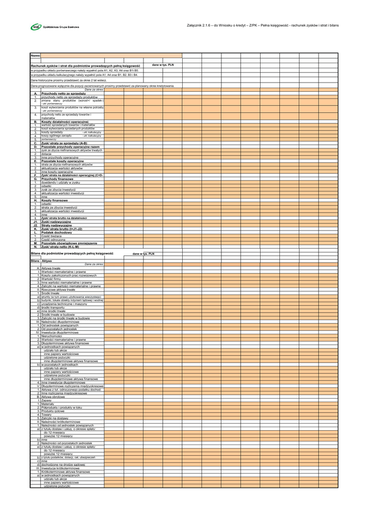Załącznik 2.1.6 – do Wniosku o kredyt – Z/PK – Pełna księgowość - rachunek zysków i strat i bilans Nazwa: Rachunek zysków i strat dla podmiotów prowadzących pełną księgowość dane w tys. PLN w przypadku układu porównawczego należy wypełnić pola A1, A2, A3, A4 oraz B1i B5. w przypadku układu kalkulacyjnego należy wypełnić pola A1, A4 oraz B1, B2, B3 i B4. Dane historyczne prosimy przedstawić za okres 2 lat wstecz. Dane prognozowane wyłącznie dla pozycji zacieniowanych prosimy przedstawić za planowany okres kredytowania. Dane za okres A. 1. 2. Przychody netto ze sprzedaży przychody netto ze sprzedaży produktów zmiana stanu produktów (wzrost+/ spadek-) - ukł. porównawczy koszt wytworzenia produktów na własne potrzeby 3. - ukł. porównawczy przychody netto ze sprzedaży towarów i materiałów 4. B. 1. 2. 3. 4. 5. C. D. 1. 2. 3. E. 1. 2. 3. F. G. 1. 2. 3. 4. 5. H. 1. 2. 3. 4. I. J1. J2. K. L. 1. 2. M. N. Koszty działalności operacyjnej wartość sprzedanych towarów i materiałów koszt wytworzenia sprzedanych produktów koszty sprzedaży - ukł. kalkulacyjny koszy ogólnego zarządu - ukł. kalkulacyjny koszty wg rodzaju ukł. porównawczy Zysk/ strata ze sprzedaży (A-B) Pozostałe przychody operacyjne razem zysk ze zbycia niefinansowych aktywów trwałych dotacje inne przychody operacyjne Pozostałe koszty operacyjne strata ze zbycia niefinansowych aktywów trwałych aktualizacja wartości aktywów inne koszty operacyjne Zysk/ strata na działalności operacyjnej (C+D- Przychody finansowe dywidendy i udziały w zysku odsetki zysk ze zbycia inwestycji aktualizacja wartości inwestycji inne Koszty finansowe odsetki strata ze zbycia inwestycji aktualizacja wartości inwestycji inne Zysk/ strata brutto na działalności Zyski nadzwyczajne Straty nadzwyczajne Zysk/ strata brutto (I+J1-J2) Podatek dochodowy Część bieżąca Część odroczona Pozostałe obowiązkowe zmniejszenie Zysk/ strata netto (K-L-M) Bilans dla podmiotów prowadzących pełną księgowość Bilans - Aktywa Dane za okres A. I. 1. 2. 3. 4. II. 1. a) b) c) d) e) 2. 3. III. 1. 2. IV. 1. 2. 3. a) b) 4. V. 1. 2. B. I. 1. 2. 3. 4. 5. II. 1. a) b) 2. a) b) c) d) III. 1. a) Aktywa trwałe Wartości niematerialne i prawne Koszty zakończonych prac rozwojowych Wartość firmy Inne wartości niematerialne i prawne Zaliczki na wartości niematerialne i prawne Rzeczowe aktywa trwałe Środki trwałe grunty (w tym prawo użytkowania wieczystego) budynki, lokale obiekty inżynierii lądowej i wodnej urządzenia techniczne i maszyny środki transportu inne środki trwałe Środki trwałe w budowie Zaliczki na środki trwałe w budowie Należności długoterminowe Od jednostek powiązanych Od pozostałych jednostek Inwestycje długoterminowe Nieruchomości Wartości niematerialne i prawne Długoterminowe aktywa finansowe w jednostkach powiązanych udziały lub akcje inne papiery wartościowe udzielone pożyczki inne długoterminowe aktywa finansowe w pozostałych jednostkach udziały lub akcje inne papiery wartościowe udzielone pożyczki inne długoterminowe aktywa finansowe Inne inwestycje długoterminowe Długoterminowe rozliczenia międzyokresowe Aktywa z tyt. odroczonego podatku dochod. Inne rozliczenia międzyokresowe Aktywa obrotowe Zapasy Materiały Półprodukty i produkty w toku Produkty gotowe Towary Zaliczki na dostawy Należności krótkoterminowe Należności od jednostek powiązanych z tytułu dostaw i usług, o okresie spłaty: do 12 miesięcy powyżej 12 miesięcy inne Należności od pozostałych jednostek z tytułu dostaw i usług, o okresie spłaty: do 12 miesięcy powyżej 12 miesięcy z tytułu podatków, dotacji, ceł, ubezpieczeń społecznych i zdrowotnych oraz innych inne dochodzone na drodze sądowej Inwestycje krótkoterminowe Krótkoterminowe aktywa finansowe w jednostkach powiązanych udziały lub akcje inne papiery wartościowe udzielone pożyczki dane w tys. PLN inne krótkoterminowe aktywa finansowe b) w pozostałych jednostkach udziały lub akcje inne papiery wartościowe udzielone pożyczki inne krótkoterminowe aktywa finansowe c) środki pieniężne i inne aktywa pieniężne środki pieniężne w kasie i na rachunkach inne środki pieniężne inne aktywa pieniężne 2. Inne inwestycje krótkoterminowe IV. Krótkoterminowe rozliczenia międzyokresowe SUMA AKTYWÓW Bilans - pasywa A. I. II. III. IV. V. VI. VII. VIII. IX. B. I. 1. 2. Dane za okres Kapitał (fundusz) własny Kapitał (fundusz) podstawowy Należne wpłaty na kapitał podstawowy Udziały (akcje) własne (wielkość ujema) Kapitał (fundusz) zapasowy Kapitał (fundusz) z aktualizacji wyceny Pozostałe kapitały (fundusze) rezerwowe Zysk (strata) z lat ubiegłych Zysk (strata) netto Odpisy z zysku netto w ciągu roku obrotowego (wielkość ujemna) Zobowiązania i rezerwy na zobowiązania Rezerwy na zobowiązania Rezerwa z tyt. odroczonego podatku Rezerwa na świadczenia emerytalne i podobne długoterminowa krótkoterminowa 3. Pozostałe rezerwy długoterminowe krótkoterminowe II. Zobowiązania długoterminowe 1. Wobec jednostek powiązanych 2. Wobec pozostałych jednostek a) kredyty i pożyczki b) z tytułu emisji dłużnych papierów c) inne zobowiązania finansowe d) inne III. Zobowiązania krótkoterminowe 1. Wobec jednostek powiązanych a) z tytułu dostaw i usług, o okresie do 12 miesięcy powyżej 12 miesięcy b) inne 2. Wobec pozostałych jednostek a) kredyty i pożyczki b) z tyt. emisji dłużnych papierów wartościowych c) inne zobowiązania finansowe d) z tyt. dostaw i usług, o okresie wymagalności: do 12 miesięcy powyżej 12 miesięcy e) zaliczki na otrzymane dostawy f) zobowiązania wekslowe g) z tytułu podatków, ceł, ubezpieczeń i innych h) z tytułu wynagrodzeń i) inne 3. Fundusze specjalne IV. Rozliczenia międzyokresowe 1. Ujemna wartość firmy 2. Inne rozliczenia międzyokresowe długoterminowe krótkoterminowe SUMA PASYWÓW suma kontrolna Informacje uzupełniające Dane 