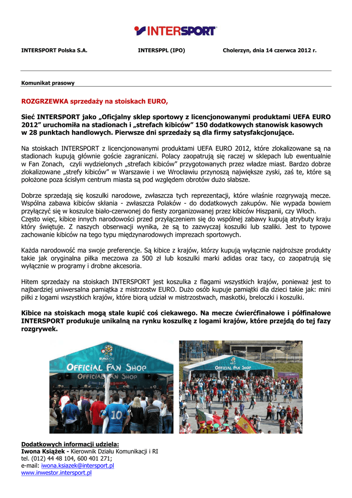 INTERSPORT Polska S.A. INTERSPPL (IPO) Cholerzyn, dnia 14 czerwca 2012 r. Komunikat prasowy ROZGRZEWKA sprzedaży na stoiskach EURO, Sieć INTERSPORT jako „Oficjalny sklep sportowy z licencjonowanymi produktami UEFA EURO 2012” uruchomiła na stadionach i „strefach kibiców” 150 dodatkowych stanowisk kasowych w 28 punktach handlowych. Pierwsze dni sprzedaży są dla firmy satysfakcjonujące. Na stoiskach INTERSPORT z licencjonowanymi produktami UEFA EURO 2012, które zlokalizowane są na stadionach kupują głównie goście zagraniczni. Polacy zaopatrują się raczej w sklepach lub ewentualnie w Fan Zonach, czyli wydzielonych „strefach kibiców” przygotowanych przez władze miast. Bardzo dobrze zlokalizowane „strefy kibiców” w Warszawie i we Wrocławiu przynoszą największe zyski, zaś te, które są położone poza ścisłym centrum miasta są pod względem obrotów dużo słabsze. Dobrze sprzedają się koszulki narodowe, zwłaszcza tych reprezentacji, które właśnie rozgrywają mecze. Wspólna zabawa kibiców skłania - zwłaszcza Polaków - do dodatkowych zakupów. Nie wypada bowiem przyłączyć się w koszulce biało-czerwonej do fiesty zorganizowanej przez kibiców Hiszpanii, czy Włoch. Często więc, kibice innych narodowości przed przyłączeniem się do wspólnej zabawy kupują atrybuty kraju który świętuje. Z naszych obserwacji wynika, że są to zazwyczaj koszulki lub szaliki. Jest to typowe zachowanie kibiców na tego typu międzynarodowych imprezach sportowych. Każda narodowość ma swoje preferencje. Są kibice z krajów, którzy kupują wyłącznie najdroższe produkty takie jak oryginalna piłka meczowa za 500 zł lub koszulki marki adidas oraz tacy, co zaopatrują się wyłącznie w programy i drobne akcesoria. Hitem sprzedaży na stoiskach INTERSPORT jest koszulka z flagami wszystkich krajów, ponieważ jest to najbardziej uniwersalna pamiątka z mistrzostw EURO. Dużo osób kupuje pamiątki dla dzieci takie jak: mini piłki z logami wszystkich krajów, które biorą udział w mistrzostwach, maskotki, breloczki i koszulki. Kibice na stoiskach mogą stale kupić coś ciekawego. Na mecze ćwierćfinałowe i półfinałowe INTERSPORT produkuje unikalną na rynku koszulkę z logami krajów, które przejdą do tej fazy rozgrywek. Dodatkowych informacji udziela: Iwona Książek - Kierownik Działu Komunikacji i RI tel. (012) 44 48 104, 600 401 271; e-mail: [email protected] www.inwestor.intersport.pl
