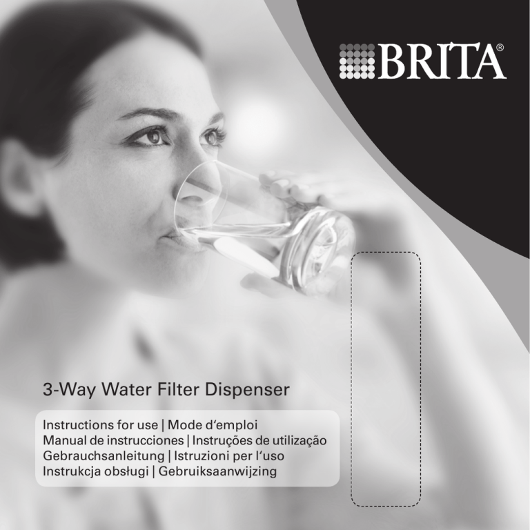 3-Way Water Filter Dispenser Instructions for use | Mode d‘emploi Manual de instrucciones | Instruções de utilização Gebrauchsanleitung | Istruzioni per l‘uso Instrukcja obsługi | Gebruiksaanwijzing Index I. Congratulations II. Quality from the very start III.Important notes IV.BRITA, quality and satisfaction guaranteed Page Page Page Page 3 4 12 13 FRANÇAIS I. Nous vous félicitons II. La qualité dès l’installation III.Important IV.BRITA, qualité et satisfaction garanties Page Page Page Page 15 16 24 25 ESPAÑOL I. Felicidades II. Calidad desde el principio III.Notas importantes IV.BRITA calidad y satisfacción garantizadas Página Página Página Página 27 28 36 37 PORTUGUÊS I. Parabéns II. Qualidade a partir do primeiro momento III.Notas Importantes IV.BRITA, qualidade e satisfação garantidas Página Página Página Página 39 40 48 49 DEUTSCH I. Herzlichen Glückwunsch II. Für Qualität von Anfang an III.Wichtige Hinweise IV.Der BRITA Service Seite Seite Seite Seite 51 52 60 61 ITALIANO I. Congratulazioni II. Istruzioni d’uso III.Note importanti IV.BRITA al vostro servizio per una completa soddisfazione Pagina 63 Pagina 64 Pagina 72 Pagina 73 I. Gratulujemy II. Jakość od samego początku III.Ważne informacje IV.Pełna satysfakcja dzięki produktom BRITA Strona Strona Strona Strona 75 76 84 85 I. Gefeliciteerd II. Kwaliteit vanaf het allereerste begin III.Belangrijke opmerkingen IV.BRITA’s service Pagina Pagina Pagina Pagina 87 88 96 97 ENGLISH POLSKI NEDERLANDS 2 I. Congratulations on your new BRITA® 3-Way Water Filter Dispenser System Thank you for choosing BRITA quality for cleaner, clearer great tasting BRITA filtered water straight from your BRITA 3-Way Water Filter Dispenser. Next to hot and cold unfiltered water, your BRITA system offers many advantages BRITA water • improves the taste of hot and cold drinks • is economical and convenient • prolongs domestic appliance life by preventing limescale build-up • is ideal for cooking healthy food • gives full flavour and better tasting tea and coffee The BRITA 3-Way Water Filter Dispenser has two levers. One for your standard hot and cold unfiltered water and a BRITA branded lever for the BRITA filtered water. BRITA water dispenser BRITA cartridge exchange indicator The P 1000 filter cartridge is the key to cleaner, clearer great tasting BRITA filtered water from the BRITA 3-Way Water Filter Dispenser! The P 1000 has a constant filtration performance for limescale reduction thanks to its multilevel BRITA filtration system. The professional filter head allows two filtration settings for hard and very hard water. The P 1000 filter cartridge • r educes limescale and substances, e.g. chlorine, that affect taste and odour. • reduces lead or copper in tap water that can result from certain types of household installation. Lifetime of the P 1000 filter cartridge The lifetime of the P 1000 cartridge is dependant on your individual volume usage and your water conditions. For optimum BRITA filtration performance in the UK, we recommend a minimum exchange of your cartridge every 6 months. Exchange will be prompted by your BRITA electronic cartridge exchange indicator. For more information regarding the BRITA electronic cartridge exchange indicator, see chapter 3.2. P 1000 filter cartridge ENGLISH 3 II. Quality from the very start 1 Terms of warranty 1. 2. The BRITA 3-Way Water Filter Dispenser system is subject to the statutory guarantee of 2 years. A guarantee claim may be asserted only if all instructions in this handbook are followed and observed. 2 Contents of the BRITA 3-Way Water Filter Dispenser Starter Kit 3. 4. To ensure you get the best result from your BRITA 3-Way Water Filter Dispenser Starter Kit, please follow these instructions carefully. Your BRITA 3-Way Water Filter Dispenser Starter Kit includes the following (see fig. 1): 1. P 1000 filter head with two settings including a convenient locking handle 2. Flexible wall mount 3. P 1000 water filter cartridge 4. BRITA 3-Way Water Filter Dispenser (design may differ from image shown) 5. BRITA electronic cartridge exchange indicator 6. Hose (1) length = 800 mm, 3/8" nut on one side and M8 connector on the other side, 2 Hoses (2+3), length = 450 mm, 3/8” nut on one side and M8 connectors on the other side 7. Hose (4), length = 800 mm and 3/8" nut on both sides 8. 2 Adapters 1/2" female thread to 3/8" male thread (Only in UK) 9. Usage Instructions 10.Carbonate hardness testing strip 11.T-piece 12.Gaskets Recommended tools for installation: a pipe wrench, an Allen key (4 mm), a wrench and a screwdriver. For wall mounting (optional), you need: two screws (e.g. 5 mm thread diameter) and, if required, two wall plugs suitable for your type of wall. 5. 6. 7. 8. 9. 10. 11. (fig. 1) 4English 12. 3 BRITA 3-Way Water Filter Dispenser – easy installation Before starting, please check that you have all the components listed above (see fig. 1) as well as the recommended tools. There are 7 steps to the installation. ! Prior to installation, read the Technical Data (chapter 7) and the Important Information (chapter 9). The system cannot be installed with a low pressure boiler as this might lead to water damages. After storage and transport below 0°C, the product must be stored in the open original packaging for at least 24 hours at the stated ambient temperatures (chapter 7) for operation. 3.1 Step 1: Selecting the carbonate hardness setting (++/+) on the filter head The filter head has been set to meet most European water con ditions. In some soft water areas though, you may wish to adjust the filter head to your local settings. To do so, first carry out a carbonate test using the supplied testing strip. The strip can be found in the outer wrapping of these Usage Instructions. Using the testing strip: • Let the red response field of the probe soak in a glass of your tap water for 1 second (fig. 2). • After 1 minute, compare the colour of the respon