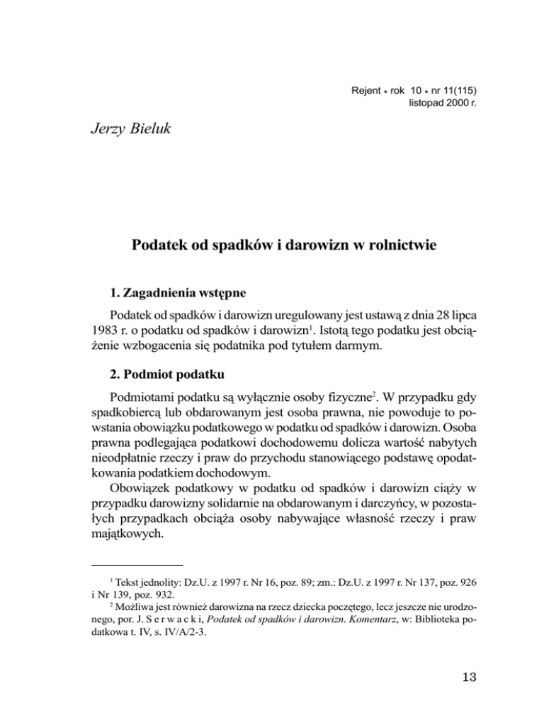 Podatek od spadków i darowizn w rolnictwie Rejent * rok 10 * nr 11(115) listopad 2000 r. Jerzy Bieluk Podatek od spadków i darowizn w rolnictwie 1. Zagadnienia wstêpne Podatek od spadków i darowizn uregulowany jest ustaw¹ z dnia 28 lipca 1983 r. o podatku od spadków i darowizn1. Istot¹ tego podatku jest obci¹¿enie wzbogacenia siê podatnika pod tytu³em darmym. 2. Podmiot podatku Podmiotami podatku s¹ wy³¹cznie osoby fizyczne2. W przypadku gdy spadkobierc¹ lub obdarowanym jest osoba prawna, nie powoduje to powstania obowi¹zku podatkowego w podatku od spadków i darowizn. Osoba prawna podlegaj¹ca podatkowi dochodowemu dolicza wartoœæ nabytych nieodp³atnie rzeczy i praw do przychodu stanowi¹cego podstawê opodatkowania podatkiem dochodowym. Obowi¹zek podatkowy w podatku od spadków i darowizn ci¹¿y w przypadku darowizny solidarnie na obdarowanym i darczyñcy, w pozosta³ych przypadkach obci¹¿a osoby nabywaj¹ce w³asnoœæ rzeczy i praw maj¹tkowych. 1 Tekst jednolity: Dz.U. z 1997 r. Nr 16, poz. 89; zm.: Dz.U. z 1997 r. Nr 137, poz. 926 i Nr 139, poz. 932. 2 Mo¿liwa jest równie¿ darowizna na rzecz dziecka poczêtego, lecz jeszcze nie urodzonego, por. J. S e r w a c k i, Podatek od spadków i darowizn. Komentarz, w: Biblioteka podatkowa t. IV, s. IV/A/2-3. 13 Jerzy Bieluk 3. Przedmiot opodatkowania Podatek od spadków i darowizn3 jest typowym podatkiem maj¹tkowym. Wymierzany jest od przyrostu maj¹tku podatnika, który nast¹pi³ pod tytu³em darmym4. Dotyczy czterech sytuacji, w których nastêpuje nabycie w³asnoœci – spadkobrania, darowizny, zasiedzenia oraz nabycia praw do wk³adu oszczêdnoœciowego na podstawie dyspozycji wk³adcy na wypadek jego œmierci. Dotyczy wiêc zdarzeñ jednorazowych, w przypadku rolnictwa zwi¹zanych czêsto ze zmianami pokoleniowymi. 4. Podstawa opodatkowania i stawki podatku Podstawê opodatkowania stanowi wartoœæ nabytych rzeczy i praw maj¹tkowych po potr¹ceniu d³ugów i ciê¿arów (czysta wartoœæ), ustalona wed³ug stanu rzeczy i praw maj¹tkowych w dniu nabycia i cen rynkowych z dnia powstania obowi¹zku podatkowego5. Je¿eli przed dokonaniem wymiaru podatku nast¹pi ubytek rzeczy spowodowany si³¹ wy¿sz¹, do ustalenia wartoœci przyjmuje siê stan rzeczy w dniu dokonania wymiaru, a odszkodowanie za ubytek, nale¿ne z tytu³u ubezpieczenia, wlicza siê do podstawy wymiaru. 3 Ustawa z dnia 28 lipca 1983 r. o podatku od spadków i darowizn (tekst jednolity: Dz.U. z 1997 r. Nr 16, poz. 89; zm.: Dz.U. z 1997 r. Nr 137, poz. 926, Nr 139, poz. 932. 4 Por. C. K o s i k o w s k i, E. R u œ k o w s k i, Finanse i prawo finansowe, Warszawa 1994, s. 184; R. M a s t a l s k i, Prawo podatkowe II. Czêœæ szczegó³owa, Warszawa 1996, s. 263. 5 Ustawa o podatku od spadków i darowizn przewiduje szereg zasad szczegó³owych ustalania podstawy opodatkowania, i tak: 1. Je¿eli spadkobierca i zapisobierca lub obdarowany zosta³ obci¹¿ony obowi¹zkiem wykonania polecenia lub zapisu, wartoœæ obci¹¿enia z tego tytu³u stanowi ciê¿ar spadku (zapisu) lub darowizny, o ile polecenie zosta³o wykonane. 2. Do d³ugów i ciê¿arów zalicza siê równie¿ koszty ostatniej choroby spadkodawcy, je¿eli nie zosta³y pokryte za jego ¿ycia i z jego maj¹tku, koszty pogrzebu spadkodawcy, ³¹cznie z nagrobkiem, w takim zakresie, w jakim koszty te odpowiadaj¹ zwyczajom przyjêtym w danym œrodowisku, koszty postêpowania spadkowego, wynagrodzenie wykonawcy testamentu, obowi¹zki wykonania zapisów oraz poleceñ zamieszczonych w testamencie, wyp³aty z tytu³u zachowku oraz inne obowi¹zki wynikaj¹ce z przepisów kodeksu cywilnego dotycz¹cych spadków. 3. Przy nabyciu w drodze zasiedzenia wy³¹cza siê z podstawy opodatkowania wartoœæ nak³adów dokonanych na rzecz przez nabywcê podczas biegu zasiedzenia. 14 Podatek od spadków i darowizn w rolnictwie 5. Stawki podatku Obecna skala podatku od spadków i darowizn kszta³tuje siê nastêpuj¹co. Wysokoœæ podatku6: Kwota nadwy¿ki w z³ ponad do Podatek wynosi od nabywców zaliczonych do I grupy podatkowej 9.660 3% 9.660 – 19.320 19.320 289 z³ 30 gr i 5% od nadwy¿ki ponad 9.660 z³ 772 z³ 80 gr i 7% od nadwy¿ki ponad 19.320 z³ od nabywców zaliczonych do II grupy podatkowej 9.660 7% 9.660 – 16.020 676 z³ 20 gr i 9% od nadwy¿ki ponad 9.660 z³ 19.320 1.545 z³ 60 gr i 12% od nadwy¿ki ponad 19.320 z³ od nabywców zaliczonych do III grupy podatkowej 9.660 12% 9.660 – 19.320 19.320 1.159 z³ 20 gr i 16% od nadwy¿ki ponad 9.660 z³ 2.704 z³ 80 gr i 20% od nadwy¿ki ponad 19.320 z³ Kwoty wolne od podatku (art. 9 ustawy): 9.057 z³ – je¿eli nabywc¹ jest osoba zaliczona do I grupy podatkowej, 6.838 z³ – je¿eli nabywc¹ jest osoba zaliczona do II grupy podatkowej, 4.607 z³ – je¿eli nabywc¹ jest osoba zaliczona do III grupy podatkowej, 4. Je¿eli budynek stanowi¹cy czêœæ sk³adow¹ gruntu bêd¹cego przedmiotem nabycia zosta³ wzniesiony przez osobê nabywaj¹c¹ nieruchomoœæ przez zasiedzenie, z podstawy opodatkowania wy³¹cza siê wartoœæ tego budynku. 6 Zgodnie z rozporz¹dzeniem Ministra Finansów z dnia 7 kwietnia 1997 r. w sprawie wykonania niektórych przepisów ustawy o podatku od spadków i darowizn (Dz.U. Nr 34, poz. 209). 15 Jerzy Bieluk 6. Zwolnienia i ulgi W podatku od spadków i darowizn wystêpuje szereg zwolnieñ zmniejszaj¹cych jego dolegliwoœæ. Dotycz¹ one m.in. okreœlonych przedmiotów, okreœlonych osób w zale¿noœci od grupy podatkowej7, celu przeznaczenia œrodków. Wystêpuje te¿ szereg zwolnieñ zwi¹zanych z dzia³alnoœci¹ rolnicz¹. 7. Zwolnienie z opodatkowania gospodarstwa rolnego Zgodnie z ustaw¹ z dnia 28 lipca 1983 r. o podatku od spadków i darowizn – art. 4 ust. 1, zwalnia siê od podatku nabycie w³asnoœci i praw u¿ytkowania wieczystego gospodarstwa rolnego lub jego czêœci oraz innych praw do takiego gospodarstwa lub jego czêœci, jak równie¿ dzia³ki przyzagrodowej, z wyj¹tkiem: a) budynków mi