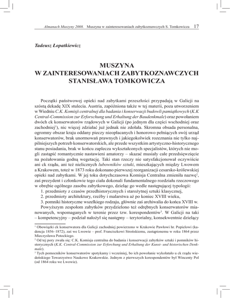 Almanach Muszyny 2008. Muszyna w zainteresowaniach zabytkoznawczych S. Tomkowicza 17 Tadeusz Łopatkiewicz MUSZYNA W ZAINTERESOWANIACH ZABYTKOZNAWCZYCH STANISŁAWA TOMKOWICZA Początki państwowej opieki nad zabytkami przeszłości przypadają w Galicji na szóstą dekadę XIX stulecia. Austria, zapóźniona także w tej materii, poza utworzeniem w Wiedniu C.K. Komisji centralnej dla badania i konserwacji budowli pamiątkowych (K.K Central-Commission zur Erforschung und Erhaltung der Baudenkmale) oraz powołaniem dwóch ck konserwatorów rządowych w Galicji (po jednym dla części wschodniej oraz zachodniej), nic więcej zdziałać już jednak nie zdołała. Skromna obsada personalna, ogromny obszar kraju oddany pieczy nieopłacanych i honorowo pełniących swój urząd konserwatorów, brak unormowań prawnych i jakiegokolwiek rozeznania nie tylko najpilniejszych potrzeb konserwatorskich, ale przede wszystkim artystyczno-historycznego stanu posiadania, brak w końcu zaplecza wykształconych specjalistów, których nie mogli zastąpić romantycznie nastawieni amatorzy – skazać musiały całe przedsięwzięcie na pożałowania godną wegetację. Taki stan rzeczy nie satysfakcjonował oczywiście ani ck rządu, ani też nielicznych lubowników sztuki, mieszkających między Lwowem a Krakowem, toteż w 1873 roku dokonano pierwszej reorganizacji cesarsko-królewskiej opieki nad zabytkami. W jej toku dotychczasowa Komisja Centralna zmieniła nazwę, zaś prezydent i członkowie tego ciała dokonali fundamentalnego rozdziału rzeczowego w obrębie ogólnego zasobu zabytkowego, dzieląc go wedle następującej typologii: 1. przedmioty z czasów przedhistorycznych i starożytnej sztuki klasycznej, 2. przedmioty architektury, rzeźby i malarstwa aż po koniec XVIII wieku, 3. pomniki historyczne wszelkiego rodzaju, głównie zaś archiwalia do końca XVIII w. Powyższym zespołom zabytków przydzielono też odrębnych konserwatorów mianowanych, wspomaganych w terenie przez tzw. korespondentów. W Galicji na taki – kompetencyjny – podział nałożył się następny – terytorialny, konsekwentnie dzielący Obowiązki ck konserwatora dla Galicji zachodniej powierzono w Krakowie Pawłowi hr. Popielowi (kadencja 1856–1872), zaś we Lwowie – prof. Franciszkowi Strońskiemu, zastąpionemu w roku 1864 przez Mieczysława Potockiego. Od tej pory zwała się: C.K. Komisja centralna do badania i konserwacji zabytków sztuki i pomników historycznych (K.K. Central-Commission zur Erforchung und Erhaltung der Kunst- und historischen Denkmale). Tych pomocników konserwatorów spotykamy i wcześniej, bo ich powołanie wykołatało u ck rządu wiedeńskiego Towarzystwo Naukowe Krakowskie. Jednym z pierwszych korespondentów był Wincenty Pol (od 1864 roku we Lwowie). 18 Tadeusz Łopatkiewicz kraj na część wschodnią (lwowską) i zachodnią (krakowską), co – przynajmniej teoretycznie – prowadziło do współwystępowania na tym terytorium aż sześciu konserwatorów, odpowiedzialnych za poszczególne rodzaje zabytków. W żaden sposób Wiedeń nie zaradził jednak wspomnianym wcześniej przyczynom niedomagań, toteż wzmocnienie kadrowe nie przełożyło się wcale na usprawnienie państwowej opieki nad pomnikami przeszłości, bo tkwiła ona ciągle w ramach szlachetnego amatorstwa, uprawianego przez ludzi powodowanych wzniosłymi zazwyczaj pobudkami. Kolejna reorganizacja wydawała się zatem sprawą przesądzoną i rzeczywiście sytuacja dojrzała do zmian około roku 1885, wraz z upływem pięcioletnich mandatów niemal wszystkich konserwatorów galicyjskich. Nadesłany z Wiednia scenariusz planowanych zmian nieoczekiwanie napotkał jednak w Krakowie kontrprojekt, sporządzony i przedyskutowany w środowisku członków Akademii Umiejętności, a ściśle jej Komisji do Badania Historii Sztuki. Znaczny wpływ na powstanie tego zbioru rzeczowych postulatów, a przy tym żarliwe propagowanie ich w prasie galicyjskiej, miał Stanisław Tomkowicz, dziś – niestety! – zapomniany pionier konserwatorstwa oraz inwentaryzacji zabytków na ziemiach polskich. Na świat przyszedł w 1850 roku w Krakowie, mieście, z którym związał całe swoje życie. Po ukończeniu Gimnazjum Św. Anny wstąpił na Uniwersytet Jagielloński (1869), gdzie oddał się studiom germanistycznym. Naukę uniwersytecką, rozwijaną później w Lipsku i Dreźnie, uwieńczył Tomkowicz rozprawą doktorską poświęconą Barbarze Radziwiłłównie (1874). Pierwsze publikacje młodego germanisty wskazują jasno, iż krąg jego ówczesnych zainteresowań wyznaczała historia literatury, muzyka, poezja, dziennikarstwo, a także edytorstwo, w którym najpoważniejszym dokonaniem Tomkowicza stały się, wydane z pism pośmiertnych, trzy tomy poezji Franciszka Wężyka, dziadka po kądzieli. Równocześnie jednak krystalizują w młodym filologu zupełnie nie amatorskie zainteresowania sztuką i jej przeszłością, czego wyrazem jest zarówno wstąpienie w poczet członków Komisji do Badania Historii Sztuki Akademii Umiejętności, jak i pierwsze publikacje zabytkoznawcze w krakowskim „Czasie”. Z właściwą sobie swadą, operując nienagannym językiem, podnosi w nich Tomkowicz kwestie słabo uświadamiane W istocie konserwatorów bywało w określonych latach jeszcze więcej, bowiem tzw. „zabytki ruskie”, szczególnie w Galicji wschodniej, miały swoich odrębnych opiekunów. Była to jedna z pierwszych komisji działających w ramach Akademii Umiejętności i, choć powstała w roku 1873, jej początków upatrywać należy w działalności grupy członków Krakowskiego Towarzystwa Naukowego, żywo zaangażowanych od połowy XIX wieku w badanie i społeczną opiekę nad zabytkami sztuki. Zob. S. Tomkowicz, Reforma konserwatorstwa zabytków sztuki w Galicyi, odbitka z „Przeglądu Powszechnego”, t. 9, Kraków 1886, s. 225–234, 411–445. Ze skromnego piśmiennictwa poświęconego biografii Tomkowicza zob.: J. Pagacz