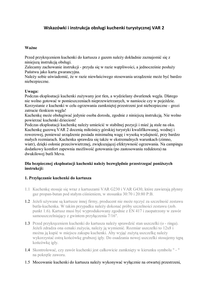 Wskazówki i instrukcja obsługi kuchenki turystycznej VAR 2 Ważne Przed przykręceniem kuchenki do kartusza z gazem należy dokładnie zaznajomić się z niniejszą instrukcją obsługi. Zalecamy zachowanie instrukcji - przyda się w razie wątpliwości, a jednocześnie posłuży Państwu jako karta gwarancyjna. Należy sobie uświadomić, że w razie niewłaściwego stosowania urządzenie może być bardzo niebezpieczne. Uwaga: Podczas eksploatacji kuchenki zużywany jest tlen, a wydzielany dwutlenek węgla. Dlatego nie wolno gotować w pomieszczeniach nieprzewietrzanych, w namiocie czy w pojeździe. Korzystanie z kuchenki w celu ogrzewania zamkniętej przestrzeni jest niebezpieczne - grozi zatrucie tlenkiem węgla! Kuchenkę może obsługiwać jedynie osoba dorosła, zgodnie z niniejszą instrukcją. Nie wolno powierzać kuchenki dzieciom! Podczas eksploatacji kuchenkę należy umieścić w stabilnej pozycji i mieć ją stale na oku. Kuchenkę gazową VAR 2 docenią miłośnicy górskiej turystyki kwalifikowanej, wodnej i rowerowej, ponieważ urządzenie posiada minimalną wagę i wysoką wydajność, przy bardzo małych rozmiarach. Kuchenka sprawdza się także w ekstremalnych warunkach (zimno, wiatr), dzięki osłonie przeciwwietrznej, zwiększającej efektywność ogrzewania. Na campingu dodatkowy komfort zapewnia możliwość gotowania (po zastosowaniu reduktora) na dwukilowej butli Meva. Dla bezpiecznej eksploatacji kuchenki należy bezwględnie przestrzegać poniższych instrukcji: 1. Przyłączanie kuchenki do kartusza 1.1 Kuchenkę stosuje się wraz z kartuszami VAR G230 i VAR G430, które zawierają płynny gaz propan-butan pod stałym ciśnieniem, w stosunku 30:70 i 20:80 P:B. 1.2 Jeżeli używane są kartusze innej firmy, producent nie może ręczyć za szczelność zestawu butla-kuchenka. W takim przypadku należy dokonać próby szczelności zestawu (zob. punkt 1.6). Kartusz musi być wyprodukowany zgodnie z EN 417 i zaopatrzony w zawór samouszczelniający z gwintem przyłączenia 7/16". 1.3 Przed przykręceniem kuchenki do kartusza należy sprawdzić stan uszczelki (o - ringa). Jeżeli zdradza ona oznaki zużycia, należy ją wymienić. Rozmiar uszczelki to 12x8 i można ją kupić w miejscu zakupu kuchenki. Aby wyjąć zużytą uszczelkę należy wykorzystać ostrą końcówkę grubszej igły. Do osadzania nowej uszczelki stosujemy tępą końcówkę igły. 1.4 Skontrolować, czy zawór kuchenki jest całkowicie zamknięty w kierunku symbolu " - " na pokrętle zaworu. 1.5 Mocowanie kuchenki do kartusza należy wykonywać wyłącznie na otwartej przestrzeni, poza zasięgiem innych osób i jakiegokolwiek źródła ognia, tzn. otwartego płomienia, wyładowań elektrycznych itd. 1.6 Po połączeniu kuchenki z kartuszem należy upewnić się co do szczelności takiego zestawu. Można posmarować łącze roztworem mydła, powąchać, posłuchać, czy nie uchodzi gaz . nigdy nie stosować ognia! Czynności te wykonać poza pomieszczeniem. Nieszczelny zestaw należy natychmiast rozmontować - z dala od wszelkich źródeł otwartego ognia. Kuchenkę i kartusz bezzwłocznie przesłać do producenta. 1.7 Podane wyżej zalecenia obowiązują w procedurze wymiany kartuszy - z pustego na pełny. 1.8 Kuchenka i kartusz zaopatrzone są w prawy gwint. Przy wkręcaniu kuchenki do kartusza należy uważać, by nie "przekręcić" lub nie uszkodzić gwintu. Podczas pierwszego dokręcania kuchenki opór gwintu jest nieco większy niż podczas ponownego użycia. Gwint jest "pasowny" i pierwsze dokręcanie kalibruje go. Aby kalibracja przebiegła pomyślnie gwint pokryto warstewką wazeliny, której nie należy usuwać! 1.9 Podczas wkręcania kuchenki na kartusz słychać przez chwilę syk gazu, co wynika z odblokowania zaworu dla swobodnego przepływu gazu z kartusza do palnika. Jest to zjawisko normalne - dalszy obrót uszczelnia łącze. Nie należy więc próbować nerwowego i siłowego dokręcania, które może doprowadzić do zniszczenia uszczelki, a nawet gwintu! Stosowanie się do tych zaleceń zapewni gwarantowany "czas życia" = 1000 połączeń palnika z kartuszem. Sporadyczne pokrywanie gwintu wazeliną również znacząco przedłuża trwałość kuchenki. 2. Zapalanie i eksploatacja 2.1. Kuchenkę z kartuszem należy ustawić w pozycji pionowej. Podpórki pod menażki rozłożyć i zastabilizować w gniazdach. Lekko odkręcić zawór (w lewo w stronę znaku "+") i zapalić płomień. Podczas zapalania nie należy otwierać zaworu na "pełny regulator". 2.2 Jeżeli kartusz przez dłuższy czas znajdował się w niskich temperaturach i nie był używany, przed użyciem należy nim mocno wstrząsnąć lub od razu osłonić płomień menażką. Wtedy palnik "nie przerywa". 2.3 Jeśli zakładamy pełny i nagrzany kartusz - zawór należy odkręcać minimalnie; w przeciwnym wypadku uzyskamy niekontrolowany wybuch płomienia. Podobne zjawisko może mieć miejsce, kiedy kuchenka będzie mocno pochylona. 2.4 Nie dopuszczać do wygotowania się płynu w menażce - grozi uszkodzeniem zarówno naczynia jak i kuchenki. 2.5 W czasie gotowania kuchenkę należy cały czas obserwować. 2.6 Gotując zachować bezpieczną odległość od materiałów łatwopalnych - min. 0,5 m. 2.7 Nie kłaść materiałów łatwopalnych bezpośrednio na kuchenkę. 2.8 W razie jakichkolwiek wątpliwości należy skontaktować się z producentem. 3. Koniec gotowania 3.1 Po zakończeniu gotowania zakręcić zawór w prawo w kierunku znaku "-" i zaczekać, aż płomień zgaśnie. 3.2 Kartusz można odkręcić po ostygnięciu kuchenki. 3.3 Nigdy nie odkręcać kuchenki od kartusza podczas eksploatacji!! 3.4 Po demontażu kuchenki złożyć podpórki pod naczynie. 3.5 Kuchenkę trzeba zawsze odkręcić od kartusza. Zapobiega to opróżnieniu kartusza (niedokręcony zawór, nieszczelność spowodowana zabrudzonym gwintem). Dbać o czystość kuchenki! 4. Stany awaryjne 4.1 Jeżeli płomień pojawi się poza czynną cz